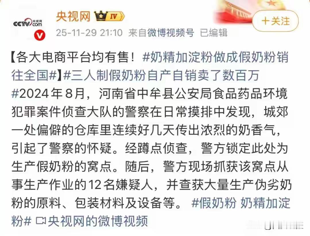 “假奶粉 奶粉精加淀粉”冲上热搜,引发网友愤怒。很多电商平台售卖的所谓国外进口奶制品,实则产自河南中牟一出租房。这些假奶粉由植脂末、麦芽糊精和固体饮料混合,蛋白质等营养成分几乎为零。 评论: 平台应该负有部分责任。电商平台具有商业销售的海量基础数据,不能只投喂销售AI,也应该建立诚信监督AI,通过价格,投诉,物流,检验,产地等信息对诚信经营进行分析预警。现在那个打分制不具有可信任度。 请大家互相转告我的亲身经历,抖音上卖鲜猪肉的直播间是临沂的跑山黑土猪,看着新鲜我就下单了,结果猪是浙江养的,而发货地是河北,并且是冷冻肉,且有黑斑,说明肉冷冻了很久!我在它的直播间投诉它立马把我踢出来,请大家不要上当! 我做过母婴店,有业务员推销50块的奶粉,市场价328.什么品牌我就不说了,反正价格很美,我不能昧良心,觉得水太深,于是,保本把母婴店转了, 制造者判刑10年,罚款5000万,平台罚款10个亿,带货的罚款1个亿。大家觉得怎么样。如果可以顶我上去。咱们让他上热门。 彻底销毁原材料,没收全部违法所得,三个老板各罚5千万,判刑20年,电商平台罚款3亿元。你看以后还有人敢干吗? 电商平台不能光收钱而不负任何责任。任何人去平台卖货应有俩份营业执照,其一是电商人当时办的执照,其二是平台的执照。平台必须同当地工商协作打假。