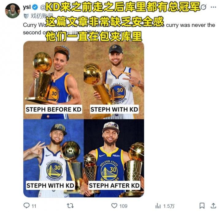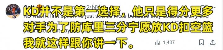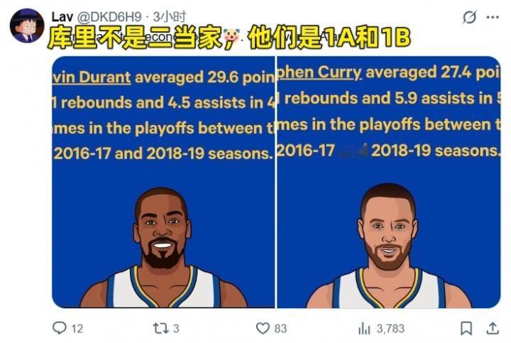 库里是二当家?美国网友怒喷媒体《露天看台》: BR(露天看台)评选了NBA历史各队最强二当家,在勇士队,杜兰特成了大当家,而库里被评为二当家。 这个选择确实有很大的争议。 勇士在科尔的带领下,建队的原则和逻辑,都是基于库里的跑动和投射能力,没有库里,这套体系就不存在了。 在杜兰特来之前,勇士已经是成熟的冠军球队了,杜兰特只是给这套阵容上,加了一把更锋利的箭头,他的得分能力几乎无解,让勇士的进攻更加如鱼得水。 但了解杜兰特的球迷会知道,一旦他的身边没有一个优质的控卫,那杜兰特会打的比较挣扎。有库里在,有勇士的体系在,杜兰特才能在大量的回合里执行单打,而不用操心球队的其他事情。 杜兰特可以得分更高,可以发挥更亮眼,可以拿FMVP,可以在一对一的对比中击败库里,但勇士队的灵魂就是库里,在他退役之前,大当家就不可能是别人。