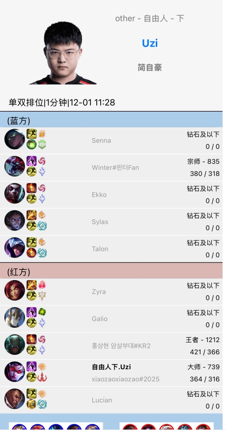 直播吧12月1日讯根据排位统计小程序显示,在12月25日之后Uzi连续五天未登上韩服账号,今日Uzi再次上号用卢锡安赢下对局后,又开了一把薇恩!