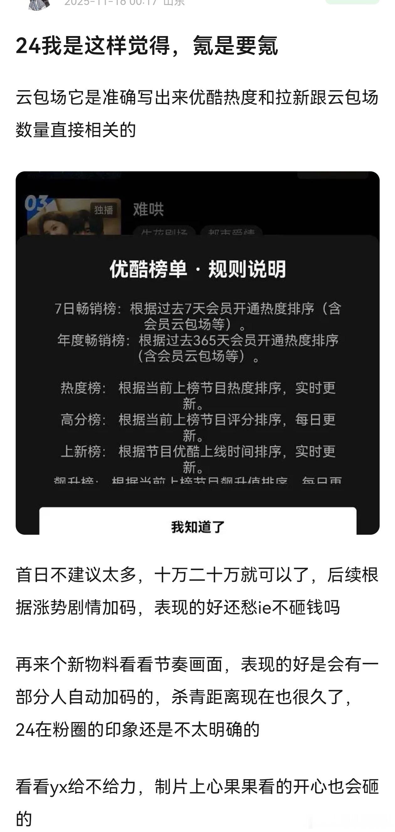 裤子赤裸裸说云包场对平台热度有帮助,这不就是催氪吗?一个愿打,一个愿挨。其实云包场本来是一个“扶上马,送一程”的工具,有些粉圈把它当做救命稻草,味道就变了。