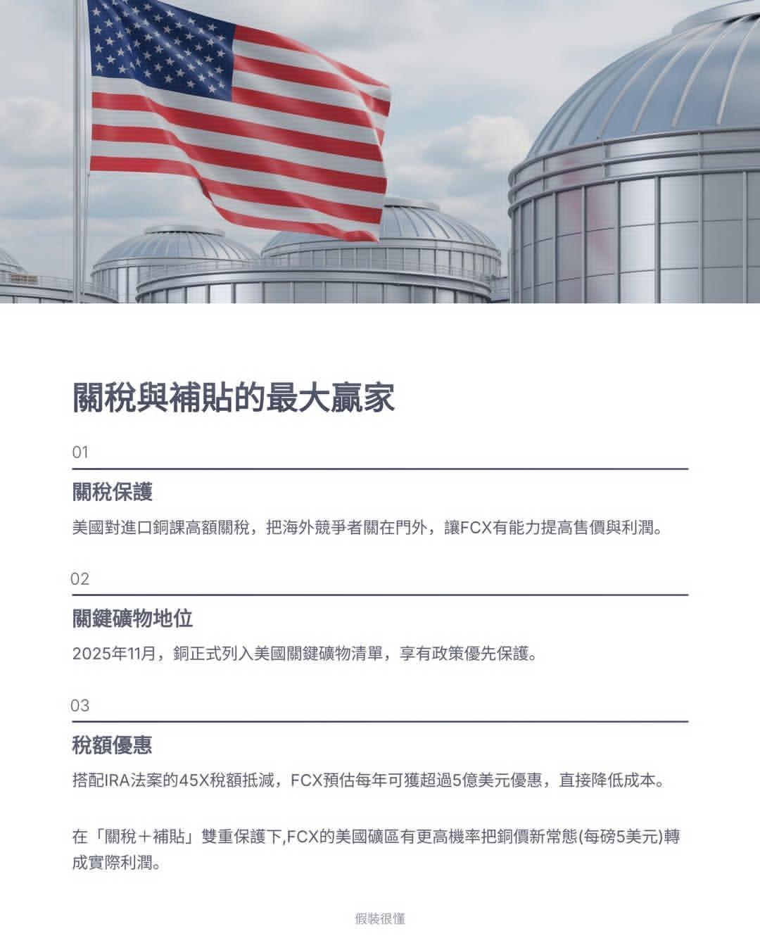 AI、电网与绿能背后的大老板 - 铜矿:FCX站在全球缺铜潮核心 若AI、电网升级与绿能转型是未来十年的核心赛道,那么作为“电气化之母”的铜,才是这场产业变革中真正的关键玩家。而Freeport-McMoRan(股票代码FCX),正精准卡位这场全球缺铜剧本的中心。 作为美国本土最大的铜矿商,FCX手握北美优质矿产资产,旗下莫伦西等矿山具备稳定产能,更直接受益于美国将铜列入关键矿物清单的政策红利——不仅能获得联邦资金支持、简化项目审批,还能享受半成品铜50%进口关税的市场保护 。与此同时,它还持有印尼超级铜矿Grasberg 48.76%的股权,这座铜储量超2700万吨的高品位矿山,是全球铜供应的重要支柱 。 尽管Grasberg矿山面临印尼政府的股权争夺与政策变动,一度因安全事故停产引发铜价异动,但在全球绿能、电网基建对铜需求持续激增的背景下,其战略价值愈发凸显 。一边是本土政策护航的稳定基本盘,一边是高潜力海外资产的地缘博弈,FCX凭借独特的资源布局,成为兼具政策红利与稀缺资产的“AI+电网基建铜股”标杆,在全球铜供需紧平衡的格局中占据核心优势。AI电力瓶颈 锡钴铜产业链 ai矿企 绿铜锌矿 agn金属系统 AI矿业 金属fdm