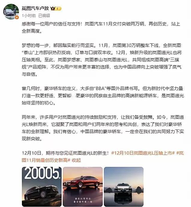 岚图11月销量20005辆,猛士科技11月销量2007辆,风行11月销量1019