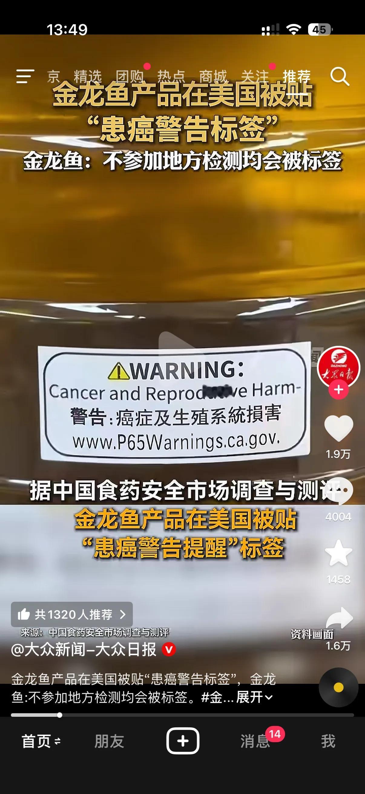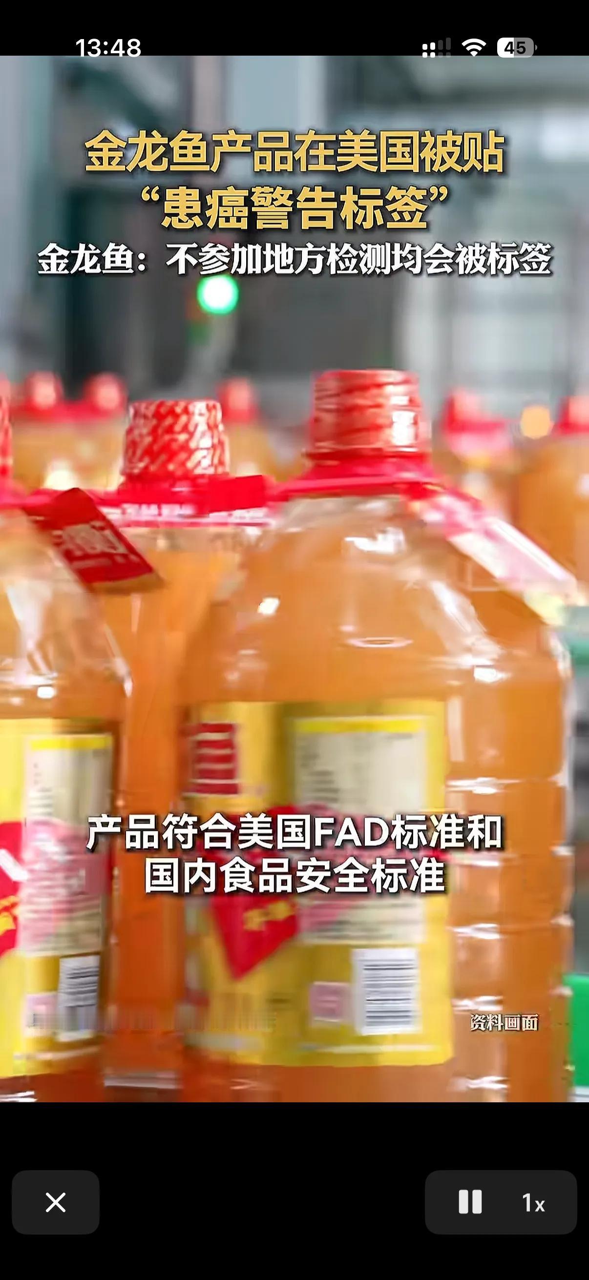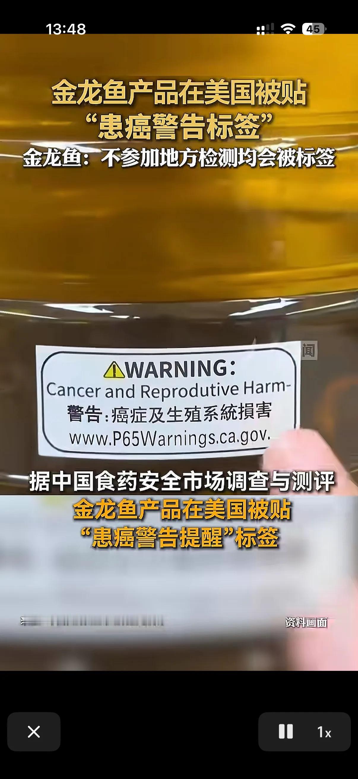 金龙鱼在美国被贴上了患癌警告标签? 近日有网友晒出在美国销售的金龙鱼油被贴上了癌症及生殖系统损害的标签,该视频在网上传播后,引发了国内消费者的恐慌,要知道金龙鱼可是国内食用油比较大的生产和经销商,可以说是很多家庭都会选择金龙鱼食用油! 对此金龙鱼给出了详细的回答,原来这个警告标签是金龙鱼集团自己主动贴上去的! 因为金龙鱼在美国销售的食用油是符合美国fad标准和国内食品安全标准的! 之所以主动贴上这个标签,完全是因为金龙鱼没有参加地方检测都会贴上这个标签! 而且这个标签并不是全美的金龙鱼油都会贴! 也只是在美国的加利福尼亚州销售的金龙鱼油才会贴! 希望大家不传谣不信谣!