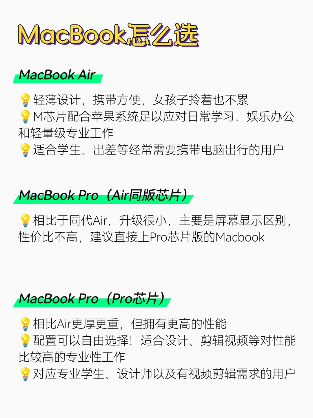 🧐自M1芯片开始,每一代MacBook分4个系列产品:Air、Pro(同Air芯片)、Pro(Pro芯片)、Max;除Pro(同Air芯片)是固定核心无选配以外,其他版本都可选配不同核心数的M系列芯片,宝子们选购时需注意✅