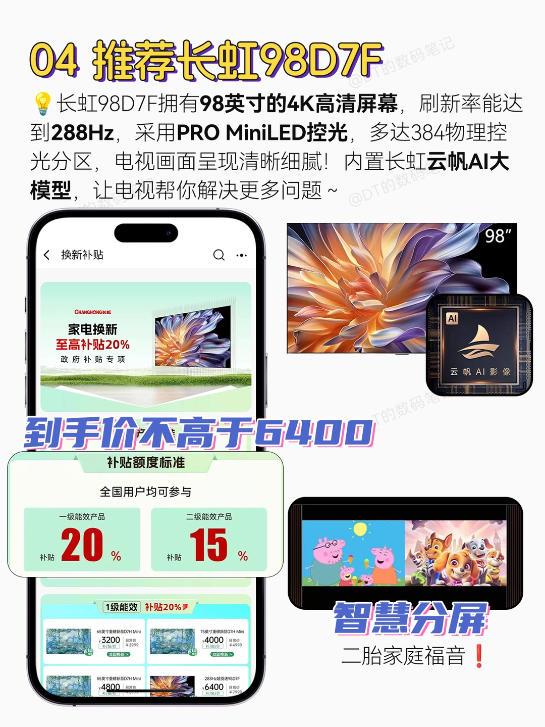 [赞R]像长虹98D7F这款98英寸刷新率能达到288Hz的4K高清电视,一级能效,在国补清单中可以补贴20%!