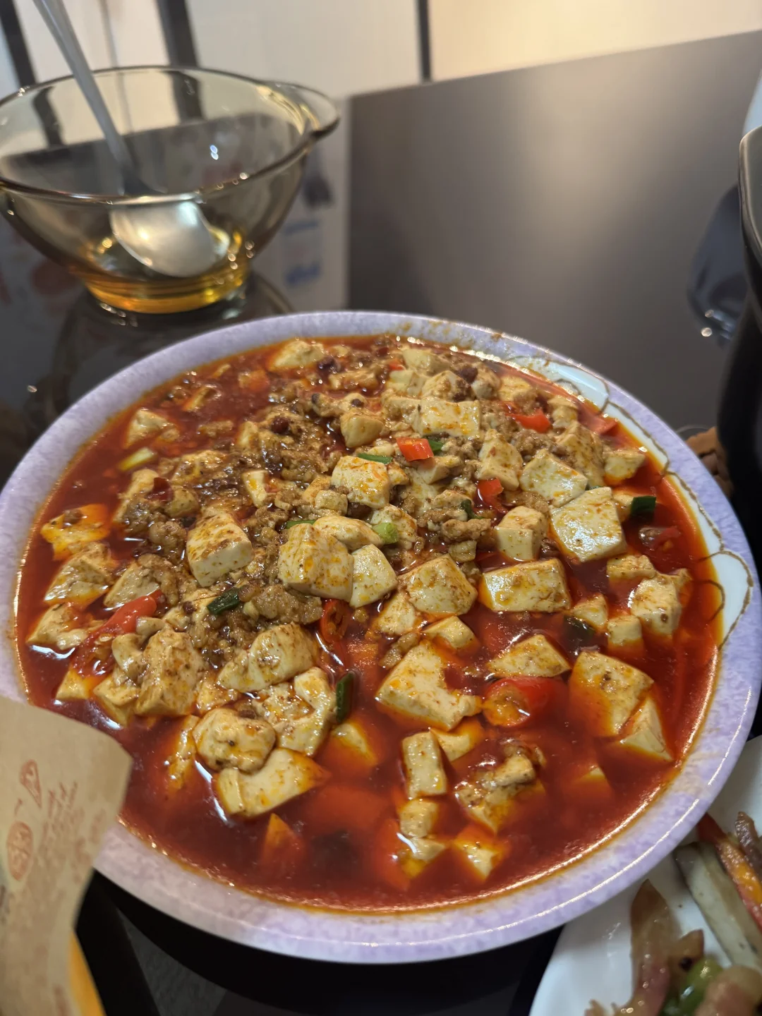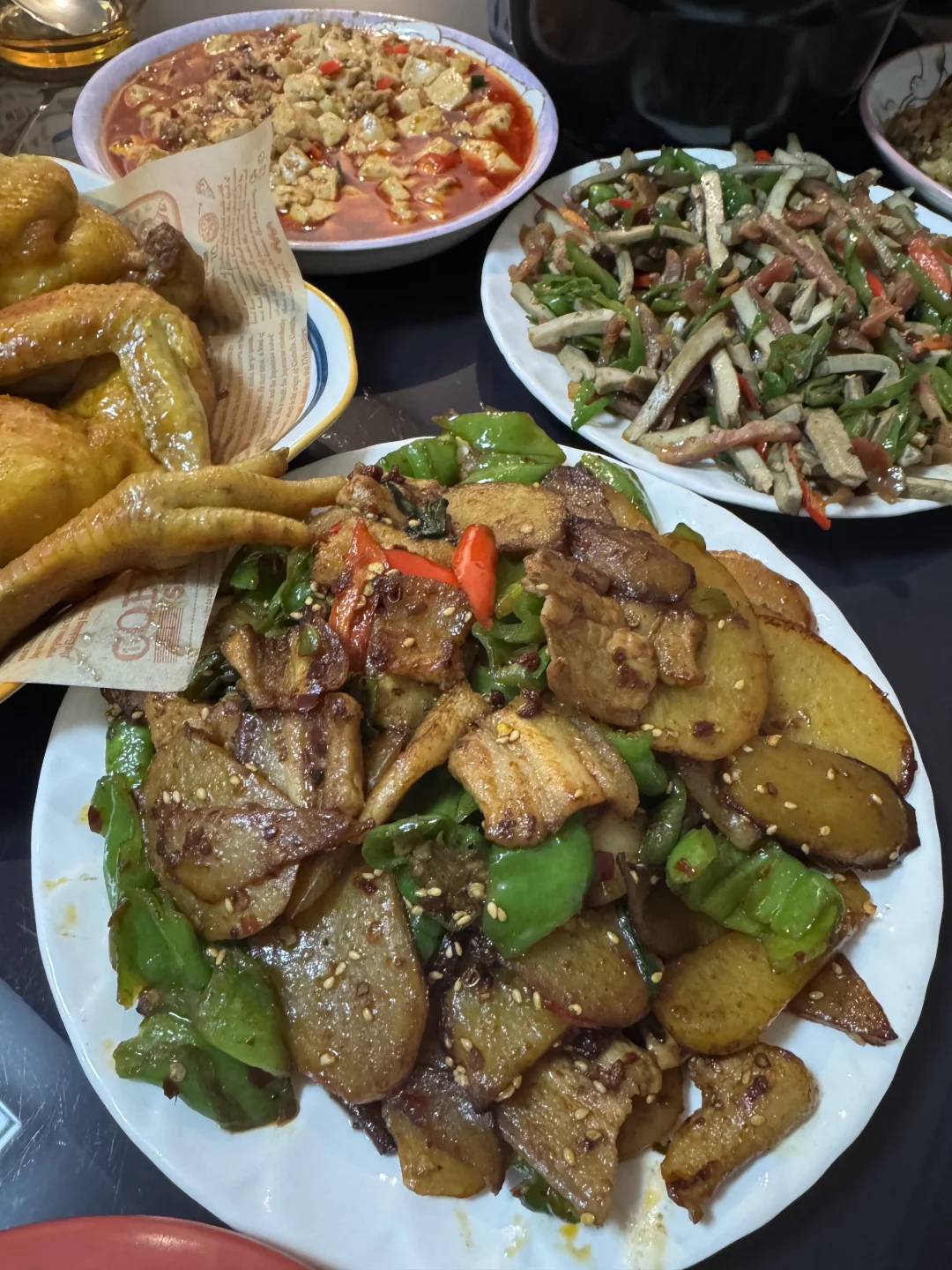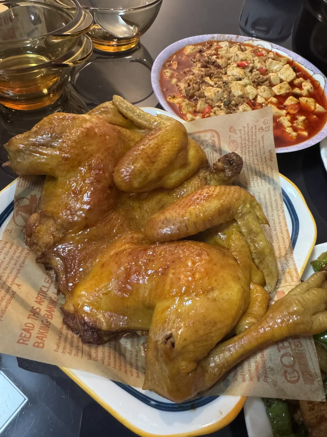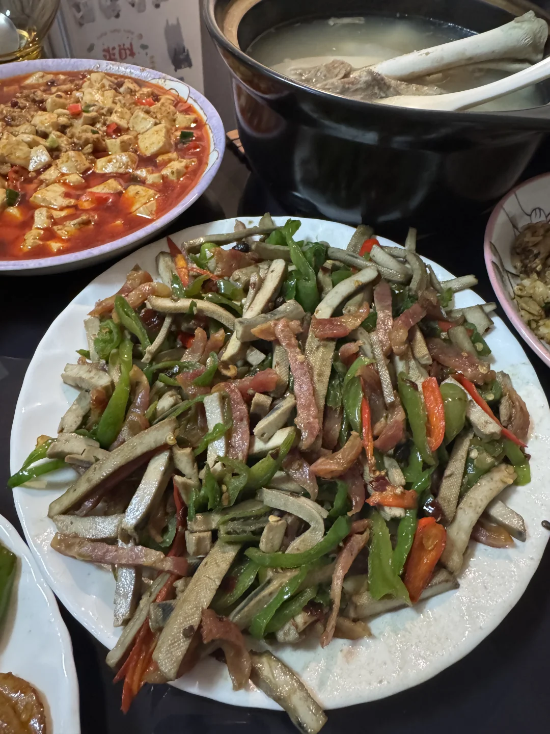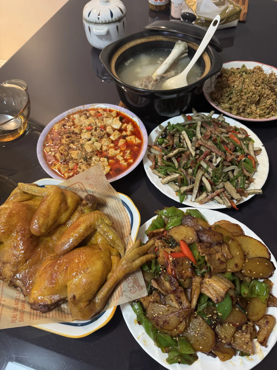 烤了一只鸡,干锅土豆,麻婆豆腐,香肠炒臭干,羊腿萝卜汤,晚餐感觉需要5个人来消灭[笑哭R]