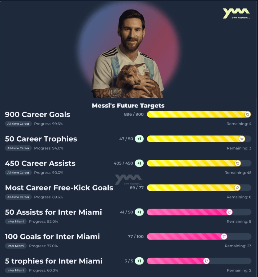加盟两年半以来梅西带领倒数第二的迈阿密国际夺得两个冠军,打进77球41次助攻,个人造球118次。