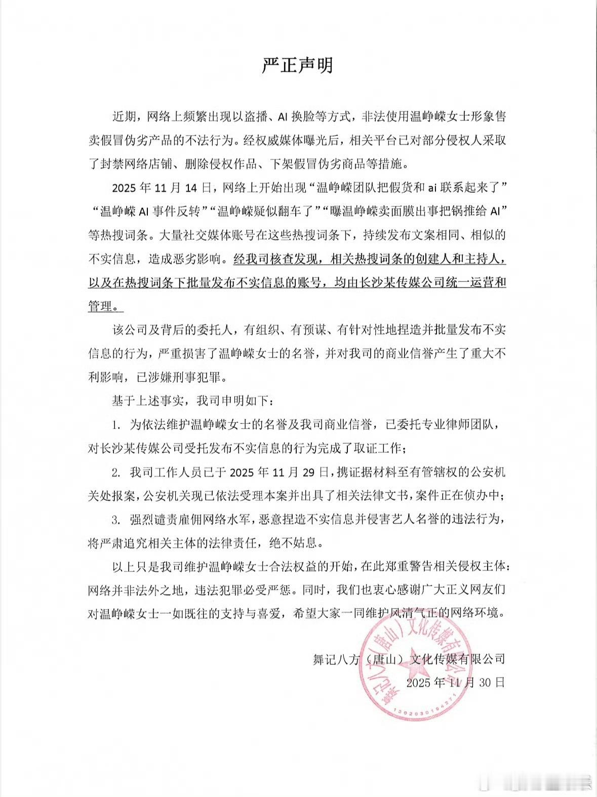 温峥嵘方已报案温峥嵘方发布声明 近日,网传“温峥嵘AI事件反转”“温峥嵘卖面膜出事把锅推给AI”等引发讨论。今日,晒出受案回执和声明,表示已报警立案。声明中称,“相关AI词条均为不实信息,且发布不实信息的账号均由同一公司运营和管理,已完成取证工作,将严肃追究相关人员法律责任。”