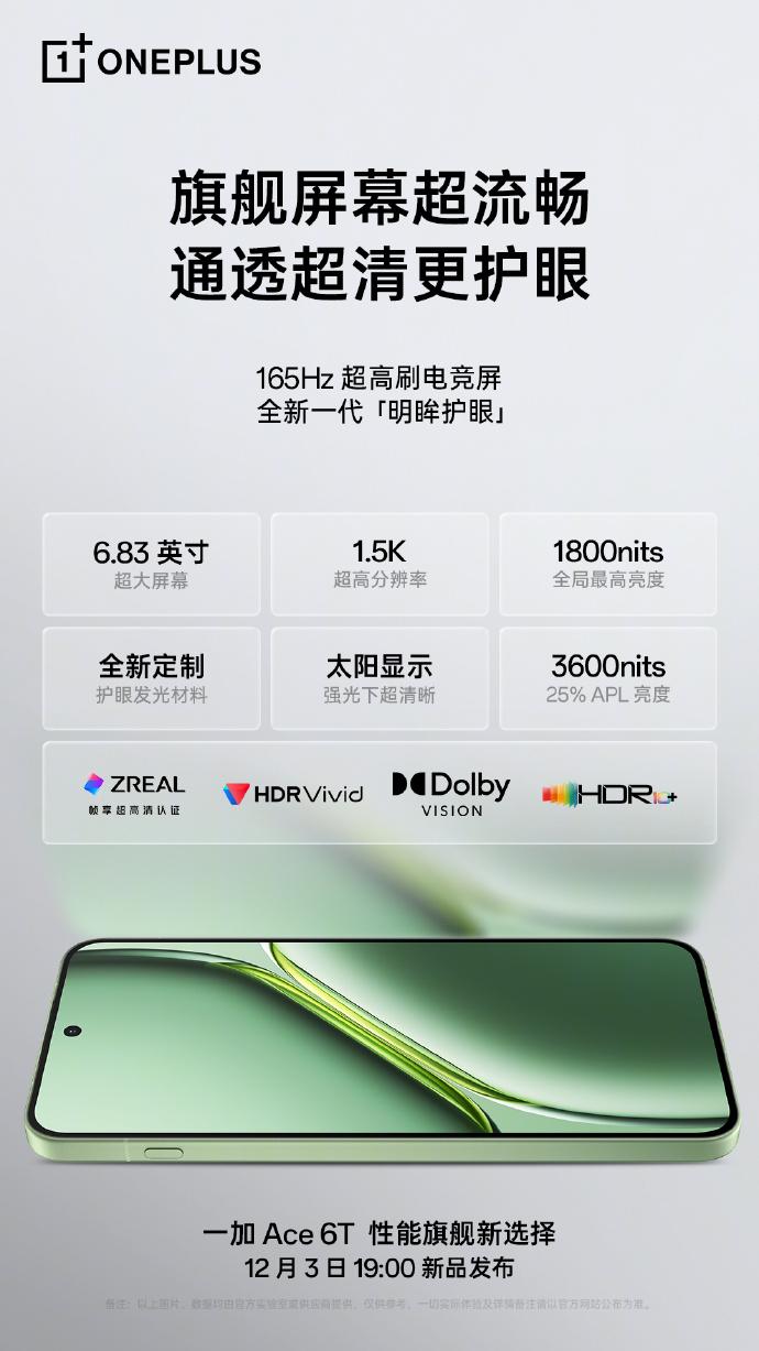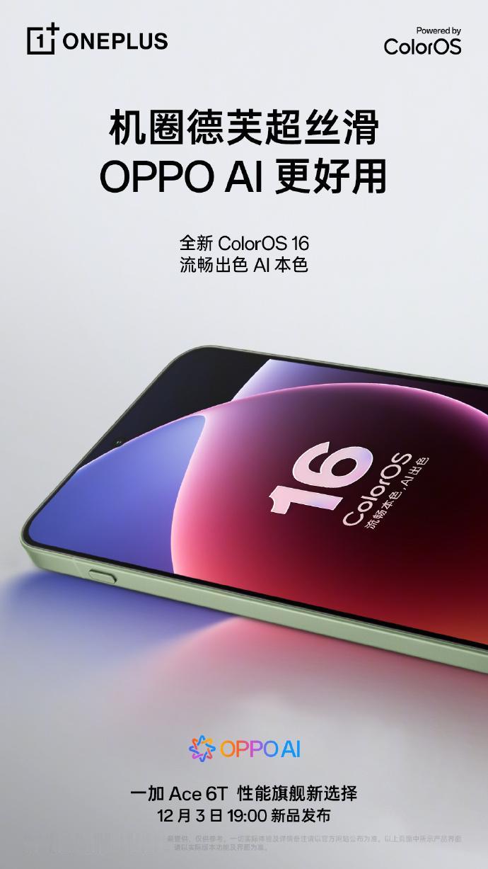 【科技快报网】一加手机官方今日继续预热Ace 6T 新机,官宣,Ace 6T 新机搭载 5000 万索尼超光影大底主摄、1.5K 165Hz 超高刷电竞屏、预装全新「机圈德芙」ColorOS 16系统。