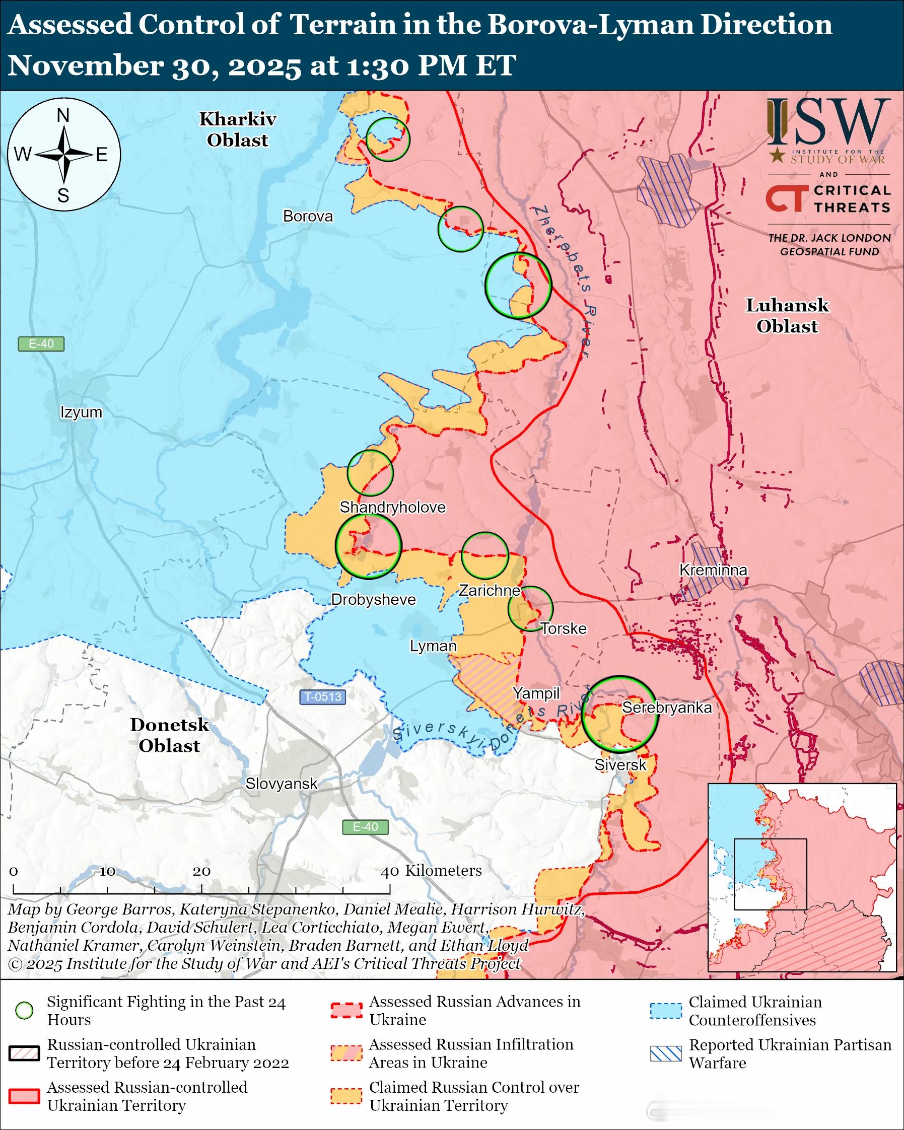 俄军主要行动2俄军目标:占领卢甘斯克州剩余部分,向西推进至哈尔科夫州东部,并包围顿涅茨克州北部。11月30日俄军继续向库皮扬斯克方向发起进攻,但并未取得确切进展。未经证实的说法:俄罗斯军事博客作者声称,俄军沿着 P-07 库皮扬斯克-舍甫琴科韦公路向北推进,到达皮什恰内以北、斯捷波瓦-新谢利夫卡以西和以北、以及赫卢什基夫卡以东南(均位于库皮扬斯克东南)。11月29日和30日,俄军在库皮扬斯克北部的库特基夫卡附近、库皮扬斯克东部的彼得罗巴甫洛夫卡附近以及库皮扬斯克东南部的皮什恰内和格卢什基夫卡附近发动进攻。一位俄罗斯军事博主声称,乌克兰军队在库皮扬斯克进行了反击。战斗序列:据报道俄第 68 摩步师(列宁格勒军区第 6 合成集团军)的无人机操作员正在库皮扬斯克郊区袭击乌克兰军队。11月30日俄军继续向博罗瓦方向发起进攻,但并未取得进展。俄军攻击了新克鲁利亚基夫卡附近的博罗瓦以北并向新普拉托夫卡进发;博罗瓦 (Borova) 东北部,靠近科利斯尼基夫卡 (Kolisnykivka);博罗瓦以东,靠近科潘基;博罗瓦东南部靠近 Novoyehorivka、Novodyane 和 Tverdokhlibove 以及 Stepove 和 Cherneshchyna 方向。11月30日俄军继续向莱曼方向发起进攻,但并未取得进展。11 月 29 日至 30 日,俄军在莱曼西北部的卡尔皮夫卡、科罗维亚尔、谢列德涅、新谢利夫卡和德里洛韦附近,在莱曼东北部的科洛迪亚齐附近,在莱曼东部的扎里奇涅和托尔斯克附近,以及在莱曼东南部的扬皮尔附近发动进攻。作战序列:据报道俄第16特种部队旅(俄罗斯总参谋部情报总局[GRU])正在莱曼方向作战。第27辐射、化学和生物防御旅(莫斯科军区[MMD])无人机连的(FPV)无人机操作员正在莱曼附近打击乌克兰军队。