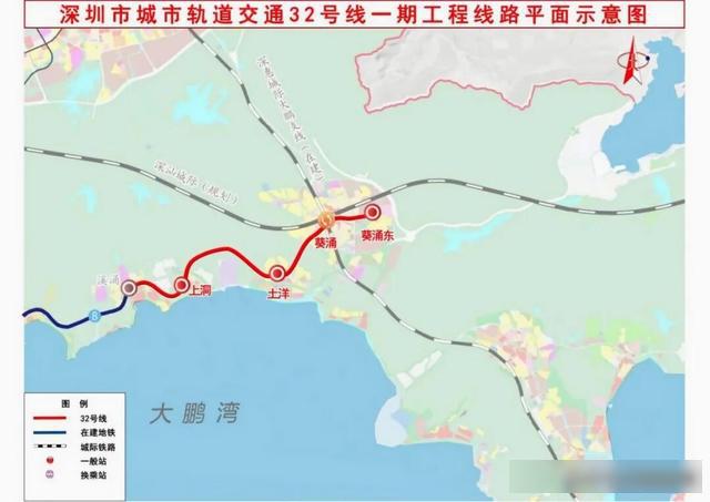据悉,深圳地铁32号线一期设有上洞站、土洋站、葵涌站、葵涌东站4座车站。其中,葵涌站与深惠城际大鹏支线葵涌站形成T型换乘。