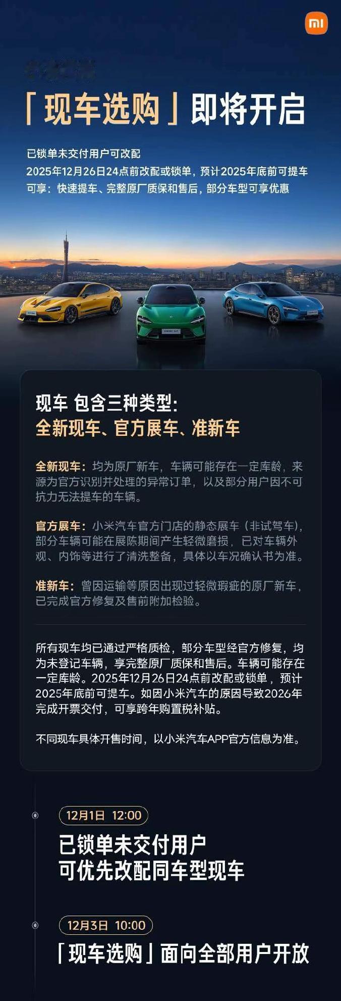 想购买小米汽车的有福了!小米还有大量的现车可以售卖,年底就可提车! 这些车辆分为三个类型,全新现车、官方展车和准新车,全新现车是因为不可抗拒原因,比如说消费者没有提车多余下来的车辆。官方展车就好理解了,就是官方的展示用车,用于在各销售门店展示的车辆。准新车就是各种出现瑕疵,经过官方修复的车辆。 可以购买的范围就是那些已经下单过小米汽车,而且配置也相同的消费者,可以优先进行购买。 12月3日将全方面开放给所有用户购买,也就是说之前没有下单过小米新车的人,也可以直接购买。 各位是怎么看的?欢迎评论区留言。