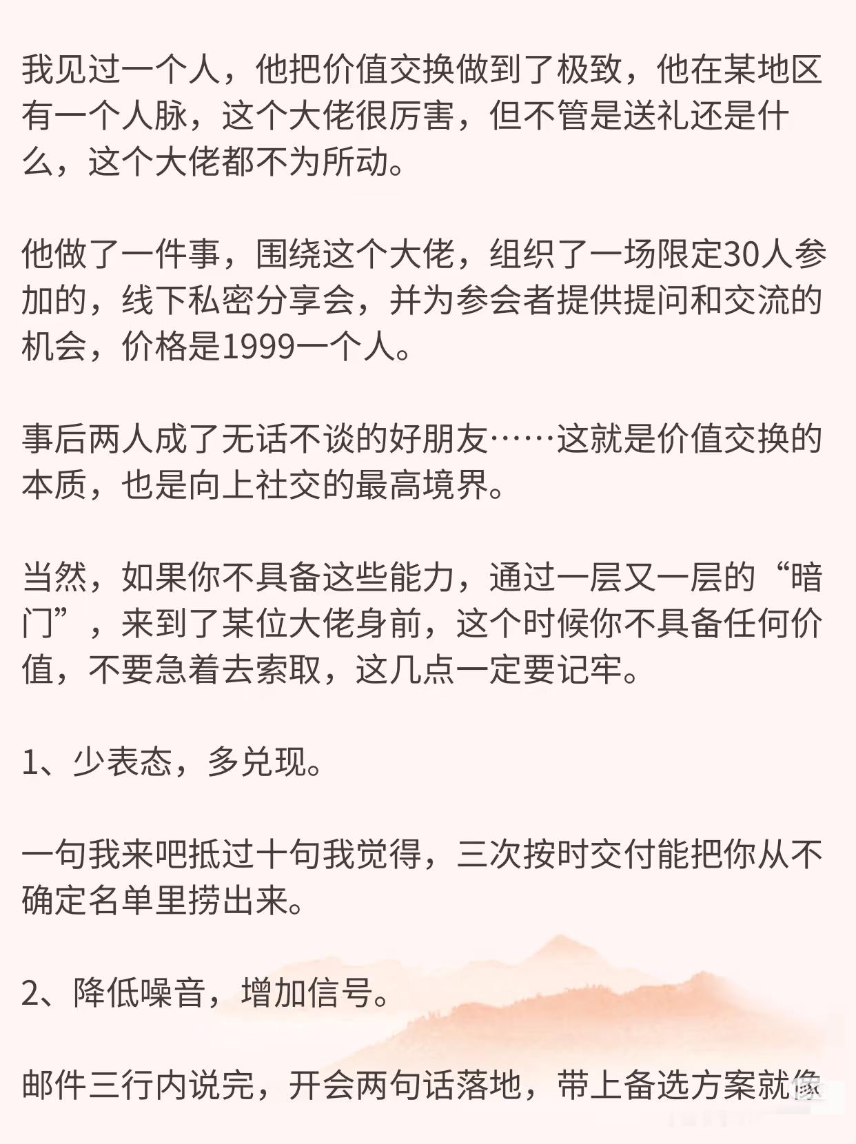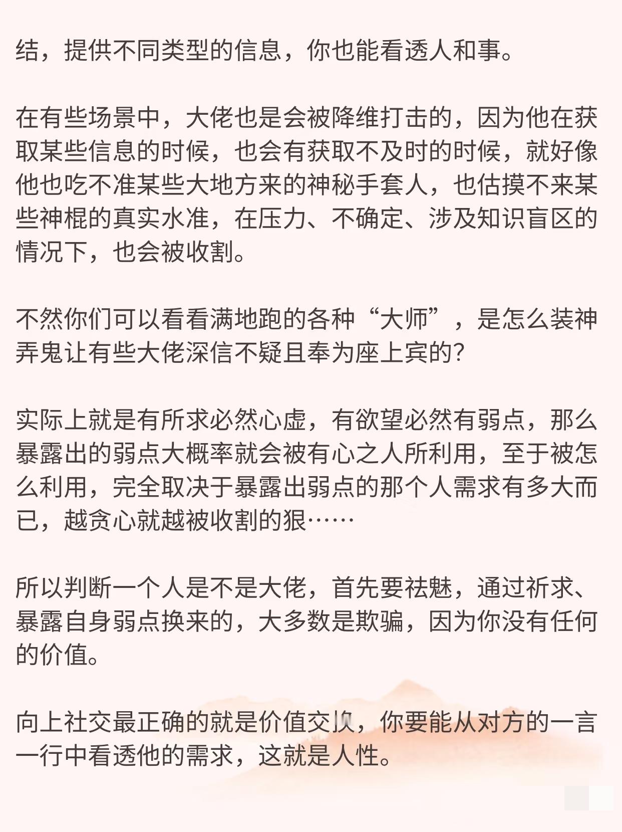 为什么大佬一般看人很准?藏在阅历与认知里的识人智慧 在商业谈判、团队组建或人脉交往中,总有一种人能快速看透人心——他们就是大家口中的“大佬”。无论是选拔核心人才,还是结交合作伙伴,他们往往一眼就能抓住关键,做出精准判断。很多人觉得这是天生的“第六感”,但其实大佬的识人眼光,从不是凭空而来的直觉,而是长期在实战中沉淀的经验、系统化的认知逻辑,以及对人性底层规律的深刻洞察。这种精准识人能力,早已成为他们驾驭复杂局面、规避潜在风险的核心竞争力。 大佬看人准,首先源于海量样本的阅历沉淀。识人本质上是一种“概率游戏”,见过的人越多,对不同性格、品行、能力的人就越有清晰认知,自然能快速归类判断。大佬们常年身处社交和商业的核心场景,接触的人涵盖了各行各业、不同阶层——有商场上的竞争对手,有并肩作战的伙伴,有需要培养的下属,也有深藏不露的高手。 这些丰富的经历,让他们积累了庞大的“识人数据库”。比如在招聘时,他们能从求职者的言谈举止中,分辨出哪些人是真有能力,哪些人只是纸上谈兵;在合作谈判中,能通过对方的细节反应,判断其是否真诚,有没有隐藏的风险。一位创业多年的老板曾说:“我见过太多表面热情的背叛者,也见过不少沉默寡言的实干家,这些经历让我明白,一个人的真实品性,往往藏在不起眼的细节里。” 海量样本带来的不仅是经验,更是对人性多样性的包容与洞察,让他们不会被单一标签误导,而是能立体地看待一个人。 系统化的底层逻辑思维,让大佬们避开表面现象,直抵人心本质。普通人看人,容易被颜值、言辞、身份等外在标签迷惑,而大佬们则擅长用底层逻辑拆解一个人的核心特质。他们关注的不是“这个人说了什么”,而是“他为什么这么说”;不是“他做过什么”,而是“他做事的动机和思维方式”。 这种逻辑思维体现在三个维度:一是看价值观,判断对方的底线和追求,比如面对利益诱惑时的选择,就能看出其是否坚守原则;二是看能力闭环,关注对方能否把想法落地,从计划、执行到复盘,每一步都能体现真实能力;三是看情绪稳定性,观察对方在顺境和逆境中的表现,情绪失控的人往往难以承担重任。大佬们会将这三个维度串联起来,形成一套自己的识人框架,无论遇到什么样的人,都能快速代入分析,做出精准判断。这种基于逻辑的识人方式,远比依赖感觉可靠得多。 大佬看人准,离不开对细节的极致敏感。人性的真实往往藏在言语和行为的缝隙里,那些被普通人忽略的小细节,正是大佬们判断的关键依据。一个人的眼神、坐姿、语速、用词习惯,甚至是对待服务人员的态度,都能暴露其真实品性。 比如,面试时频繁打断他人说话的人,往往自我中心;承诺时毫不犹豫,却迟迟没有行动的人,大概率缺乏责任感;对待下属和颜悦色,对待保洁人员却颐指气使的人,人品往往经不起推敲。大佬们常年在复杂的环境中摸爬滚打,养成了敏锐的观察力,他们能从这些细微之处,拼凑出一个人的完整画像。就像一位投资大佬所说:“我投资一个项目,首先看创始人,他递名片的姿势、说话的语气、对团队的态度,都在告诉我他能不能成。” 细节不会说谎,这种对细节的极致捕捉,让大佬们避开了很多“伪装者”。 反向筛选的止损经验,让大佬们的识人眼光越来越精准。没有人天生就会看人,大佬们也经历过看错人、吃过亏的阶段。但他们与普通人的区别在于,能从错误中复盘总结,形成“反向筛选”的经验,避免再踩同样的坑。 长期利益视角,让大佬们能看透一个人的潜力与未来。普通人看人,大多关注眼前的能力和价值,而大佬们则更擅长用发展的眼光看待一个人。他们知道,一个人的当下表现固然重要,但未来的成长潜力更能决定长期价值。 他们会关注一个人的学习能力,看其是否有主动迭代认知的意识;关注抗压能力,看其能否在挫折中快速恢复;关注格局,看其是否能跳出个人利益,考虑长远发展。比如,很多大佬愿意给年轻人机会,不是因为他们当下有多优秀,而是看到了他们身上的潜力——强烈的求知欲、坚韧的意志力和开阔的眼界。这种着眼于长期的识人视角,让他们能发掘出很多被埋没的人才,也让他们的团队和事业保持持续的生命力。 大佬们的精准识人能力,从来不是天生的天赋,而是阅历沉淀、逻辑支撑、细节洞察、经验复盘和长期视角共同作用的结果。他们见过足够多的人,吃过足够多的亏,形成了自己的识人体系,所以才能在短时间内做出准确判断。 对于普通人来说,这种能力并非遥不可及。我们可以从积累阅历、培养逻辑思维、关注细节、复盘错误开始,慢慢打磨自己的识人眼光。毕竟,无论是职场发展、人际交往还是创业合作,看懂人心都是一项至关重要的能力。当你能精准地看透一个人的本质就能避开陷阱,结交良友,找到靠谱的伙伴,在人生的道路上走得更稳、更远。识人真谛 识人规律 看人识人思维 识人小细节 独到识人法则 领导识人术 职场看人识人 识人层次