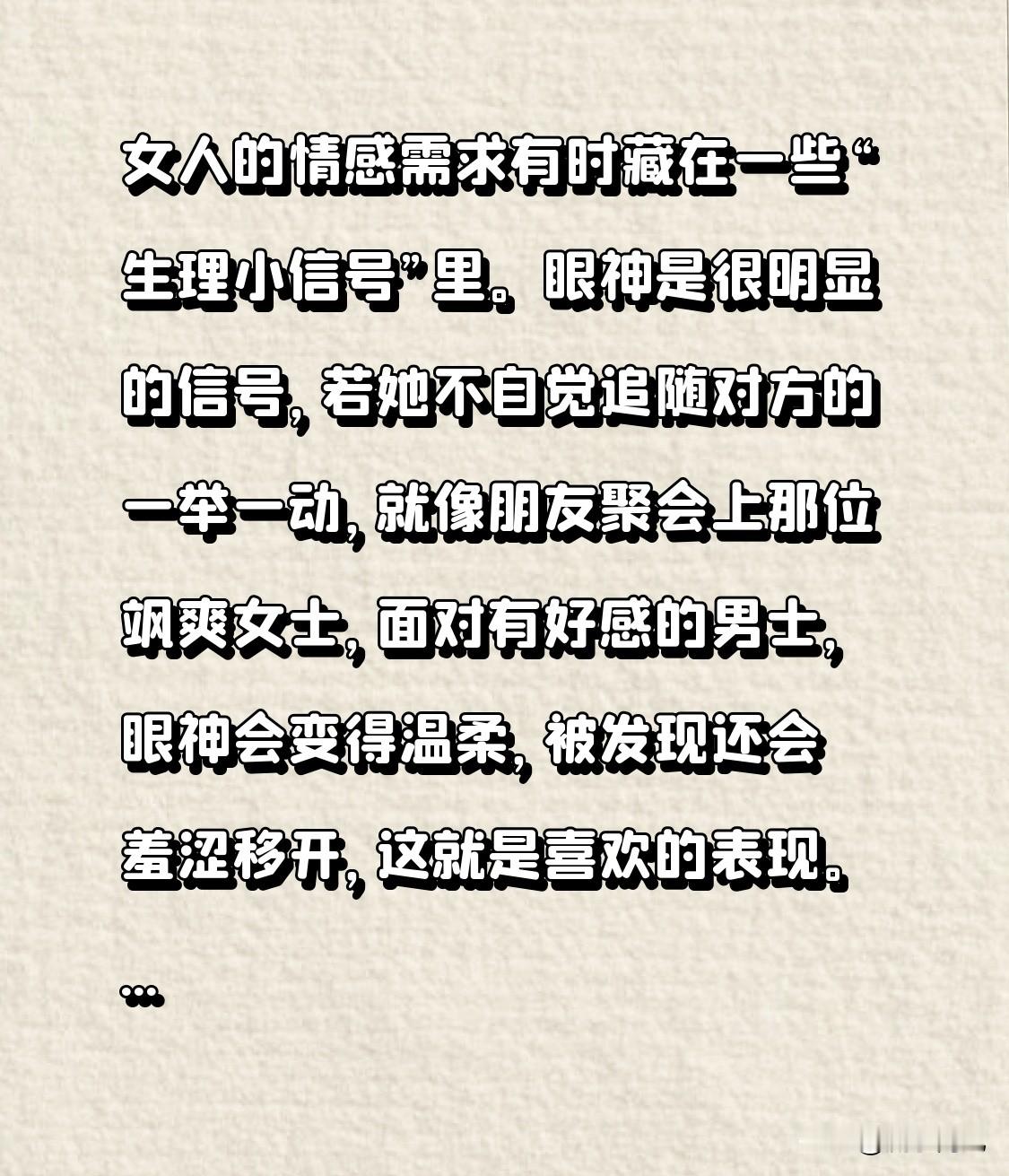 女人的情感需求有时藏在一些“生理小信号”里。眼神是很明显的信号,若她不自觉追随对方的一举一动,就像朋友聚会上那位飒爽女士,面对有好感的男士,眼神会变得温柔,被发现还会羞涩移开,这就是喜欢的表现。