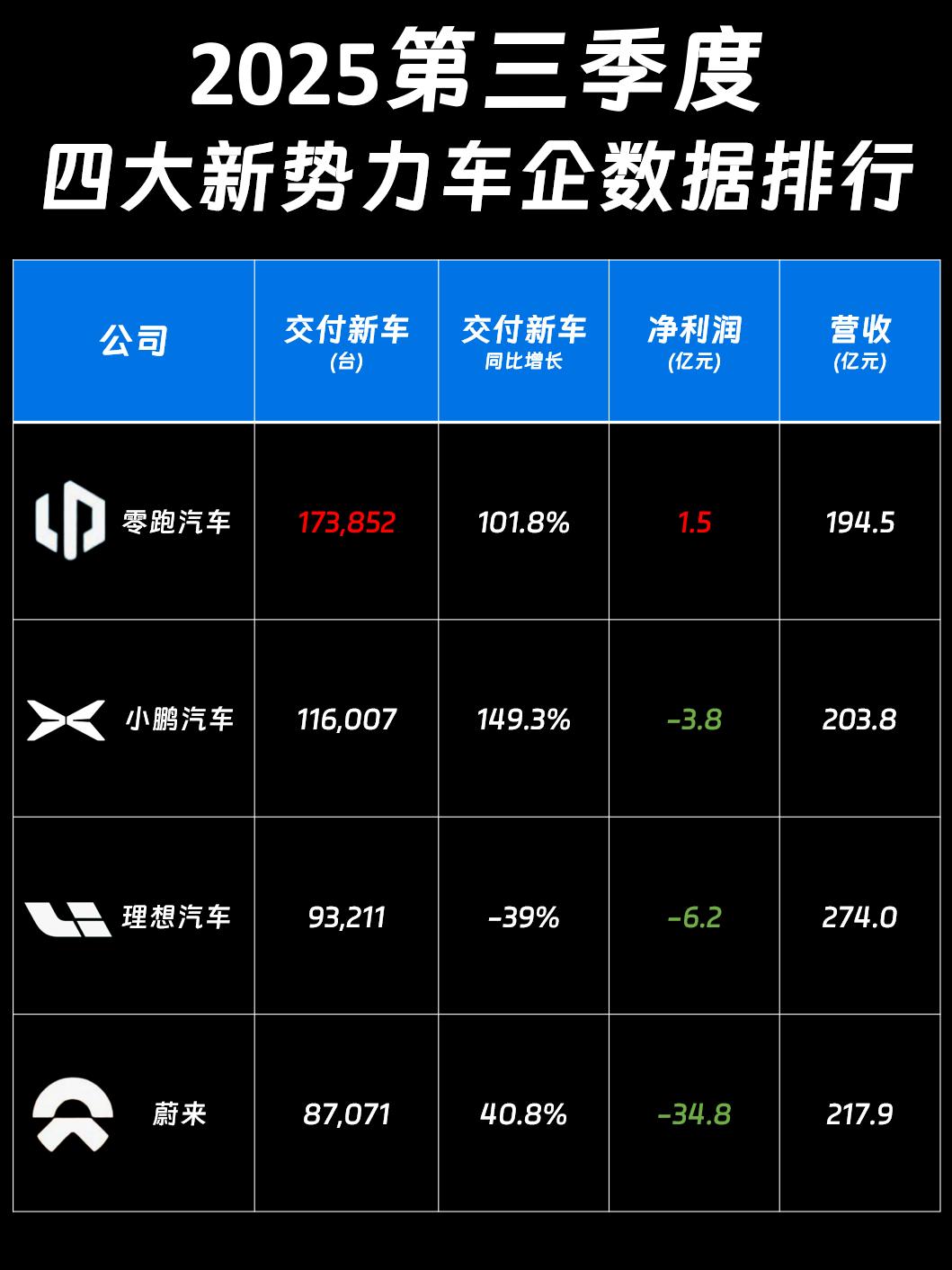 零跑11月交付70327台,年度新势力第一几乎已经锁定了。 11月刚过,零跑就发布了自家的交付量:70327台,零跑在继10月之后,又一次实现了交付超7万台。有意思的是,这其中零跑出口占了9348台,创下新高,包括它的海外订单也突破了1.5万,也是新纪录。而且它在海外表现尤其突出的两个市场分别是意大利和德国,你就说服不服吧?凭借国内国外全面爆发,截止11月底,零跑今年交付已经超过53万台,提前实现了今年的50万台年销目标,并向着年销60万台冲刺。 其实零跑今年的强势可以说从年初就显露了,然后不断刷新新势力的月交付记录,这也让零跑的财报不断创下新高。 在前段时间公布的的三季度财报中,零跑三季度的交付量(173852台)、营收(194.5亿)、净利润(1.5亿)等数据都刷新品牌历史记录,尤其是对比理想、蔚来、小鹏这这三家,零跑是其中唯一实现三季度盈利的品牌。净利润的持续为正,让零跑也进入了一个自我造血的良性发展循环。 在一系列亮眼表现的加持下,再加上零跑ABCD产品矩阵已形成,在即将迎来品牌成立十周年之际,零跑已经做好准备,加速进入下一个十年。