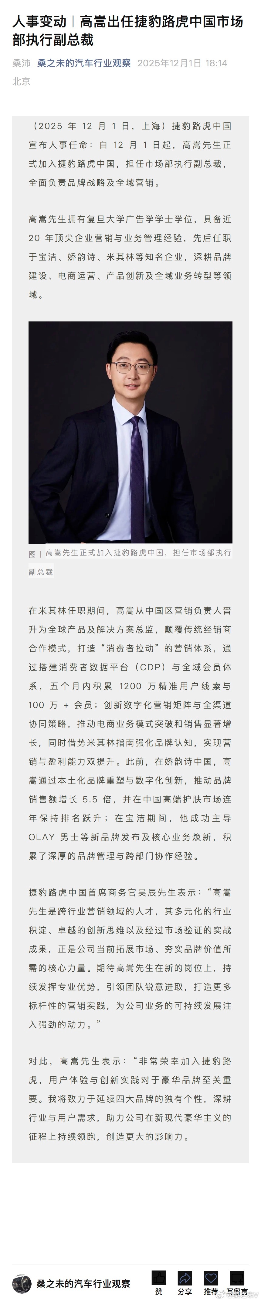 捷豹路虎中国引入跨行业营销人才出任市场营销负责人;自 12 月 1 日起,高嵩先