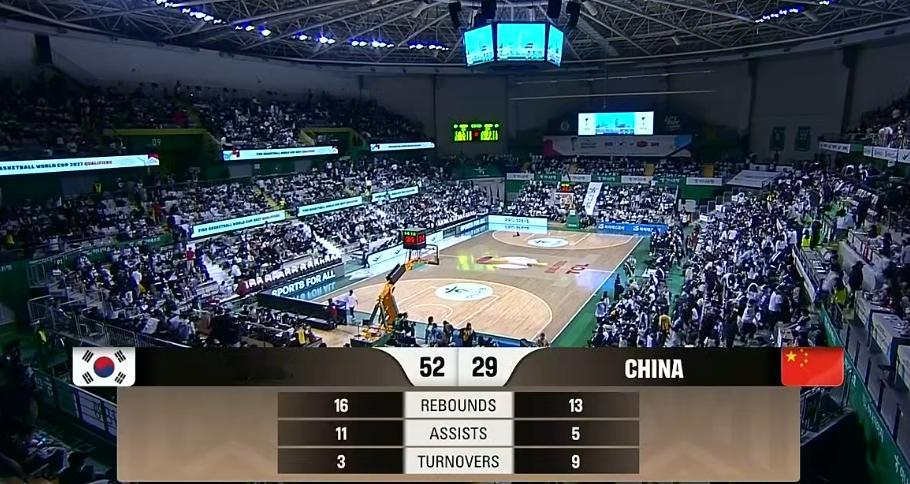 中国男篮半场仅得29分,落后韩国23分,韩国的压哨三分堪称是杀人诛心。韩国半场三分7/10,我们是1/12;韩国3个失误,我们9失误;他们都知道挡拆打一些错位,我们感觉进攻已经凝固了,只有无尽的强攻无果。中国男篮vs韩国男篮