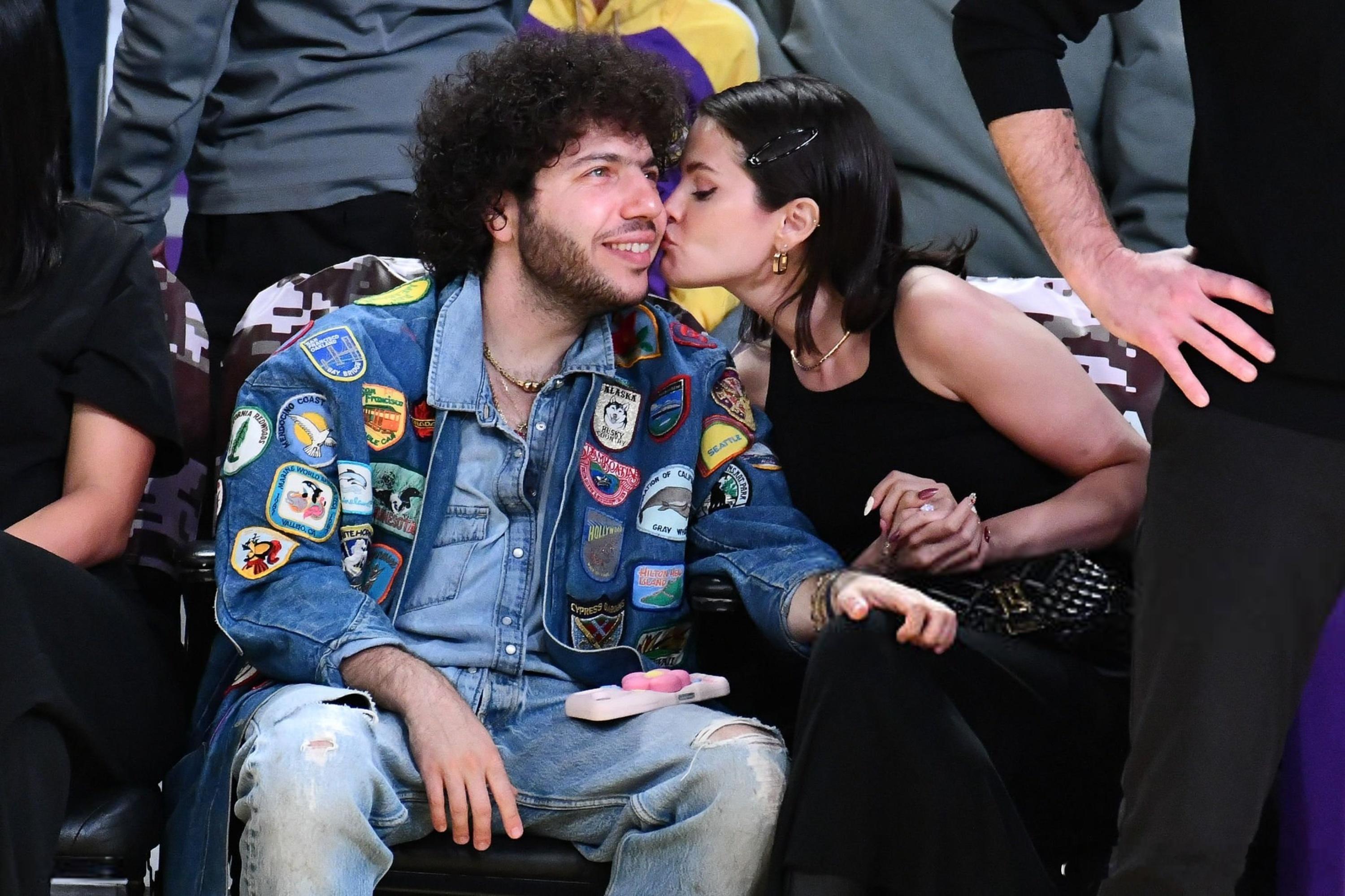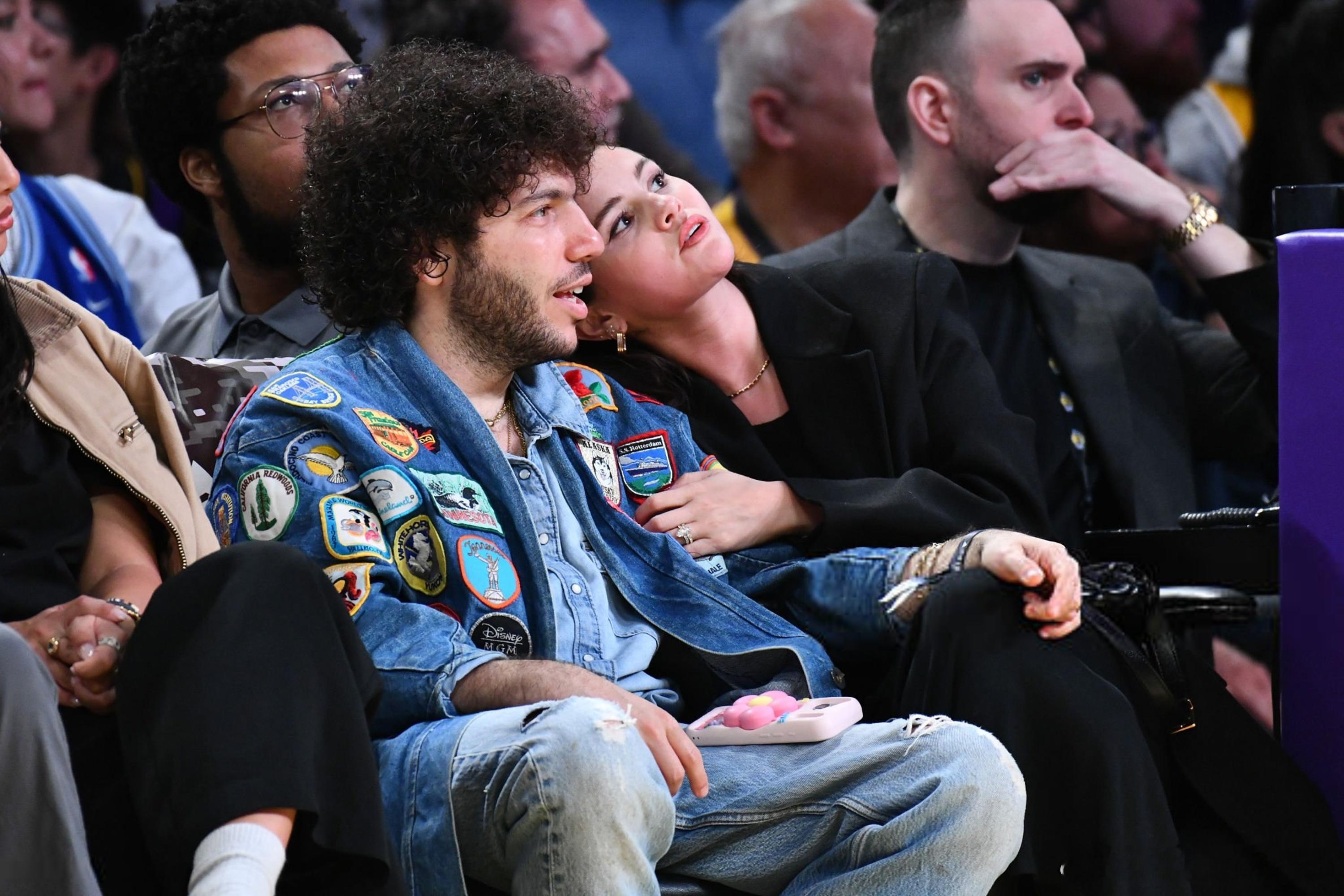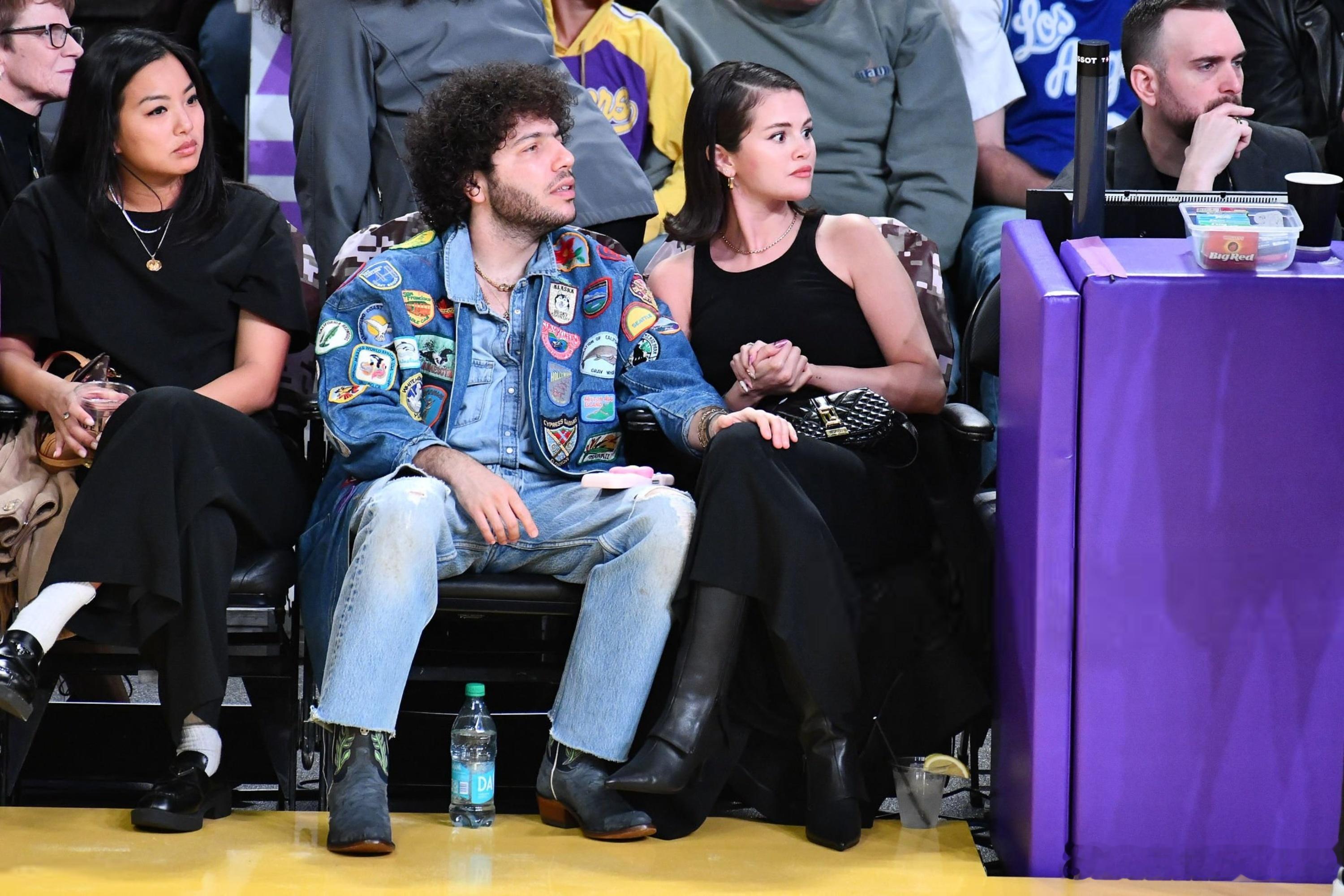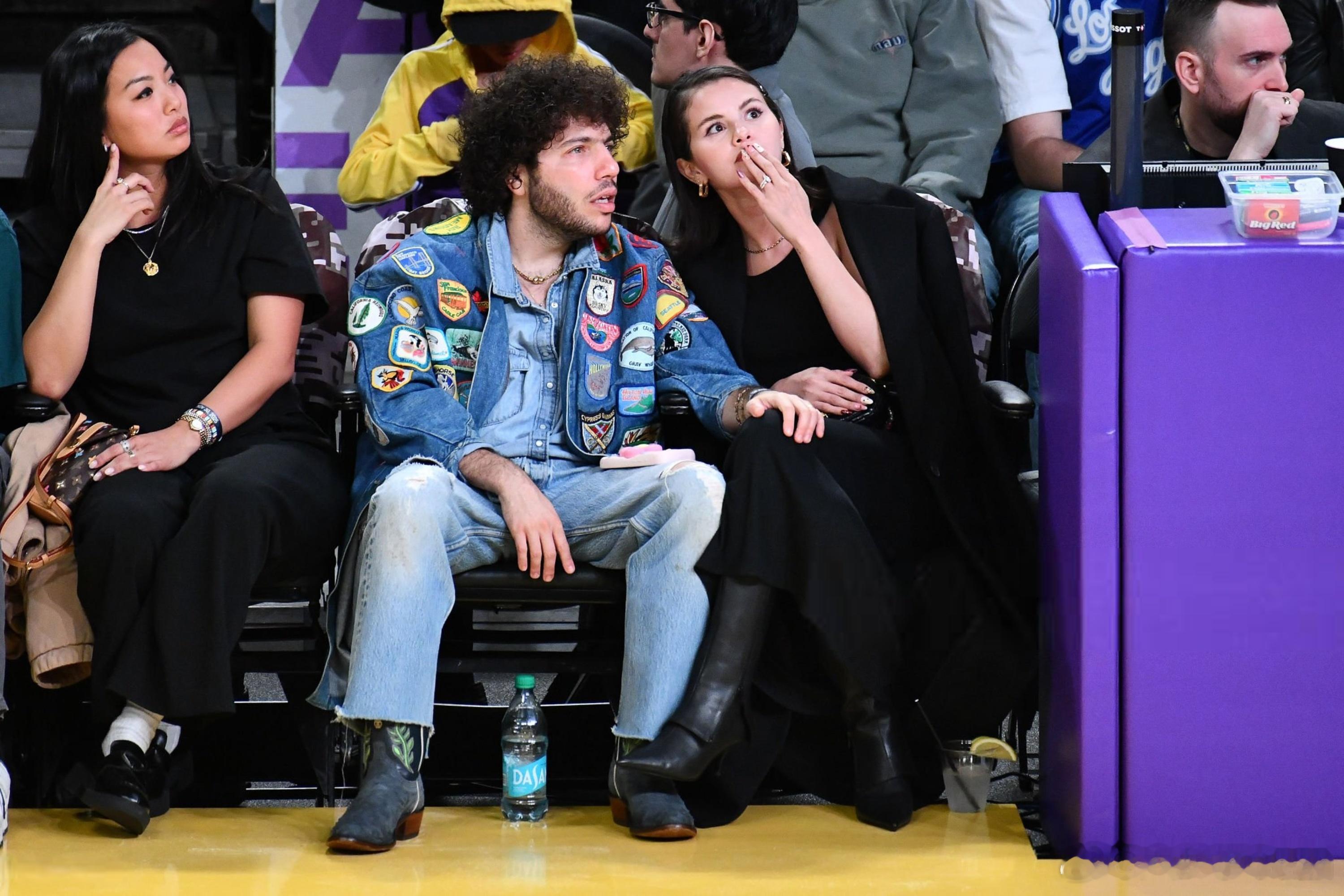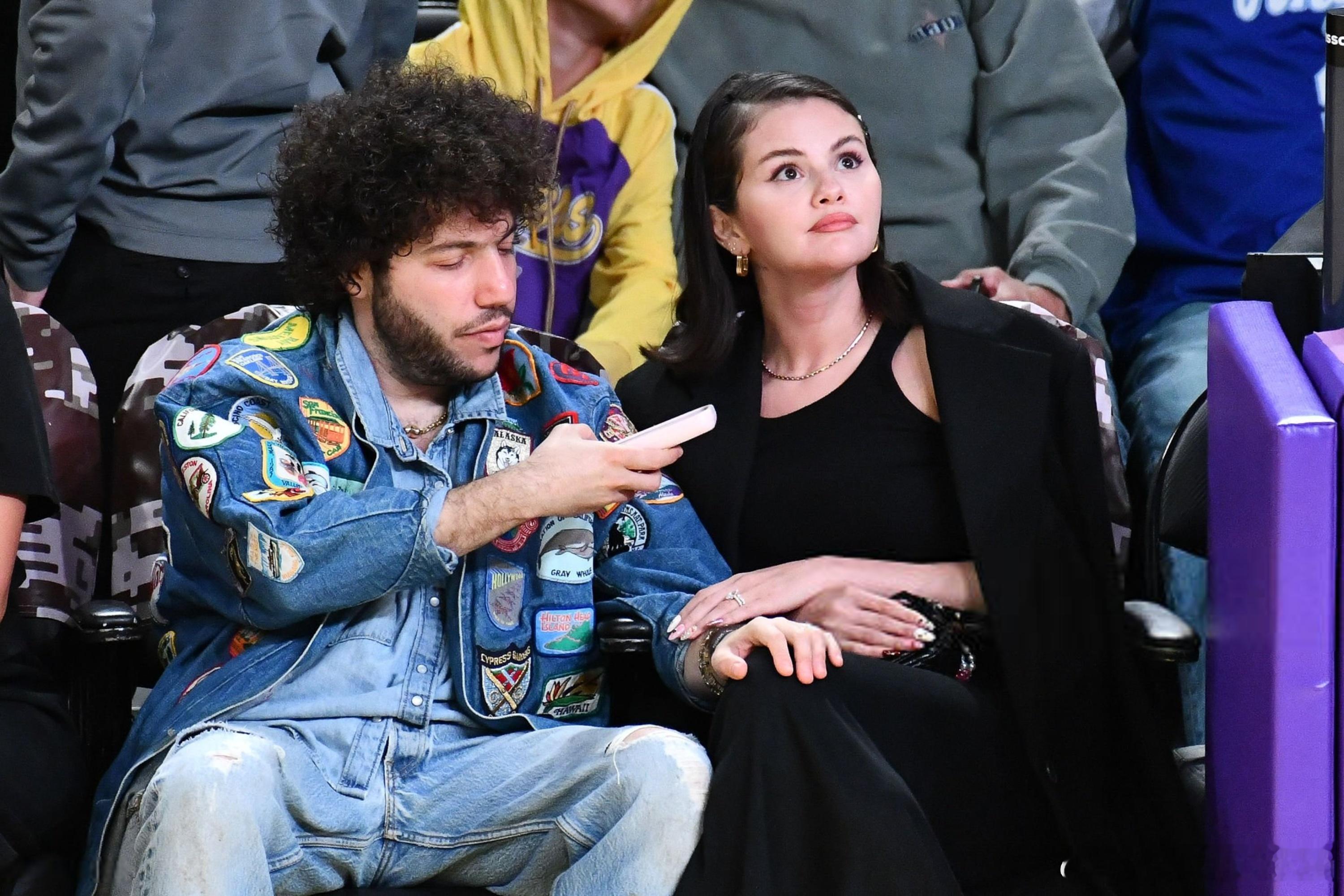 selena gomez赛琳娜戈麦斯和老公Benny blanco在洛杉矶观看湖人比赛,两口子在观众席上情绪高涨,还旁若无人地秀起了恩爱
