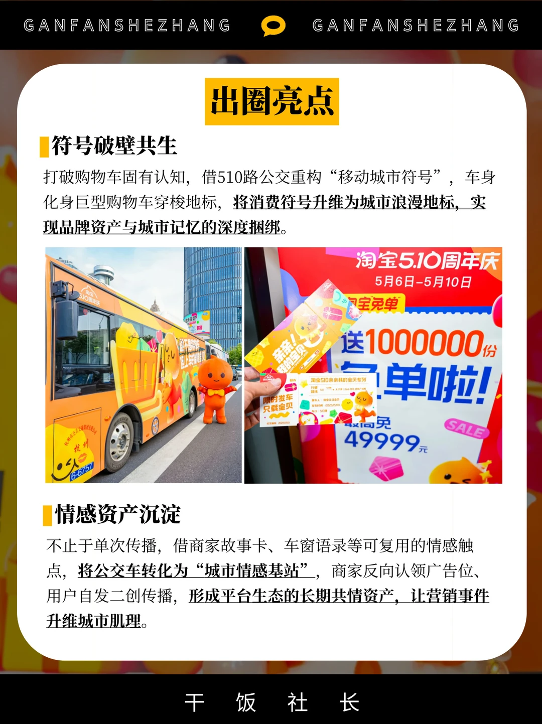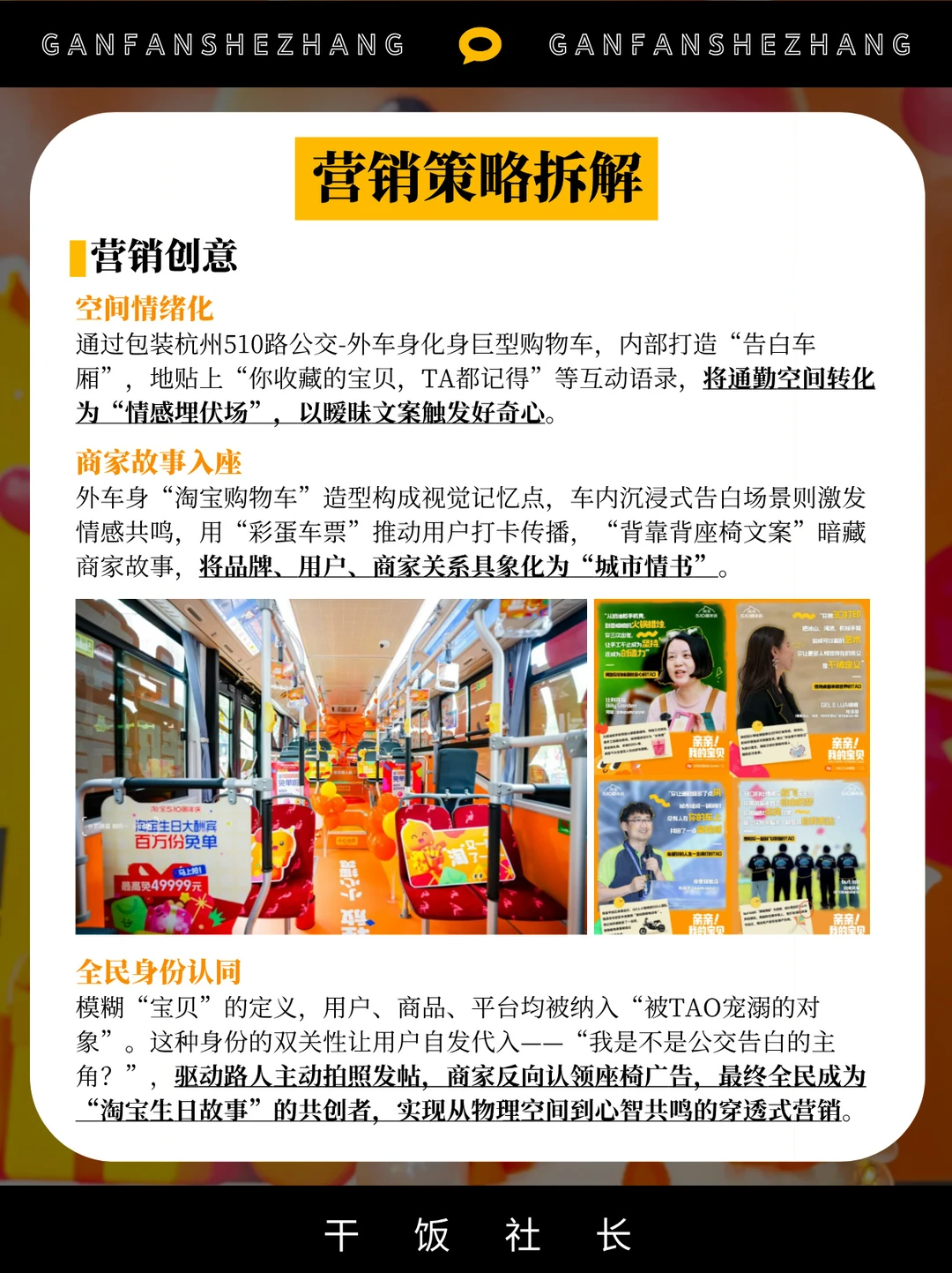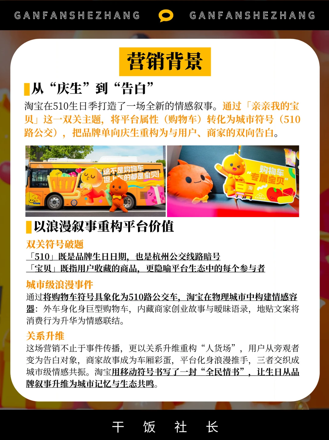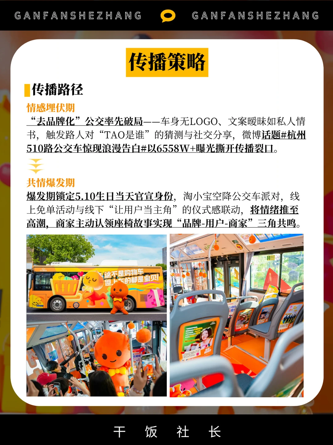 🌟今年510,淘宝又来放大招,以“亲亲我的宝贝”为情感锚点,将购物车开上杭州街头。通过拟人化品牌为神秘“TAO”,用公交车告白、暧昧文案和全民猜谜,将“用户-商家-平台”关系升华为城市级浪漫叙事。 👉从「隐形情感埋伏」到「全民自传播」,这场营销以“互动+共鸣”重塑品牌温度,让用户成为生日主角,最终实现与商家用户双向奔赴的破圈效应。