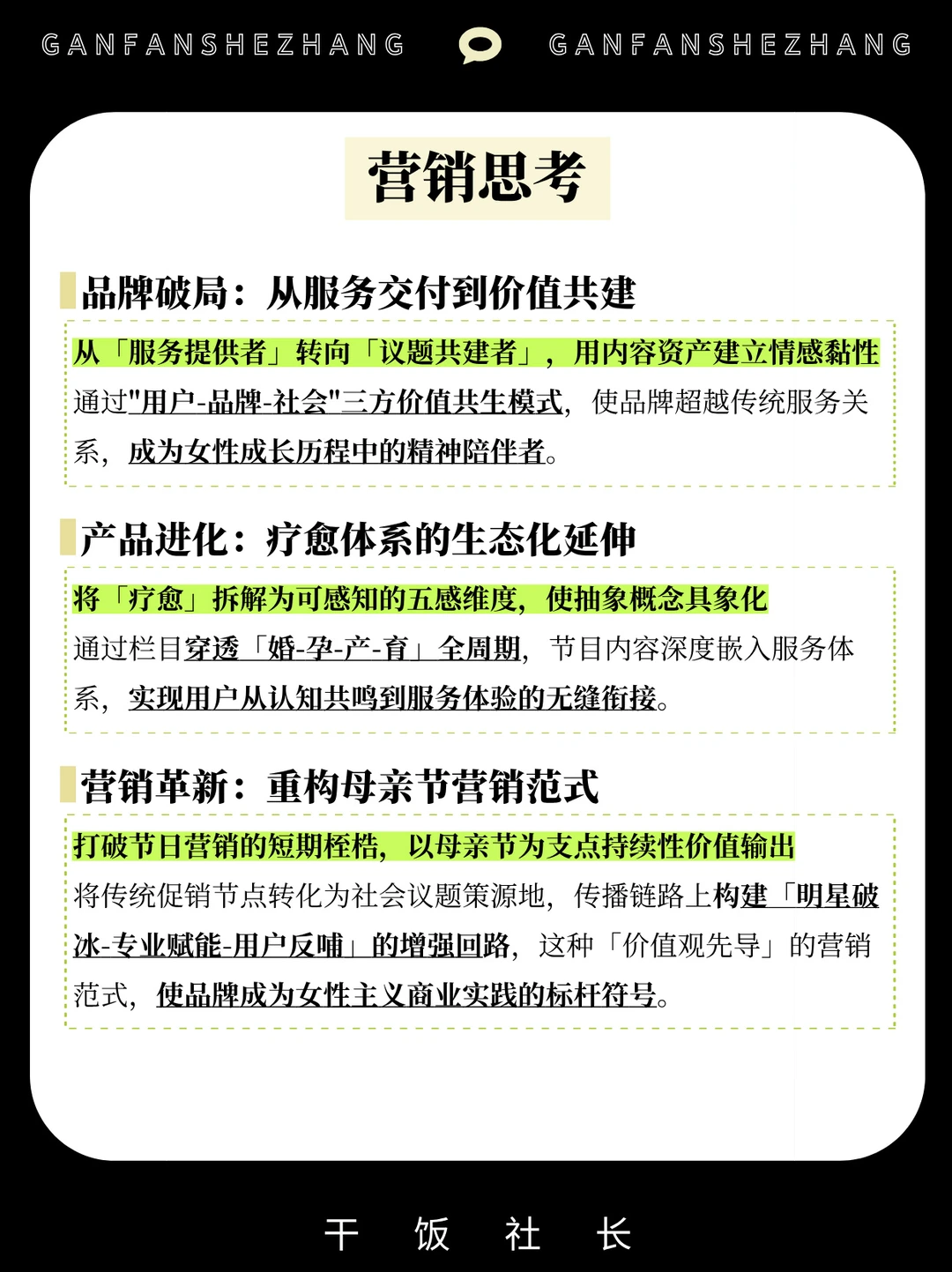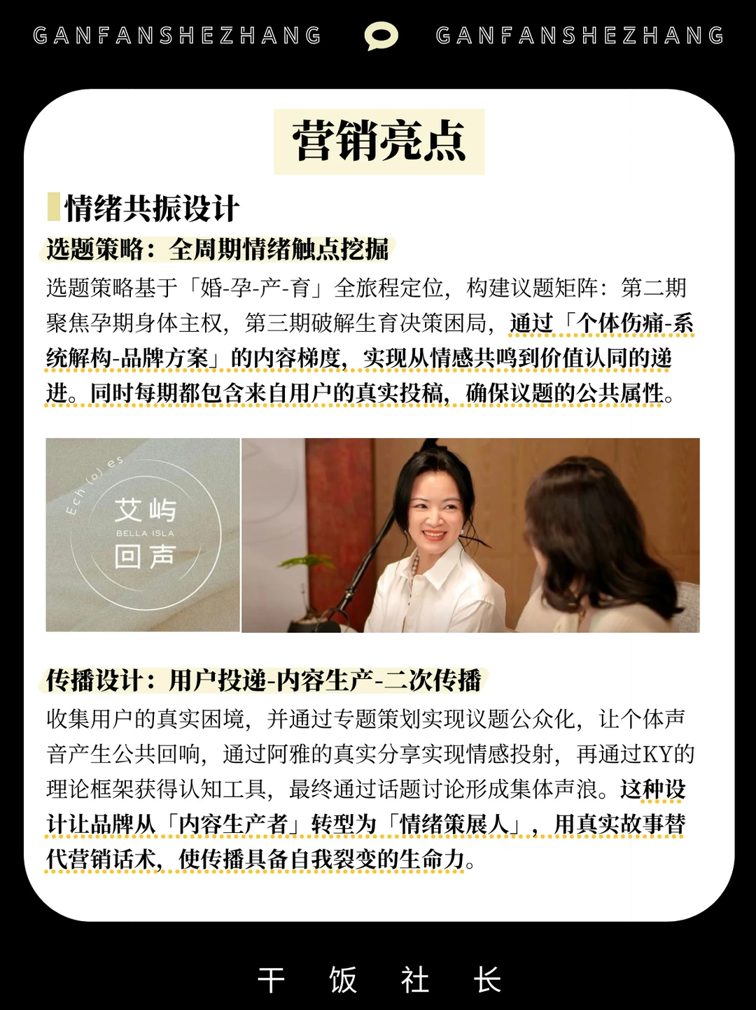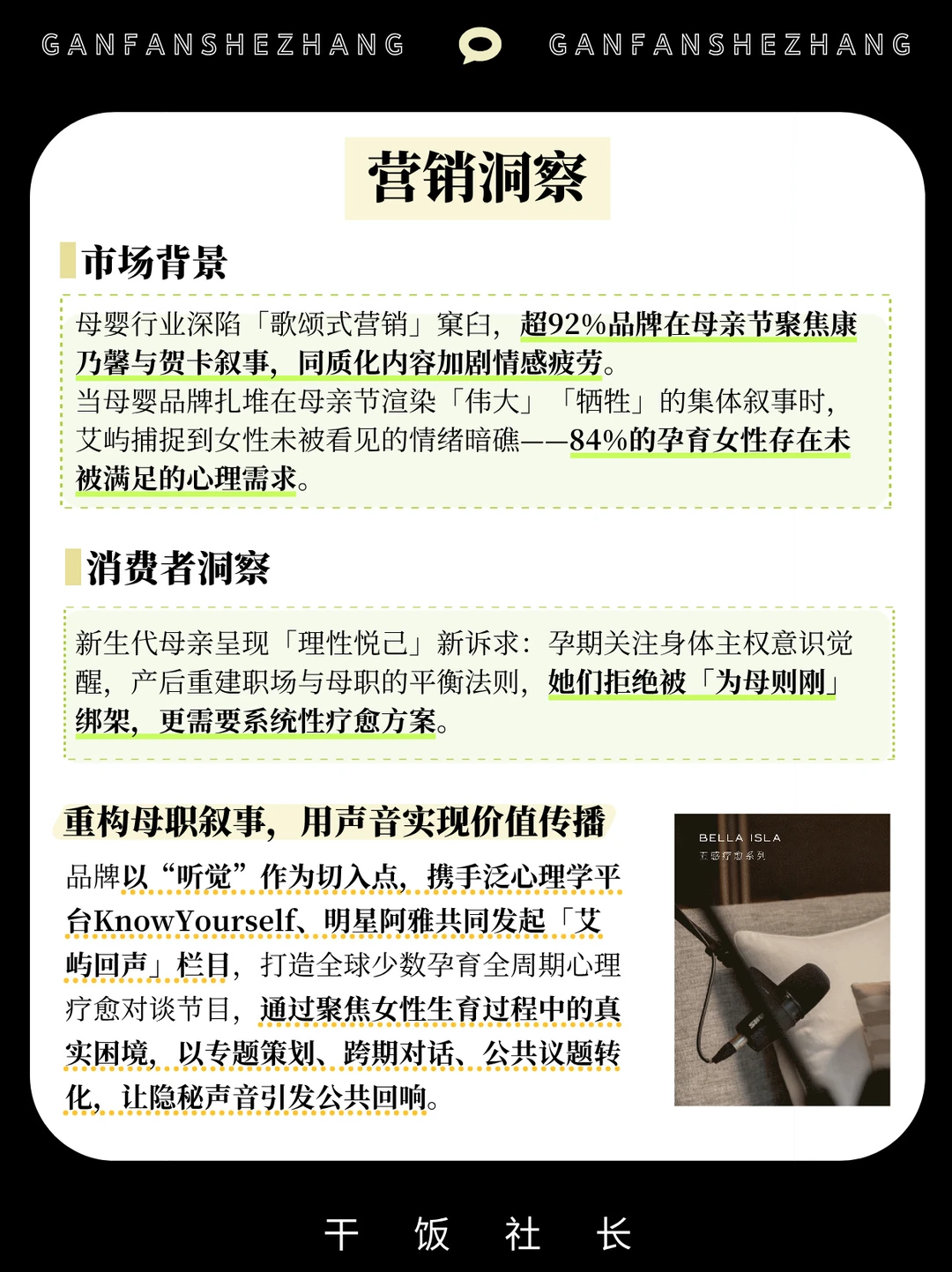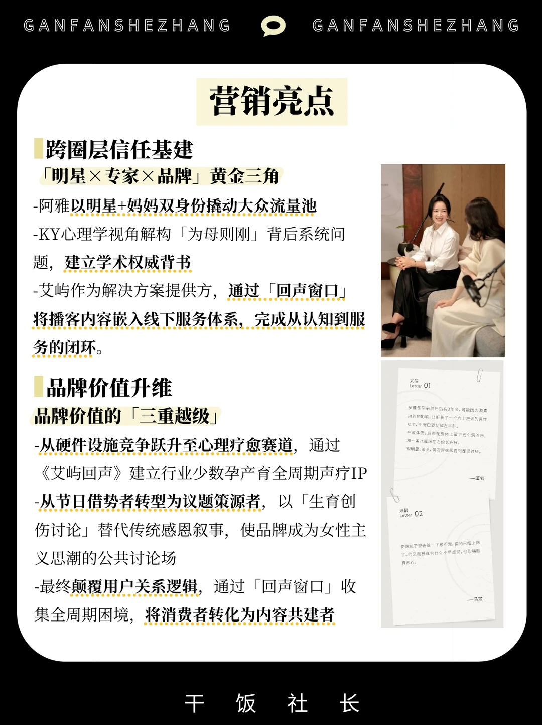 当母亲节营销沉溺于程式化的赞美叙事,艾屿以「声音疗愈」为切口,打造全国少有的孕产育全周期心理对谈栏目《艾屿回声》,在2.3亿女性的情绪蓝海中完成了一次精准破局 通过《艾屿回声》栏目撕开生育伤疤,其中阿雅的个体分享和KY的心理解构,以及艾屿对真实用户,用真实困境取代空洞赞美,让疗愈型品牌与当代女性达成深度共鸣 这场「反歌颂式营销」不仅实现破圈传播,更是品牌从情感共鸣到社会议题的价值升维,也让我们看到对于母亲节营销的创新范式 本期深度拆解:👉 艾屿从情感共鸣到公共议题的升维路径❓