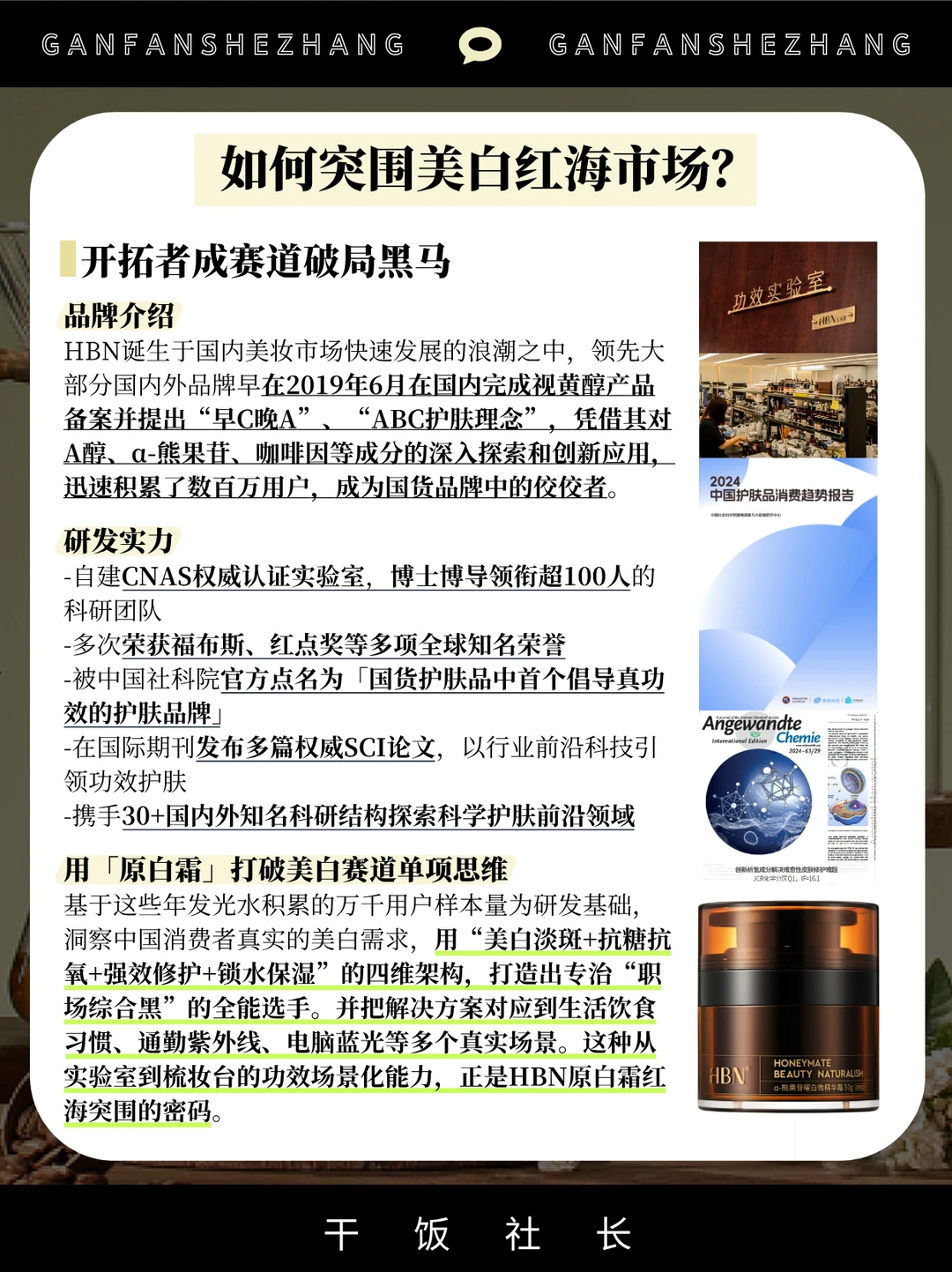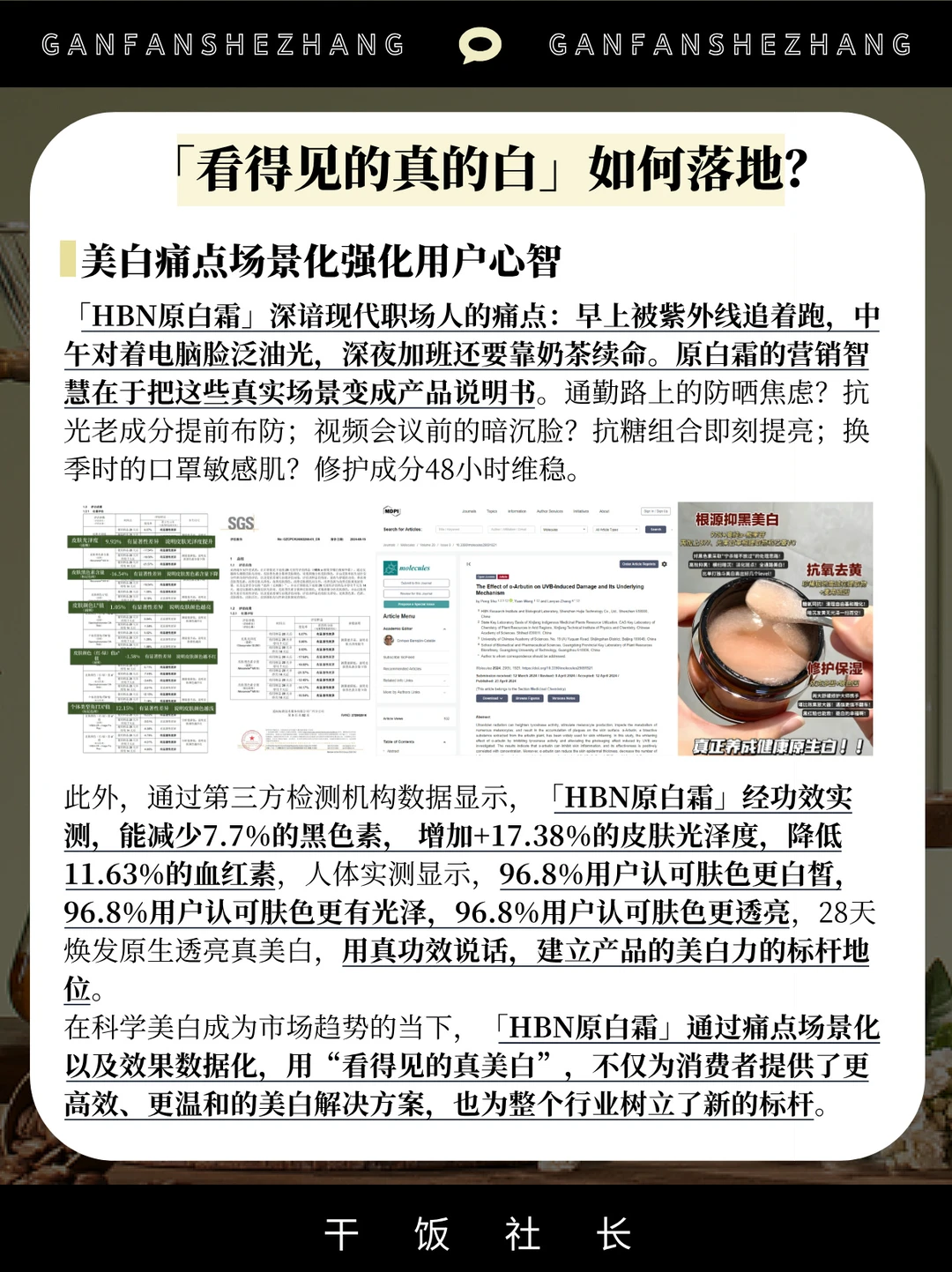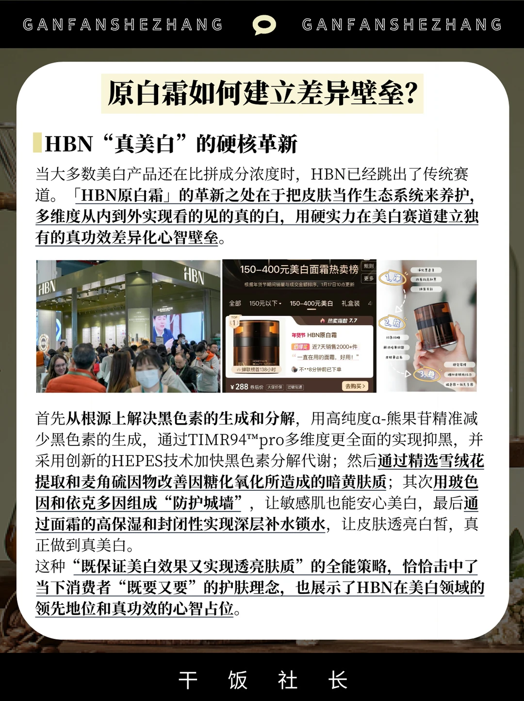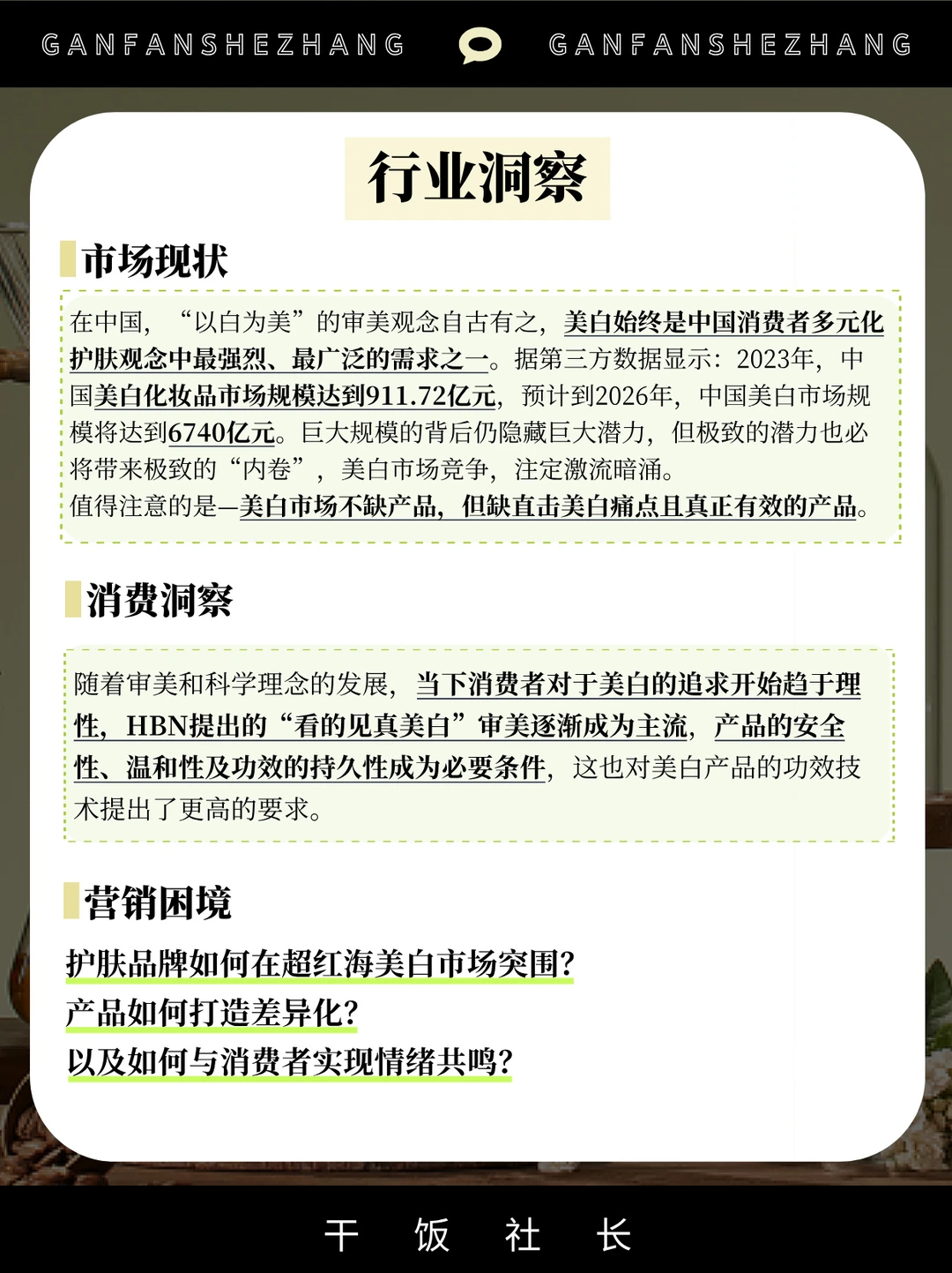 2023年美白行业市场规模已突破600亿 预计到2028年将达到1087亿🌟 在千亿潜力的驱动下,美白新品层出不穷 而消费者不再一味追求极端白 自然透亮的真的白成为了主流审美 美白市场迈向更融合、更精准的高阶时代 这其中,作为真功效护肤的头号玩家HBN🏆 用原白霜再次让我们看到功效卷王的实力 本期就来拆解下HBN原白霜是如何通过 痛点场景化以及真功效成为美白新标杆❓