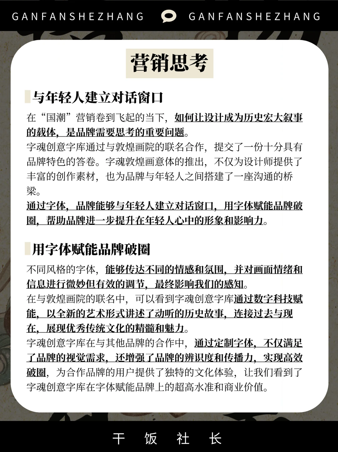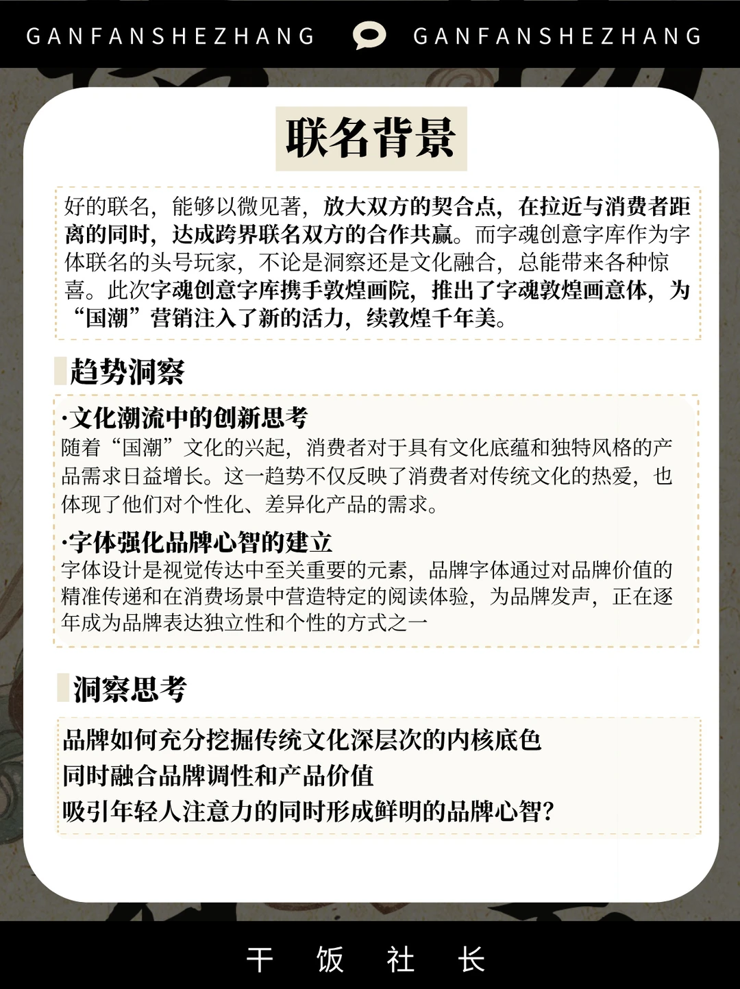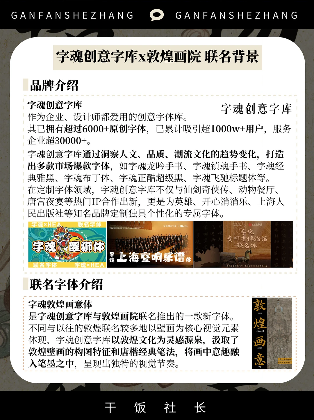 好的联名以微见著,放大双方的契合点 在拉近与消费者距离的同时 也达成跨界联名双方的合作共赢✌ 而字魂创意字库作为字体联名的头号玩家 不论是洞察还是文化融合总能带来各种惊喜 这次字魂创意字库就携手敦煌画院 推出了字魂敦煌画意体联名字体🌟 在“国潮”营销卷到飞起的当下 如何让设计成为历史宏大叙事的载体 字魂创意字库提交了一份具有品牌特色的答卷 今天让我们一起了解一下这个字库品牌👉 是如何通过文化联动用设计打动年轻人的心💓