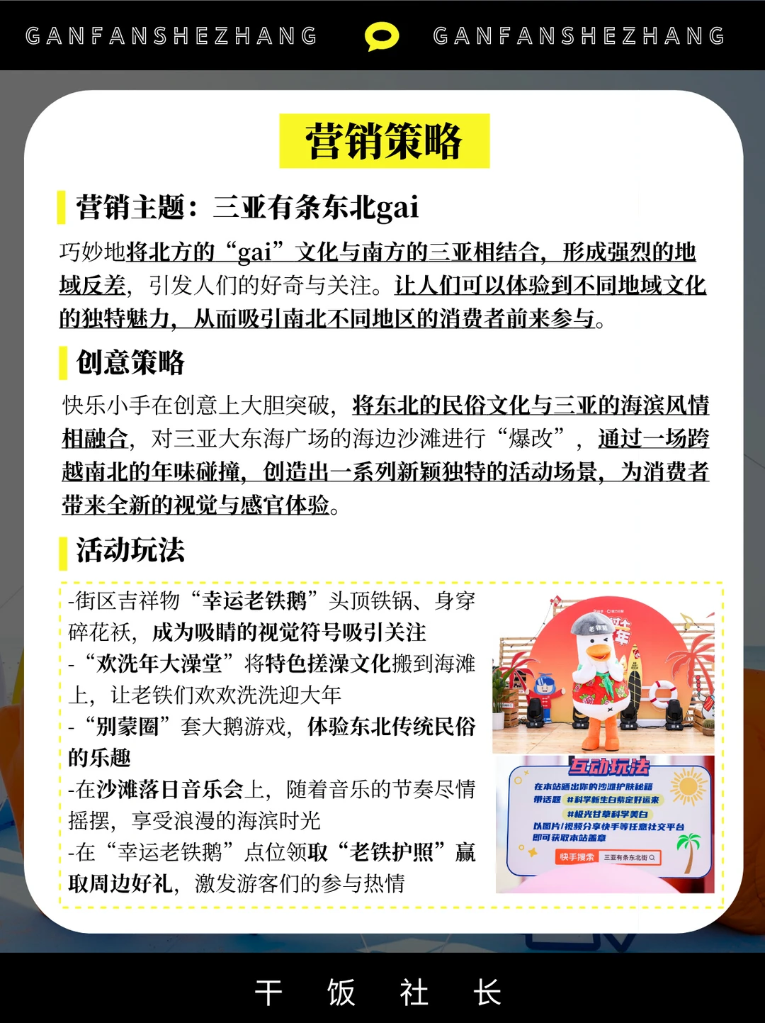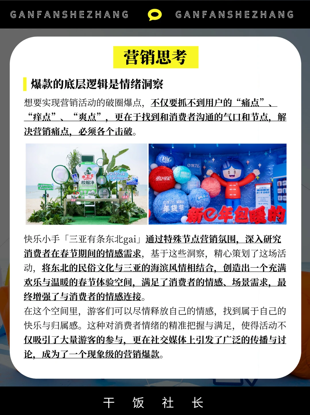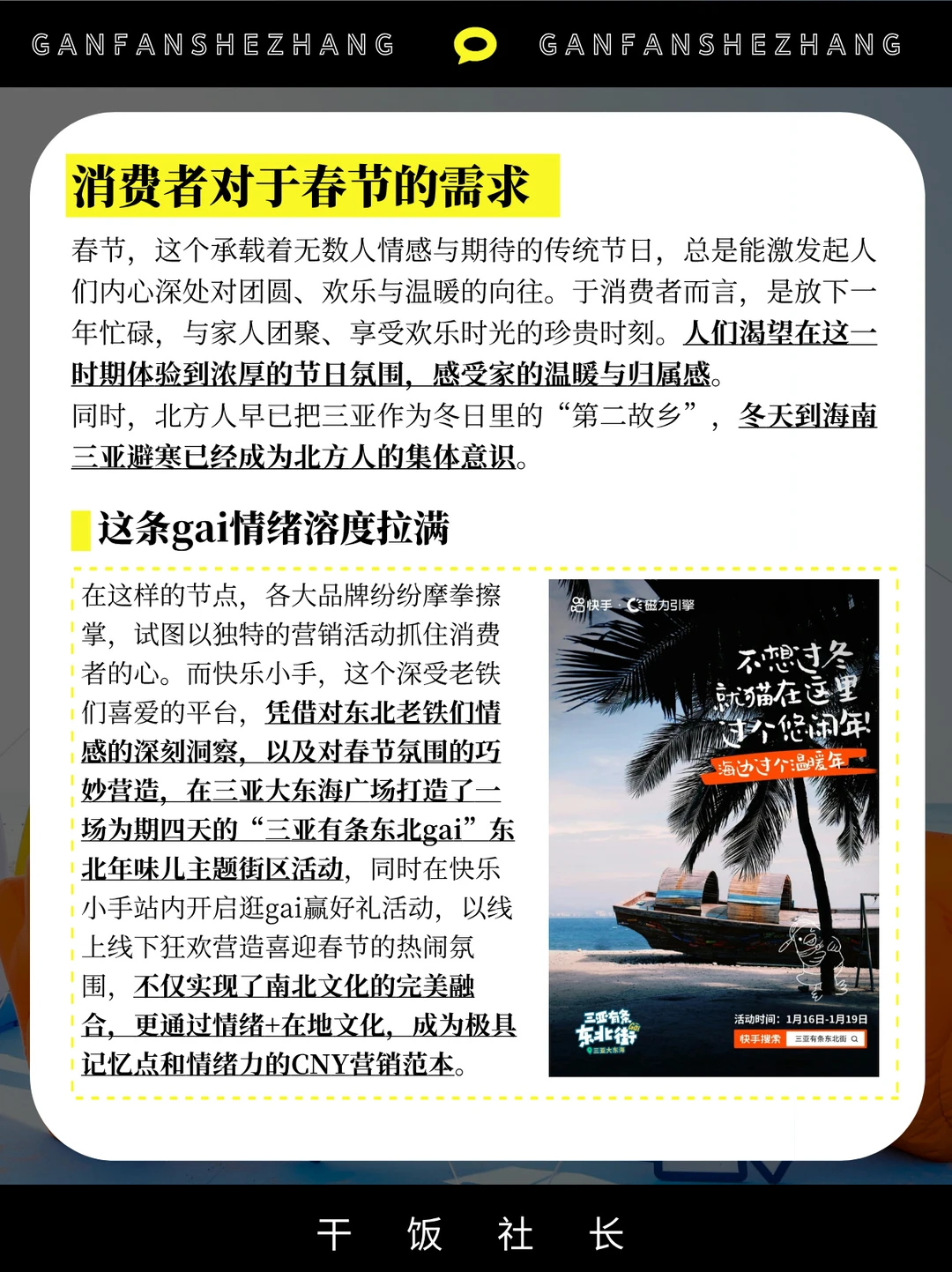 每到临近春节的节点 各大品牌都会想尽办法玩花活👏 作为最宠老铁的快乐小手 深知东北老铁对海南的迷恋 这次直接跨越山海 用超大幅度的跨越式迁徙 把一整条东北gai搬到海南三亚 实现了真正的南北一家亲👫 也让我们看到一个完整 且完美链接情绪的CNY营销范本🌟 本期通过「三亚有条东北gai」的营销动作 看下它是如何借助情绪+CNY营销成为开年王炸❓