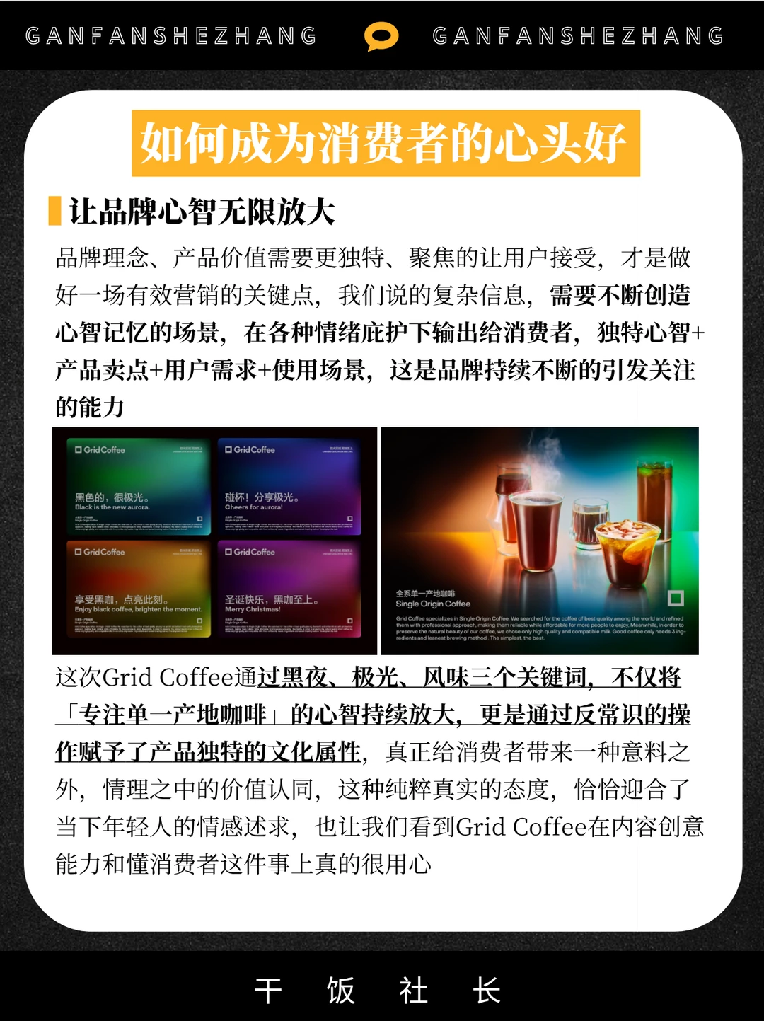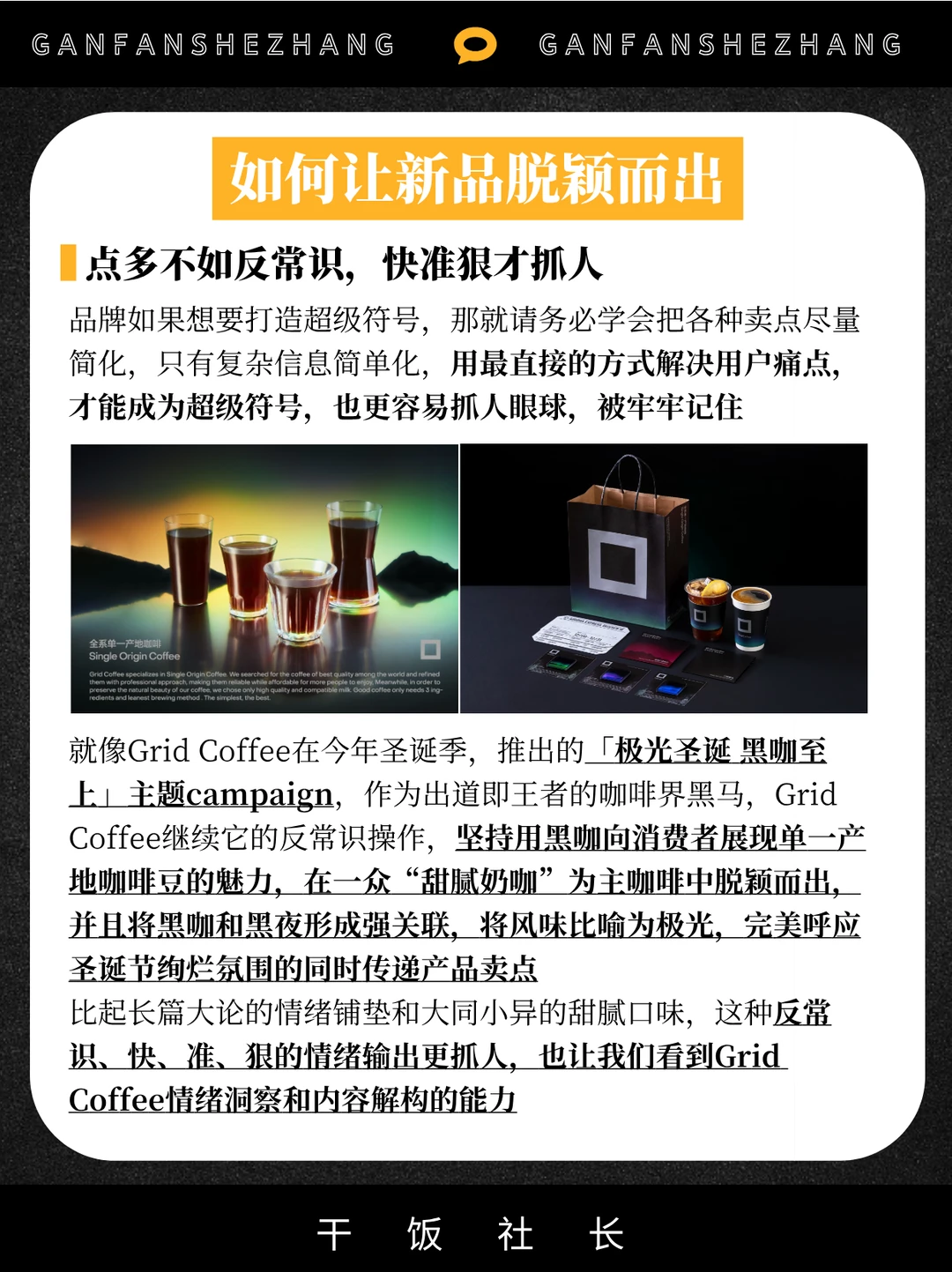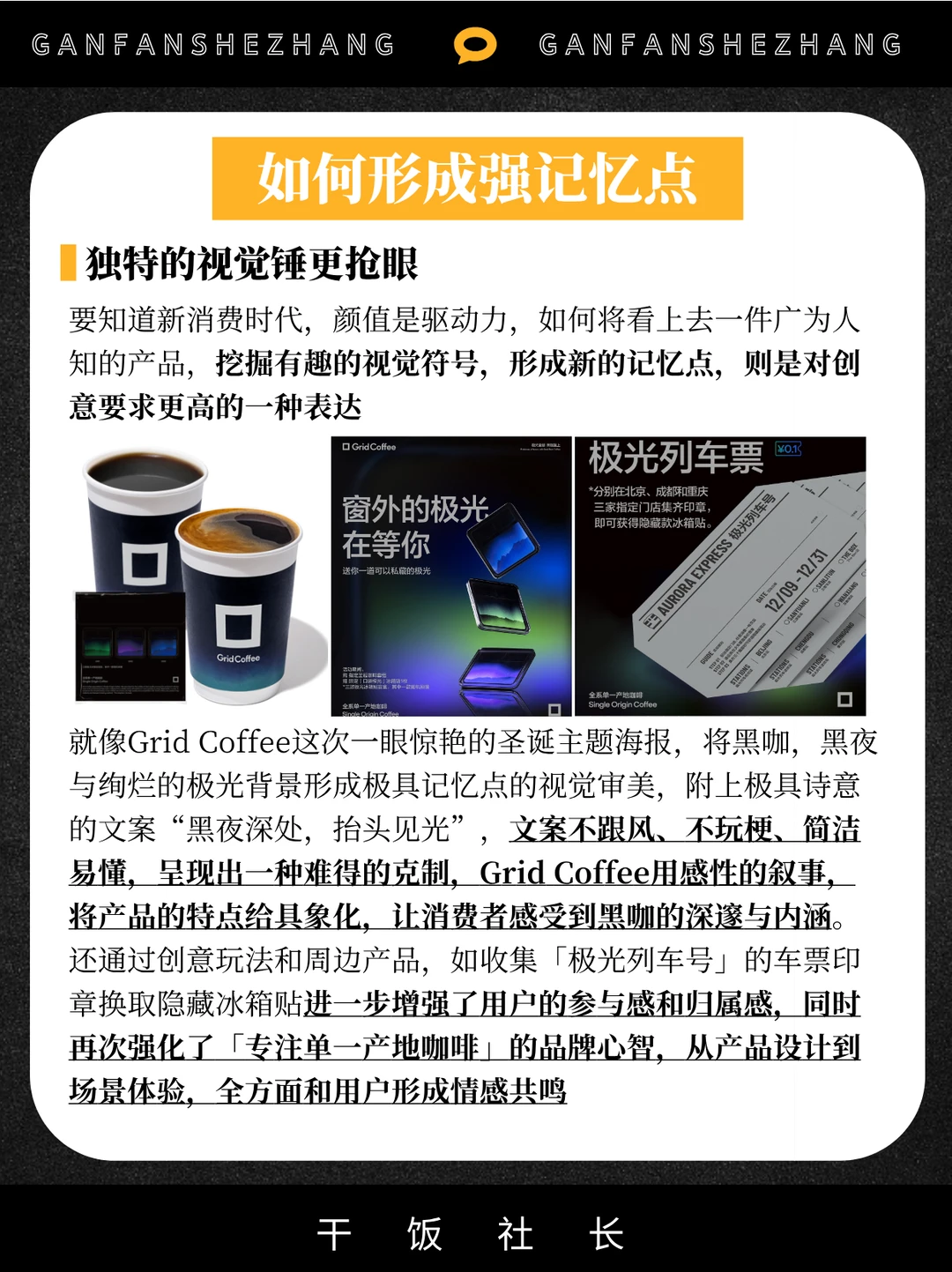 又到了一年一度的圣诞品牌狂欢月[庆祝R] 对于当下消费者来说 光是“参与”还远远不够 他们更想要的是装饰背后的“限定体验” 而在众多圣诞营销中 有个品牌让我眼前一亮[黄金薯R] 那就是Grid Coffee的圣诞新品-极光圣诞🎄 独特的视觉加上反常规的创意内容 和情绪拉满的周边[彩虹R] 这个圣诞季被Grid Coffee的 创新打法给彻底拿捏了[okR] 用高审美+反常识的营销模式 让圣诞营销进入next level❗️