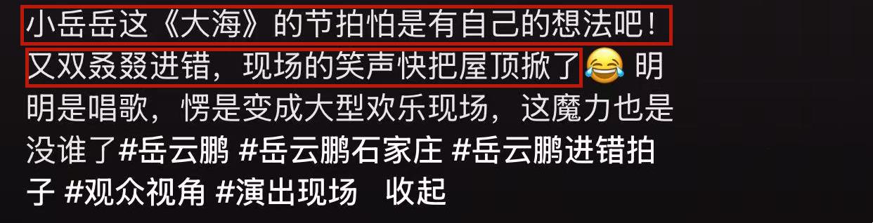 岳云鹏唱歌不进拍,孙越都笑趴在了桌子上。在石家庄专场,岳云鹏唱《大海》,音乐起,没进拍,孙越忍不住了,趴在桌子上,边捶着桌面,边大笑。观众这边,也不惯着,直接喊退票。若是换成别的演员,估计会不知如何应对。岳云鹏面对这些,轻车熟路,三言两语化解。特别是“恼羞成怒”直接假唱的安排,正中观众下怀,全场合唱,岳云鹏拿着话筒对着观众。