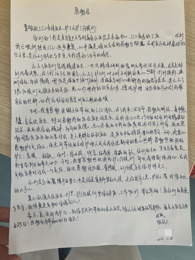 目前,郭先生已经顺利出院,出院之际他已经能下床行走,所有相关身体指标都恢复正常。由于他家庭情况也比较特殊,家中目前仅有80余岁母亲共同生活,且其母亲也由于疾病后遗症行动不便,ICU医护团队也在郭先生住院期间为其倾注了更多的关心和关爱,杨云护士长带领的护理团队在患者康复治疗时积极鼓励,让郭先生在ICU期间感受到了家人般的温暖,出院之际,他对这里依依不舍地说道:“金山医院不仅给了我第二次生命,也是我的第二个家”。