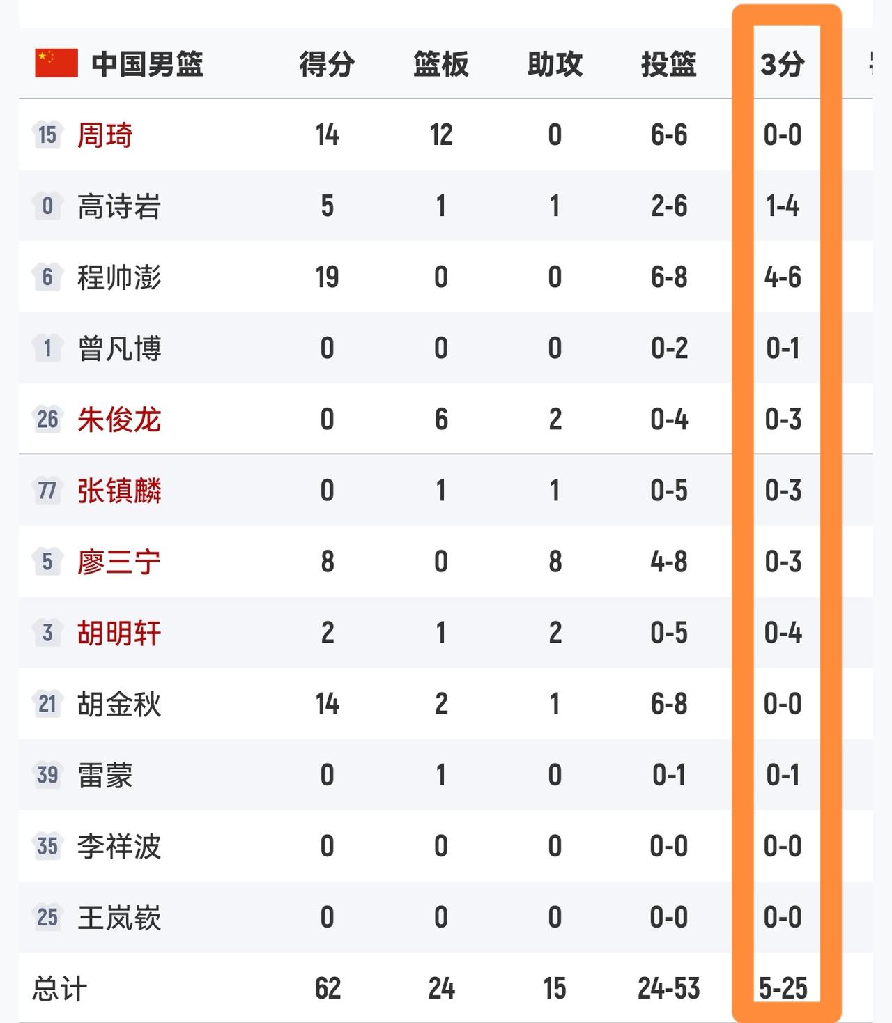 无比怀念广州恒大! 太无语了!中国篮球正在走中国足球的路!只要是逆风球,谁上谁紧张!看看这个三分,朱俊龙3中0,张镇麟3中0,廖三宁3中0,胡明轩4中0,唯一一个正常的程帅澎,还受伤下场了!又想到了上海海港,中超三连冠,亚冠一胜难求垫底!中超“三雄”,倒数前三!一帮窝里横的玩意! 无比怀念广州恒大的辉煌!