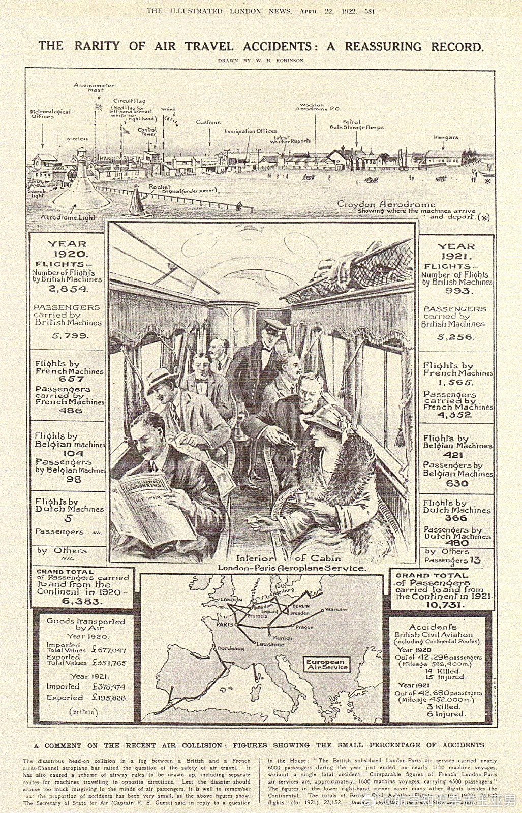 #航空创作计划# 1922年4月22日《伦敦新闻画报》特地用这样一个版面向公众说明航空旅行的安全性。20世纪20年代初,商业航空刚刚起步,人们乘坐飞机出行的意愿一方面受制于并不便宜的票价,另一方面则受限于对安全性的担忧。这篇题为《航空旅行事故的罕见性:一份令人安心的记录》的短文罗列出一组统计数据,试图说明航空旅行没有那么可怕。画面最顶部绘制了伦敦克罗伊顿机场(英国最早的机场之一,1920年启用),用非常科普的方式标注出机场的各种技术和管理设施,其中你能看到无线电发射站、气象台、风速计、航道旗、塔台、海关、移民局和机库。下方的画面则展示了豪华的飞机客舱内部,当时飞机内部设施大多参照火车车厢,至少表面上看舒适性不错。底部的画面则用地图呈现了欧洲航线的扩展情况,图中显示伦敦、巴黎、柏林、布鲁塞尔、鹿特丹、莱比锡、德累斯顿、汉堡、慕尼黑、布拉格、华沙、洛桑等城市都被纳入航空网络。没有数据当然难以说明问题,画面两侧用一组翔实的数据表明了当时的航空客运情况。文章最后指出,针对近期的空难调查,数据显示事故占比极低。总的来说,这篇很不错的小文旨在向公众表明,航空事故的概率其实极小,英国每年承运的伦敦—巴黎航线乘客近6000人,在1100次航班中未出现致命事故。在一百多年前,这样的安全数据还足令公众安心,但如果放在今天,恐怕会酿成巨大恐慌:1921年英国民航承运42680人中伤亡9人,超过了万分之二,这在当下绝对不会被接受。