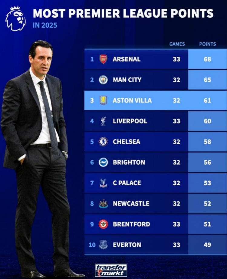直播吧12月1日讯转会市场盘点了2025年度英超总积分榜,具体如下: