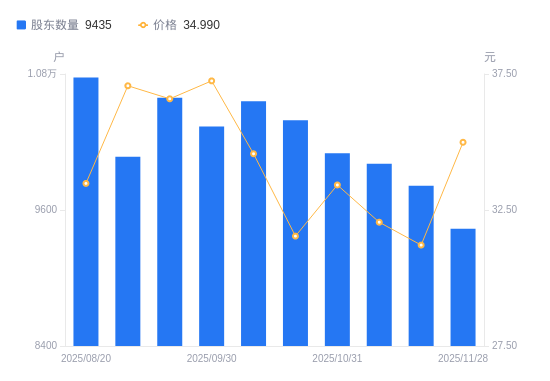 近一年(2024年12月20日至2025年11月28日),博众精工A股股东户数从9779户,减低至9435户,降幅3.52%,区间股价上涨27.30%。