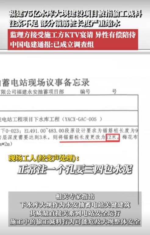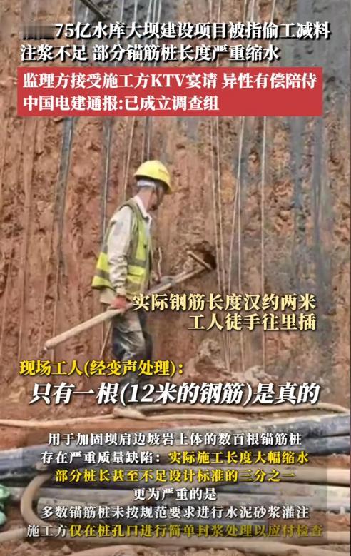 福建三明,有人举报某电站下水库大坝边坡加固的锚筋桩存在严重缩水问题,部分锚筋桩长度仅为设计要求的1/3,且未按规范灌注水泥砂浆,焊接上也偷懒,原本应该整体焊接,却变成了点焊。此外,举报人还举报相关负责人接受宴请、KTV娱乐等活动。目前,负责建设的管理部门已调查核实,确实存在举报中所述的情况。(来源:凤凰网安徽) 据悉,涉事抽水蓄能电站是福建省的“十四五”首个获核准的百万千瓦级储能项目,总投资为75亿元。一旦建成后,该电站每年发电约12.6亿度电,还能减少165万吨的二氧化碳排放。然而就是这种利国利民的绿色工程,却有人在上面动了手脚。 那锚筋桩是什么东西?它在电站建设中的地位是什么? 锚筋桩是一种通过钻孔或挖孔形成桩体,利用钢筋与混凝土嵌制作用加固岩土体的建筑结构,一般用于边坡、隧道、坝基等工程。 按照设计要求,锚筋桩的长度应该为长12米,但实际上只打了3~5米,有的甚至还不到2米;而且三根钢筋长短不一,有的勉强达标,有的还差了一大截。 对焊接的问题,有工人表示,本来按照要求是要将三根钢筋与钢管焊接成一个整体,但这个工作量大,每天只能焊接一两根,所以后来就用点焊代替了整体焊接。 对于灌浆的问题,工人表示按照规范要求,锚筋桩必须通过注浆管灌注水泥砂浆,让桩与岩土紧密结合。但大部分桩都没灌浆,只是在桩洞口封了点浆,就是为了应付检查的。 当然这些还不是最离谱的,据悉这个大工程的设计方、施工方、监理方,竟然全都是一个公司的,都是自己人。 《建筑法》第34条明确规定:工程监理单位与被监理工程的承包单位以及建筑材料、建筑构配件和设备供应单位不得有隶属关系或者其他利害关系。 《建设工程质量管理条例》第35条规定,工程监理单位与被监理工程的施工承包单位以及建筑材料、建筑构配件和设备供应单位有隶属关系或者其他利害关系的,不得承担该项建设工程的监理业务。 由此可见,这家建设公司存在诸多违法情况。用自己人管自己人,这样的工程谁敢用? 除了上述问题外,据举报人透露,相关监理人员曾接受了施工方的宴请,去KTV娱乐,甚至还有异性有偿陪侍服务。 虽然这种情况的确不少,但对于这种大型的,涉及到普通老百姓利益的以及安全的项目,就必须严阵以待,绝不能出现任何差池。 那既然已经查出了确实存在以上问题,该如何处罚呢? 首先,勘察单位未按照工程建设强制性标准进行勘察的,责令改正,处10万元以上30万元以下的罚款。如果因为工程质量问题发生事故的,应当责令停业整顿,降低资质等级,甚至吊销资质,赔偿损失。 其次,施工单位在施工中偷工减料的,不按照工程设计图纸或者施工技术标准施工的,责令改正,处工程合同价款2%~4%的罚款;造成建设工程质量不符合规定的质量标准的,负责返工、修理,并赔偿因此造成的损失。如果情节严重的,责令停业整顿,降低资质等级或者吊销资质证书。 第三,工程监理单位与建设单位或者施工单位串通,弄虚作假、降低工程质量的,责令改正,处50万元~100万元罚款,降低资质等级或者吊销资质证书;有违法所得的,予以没收;造成损失的,承担连带赔偿责任。 当然,如果发生了重大工程事故,造成人员伤亡的,则相关的单位负责人以及主要负责人应当承担相应的刑事责任。 最后,大坝不是“试验田”,群众安全更不是一个口号,要守住质量底线,必须先斩断利益链条。 目前,建设公司已成立调查组,当地水利局也介入核实,相信调查组会给公众一个真相以及一个满意的答复。