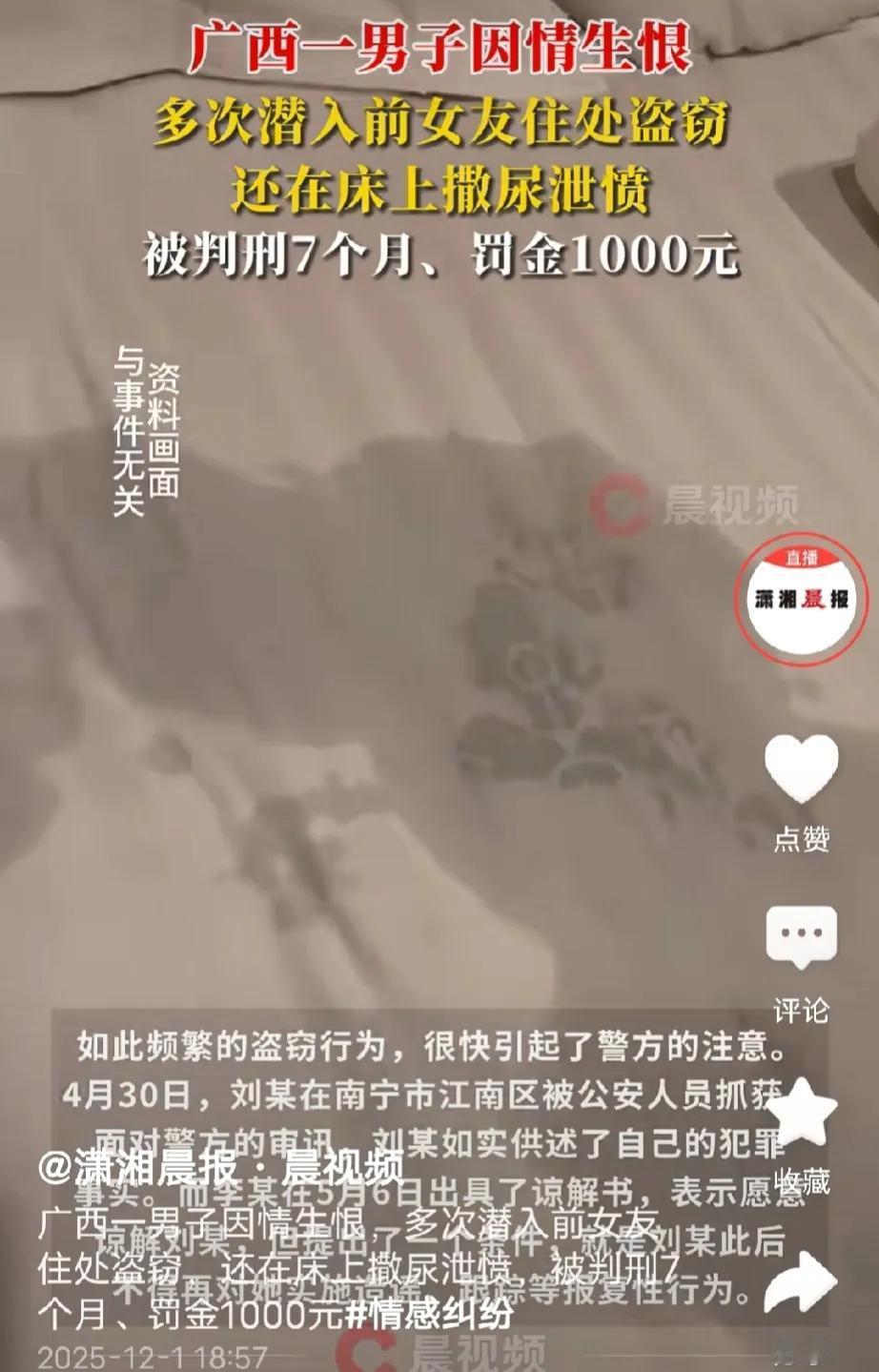 广西南宁,男子跟女友分手后愤愤不平,为泄愤,他偷偷潜入前女友家,偷走600块钱,一只牙膏、7张银行卡和购物卡,这样还不解气,之后他又潜入前女友家,往她靴子上撒尿,甚至跑到前女友床上拉尿,前女友查看监控后发现是前男友所为,她崩溃了,当场报警,男子很快被抓,前女友出具了谅解书,不过她提出了一个要求。 刘某刚和李某本是一对情侣,但是,由于各种原因,两人最终闹掰了。 今年4月份,李某和刘某刚提出了分手,对此刘某刚愤愤不平,他觉得自己在这段感情里付出了那么多,最后却落了这么个下场。 刘某刚因爱生恨,在他心里,你不跟我过,你也别想好过,他得想个办法去扰乱李某的生活,让她不得安生。 4月10号,刘某刚趁李某不在家,用他自制的工具,扭开李某租房大门,之后潜入她家。 刘某刚成功进入李某家里后,他在房间里转了一圈,不知道要干些什么,怕被人发现,之后悻悻离去。 离开后的刘某刚心里依然很不爽,之前还是男女朋友,他进李某家来去自如,如今分手了得用自制钥匙偷偷摸摸进入,越想越觉得憋屈。 4月19日,刘某刚再次潜入李某家,这一次他决定搞点事,于是在李某家里到处翻,他翻到了李某放在抽屉里的600元现金,刘某刚二话不说顺手牵羊。 反正不能白来一趟,先给她一个教训,就在刘某刚拿着钱准备离去的时候,他突然感到内急,一个荒唐的念头在他脑海里出现。 刘某刚来到门口,看到了李某的靴子,他想都没想直接尿到李某的靴子里,解手完毕,刘某刚带着愉悦的心情离去。 前两次得手后,刘某刚在4月20号到27号期间,趁李某不在家,又偷偷潜入李某家,不过这几次他都没有拿东西,只是转了一圈就走了。 4月28号,刘某刚再次潜入李某家,这一次他不想再空手离去。 他进入房间后先是在房间里转一圈,然后到处翻,翻出了李某的银行卡和购物卡,他全部给打包带走了,另外还拿走了李某的一支牙膏。 他想狠狠给李某一个教训,看她没了银行卡和购物卡,怎么生活。 拿完这些东西,刘某刚还是不解气,他想做出更大的行动。 离开前,他竟然跑到李某床上撒了包尿再走。 刘某刚只要想到,李某看到床上那一包尿,气得咬牙切齿的样子就忍不住想笑,心情也随之大好。 前几次,李某并没在意,因为那几百块钱和银行卡一直没时间用,直到28号那天晚上,她回家后,闻到床上那一股尿骚味,看着床上那被尿湿未干的床,李某才察觉,家里可能进贼了。 为了证实自己的想法,李某赶紧打开家里的监控查看,这不看不知道,一看简直要把她给气疯了。 她怎么也没想到,刘某刚会做出如此恶劣的行为,之后她通过检查发现自己放抽屉里的600块现金、银行卡、购物卡都不见了。 李某当场报警,警方通过调查监控很快就把刘某刚缉拿归案。 刘某刚被抓后,对自己的犯罪事实供认不韪,警方从他身上抽出了400元现金,还有李某的银行卡、购物卡,这些东西最终全部归还给李某。 5月6号,李某出具谅解书,表示愿意谅解刘某刚,不过,她提出,从今往后,刘某刚不得再对她实施造谣、跟踪等恶劣的行为。 最终,法院判处刘某刚有期徒刑7个月,并处罚金1000元。 唉,不得不说,刘某刚因分手泄愤的行为既荒唐又恶劣。 恋爱本是你情我愿,分手难免有遗憾,可他把付出当筹码,用潜入前女友家偷钱、偷物品,甚至往靴子和床上撒尿的方式泄愤,既违背了曾经的情分,也突破了做人的底线。 这种行为不仅毁了过往的美好回忆,还严重侵犯了李某的生活安宁和人格尊严,换谁都会崩溃。 而李某出具谅解书却附加“不得造谣跟踪”的要求,既显宽容,也藏着对自身安全的担忧,合情合理。 感情不在,体面和尊重该留,报fu从来不是结束一段关系的正确方式。 从法律角度,如何分析这个事件? 《刑法》第264条规定,以非法占有为目的,秘密窃取数额较大的公私财物或者多次秘密窃取公私财物的,构成盗窃罪。 本案中,刘某刚与李某分手后,多次趁李某不在家,用自制工具潜入其租房,先后窃取600元现金、7张银行卡、购物卡及牙膏等财物,属于“多次入户盗窃”。 即便部分财物价值不高,但其多次入户盗窃的行为已满足盗窃罪构成要件。 不过刘某到案后如实供述还取得被害人附条件谅解,法院最终对他做出7个月有期徒刑和处罚1000元的处分。 《刑法》第245条规定,非法侵入他人住宅的,处三年以下有期徒刑或者拘役。 住宅是公民享有安宁权和隐私权的核心空间,受法律严格保护。 刘某刚在与李某分手后,未经李某同意,多次用自制工具撬锁潜入其租房,即便部分次数未窃取财物,但未经允许侵入他人住宅的行为已侵犯李某的住宅安宁权,构成非法侵入住宅罪。 不过因刘某刚的盗窃行为与非法侵入住宅行为存在牵连关系,法院择一重罪以盗窃罪定罪处罚,既体现了对公民财产权的保护,也兼顾了对住宅安宁权的维护,符合刑法罪数处理原则。 对于这个事,大家有什么看法?