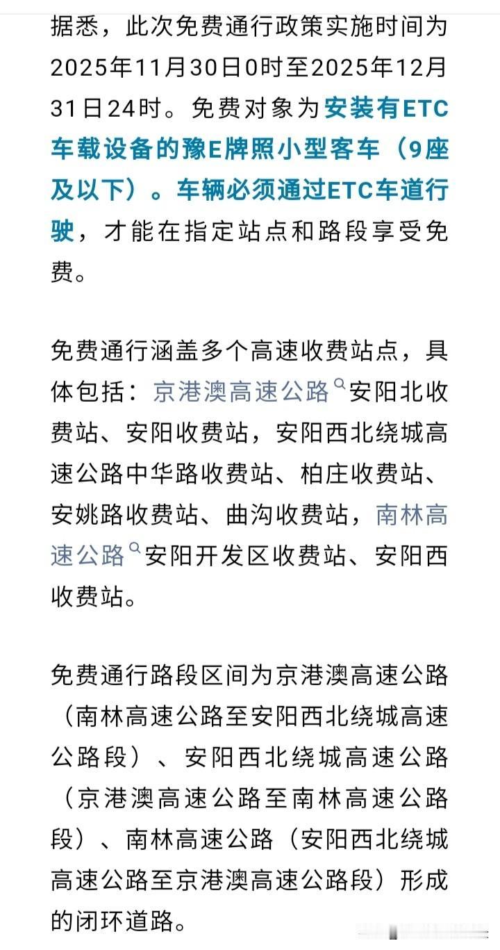 还得是河南实在,在继郑州、开封、洛阳以及南阳后,安阳也开始对绕城高速开始有选择性的免费通行了,虽然这几个免费的城市只是针对本城市车牌号外加在指定的高速路口进行进出才能享受到这种免费,但有总比没有强,如果经常走绕城高速的那一个月可以省不少过路费。 在这几个免费的城市中,郑州绕城高速免费通行覆盖范围比较广,而且还把开封车牌给包括在内了,郑州真的没有拿开封当外人啊,就连许昌车牌在郑州都不能免费,但开封做到了。