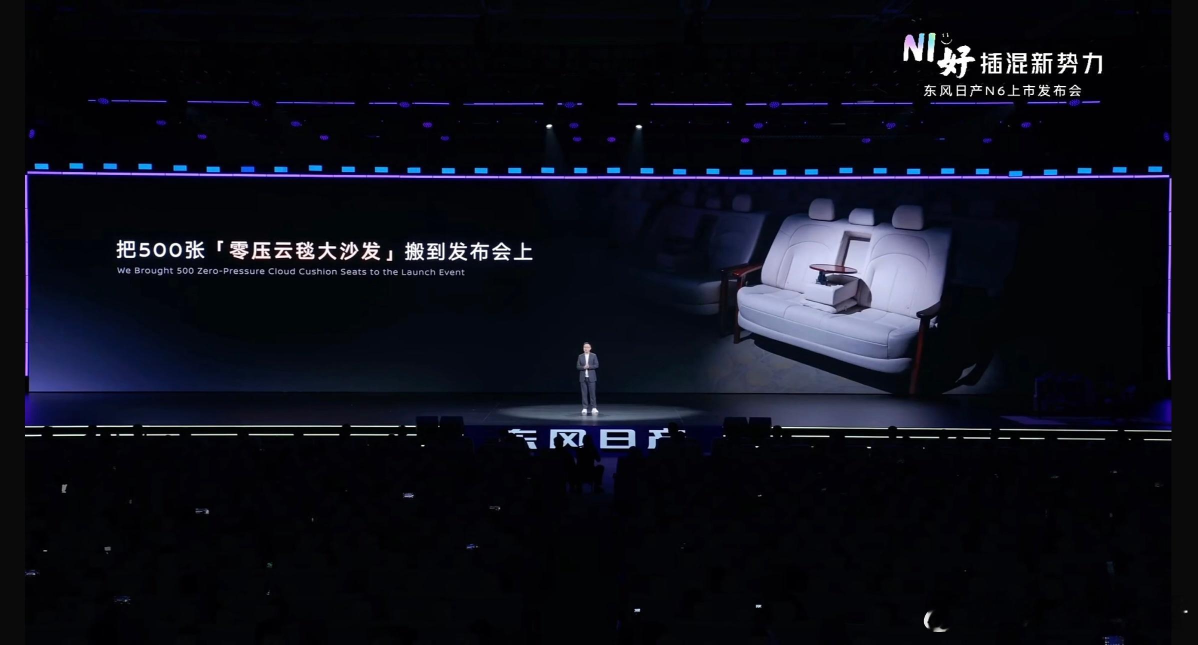 线上看了一下日产N6上市的直播,从N7、广州车展的天籁到今晚的N6,感觉东风日产管理层确实沉下心来仔细研究产品、技术和新能源打法,并学以致用,同时还保留自己的强项,例如不断强调自己是“央企合资”的品质保障,给予客户购买信心。从N7开始,东风日产就把“大沙发”的卖点阐述的淋漓尽致,今晚更是把500个“零压云毯大沙发”搬到了发布会现场,让媒体老师“躺平”式、舒舒服服参加发布会,更加鲜活的阐述了N6的舒适性。发布会还有一点印象深刻,那就是“行业首次侧碰后陡坡跌落试验”,两车相撞之后翻滚下陡坡过程中,气囊及时弹出、车辆整体架构基本无损、车门轻松打开、救援电话及时接通,都保障了事故发生后乘客的安全与救援工作的技术开展,也是大厂实力的体现。对于插混的技术痛点,东风日产也针对性的开发了智控技术,保障了高速行驶的安全与平稳性。同时,东风日产与Momenta合作,采用一段式端到端智能辅助驾驶技术,补足了传统车企智能化的短板!价格上此次也很有诚意,20度以上的电池续航超过180公里,上市权益价9.19万起步,确实是3-4口之家日常出行的合适之选!合资车企,包括广丰、上海通用到东风日产,逐步摸索到新能源的打法:产品定义、技术路线、定价、营销,都在潜心学习之后融会贯通,找到了适合自己、符合市场的方法,也可以说是合资车企的初步反攻,这会让市场更精彩、让客户更多选择,是一件大好事!大v聊车大电池超舒适插混N6售9.19万起