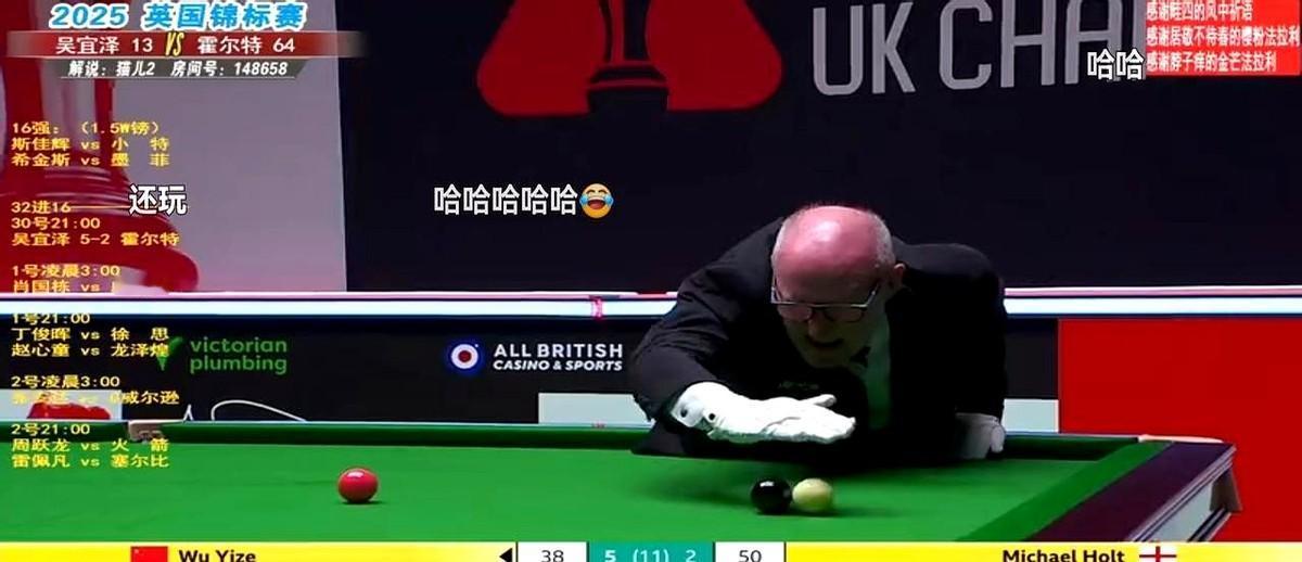 斯诺克史上最和谐搞笑的一幕。 在英锦赛上,我国小将吴宜泽与裁判就是否贴球发生争