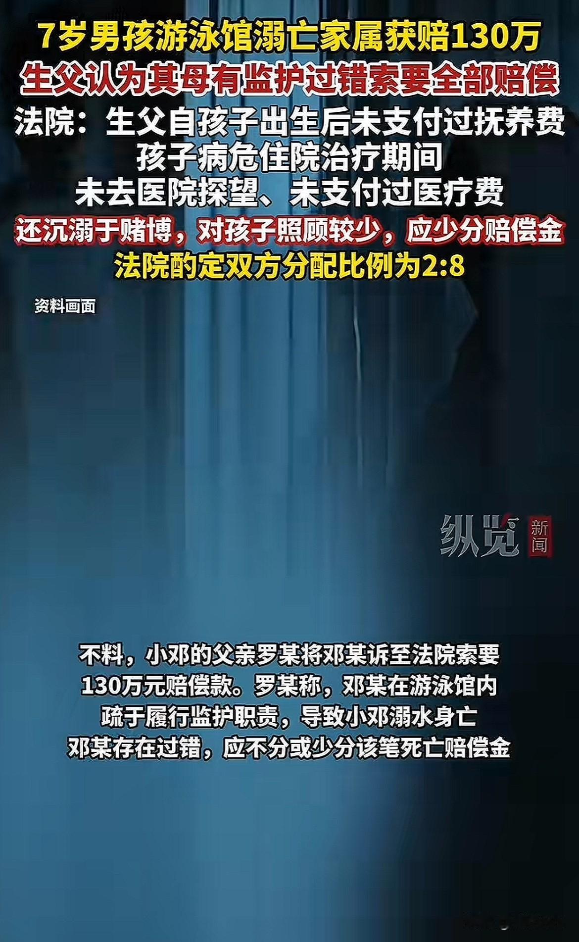 湖南衡阳,7岁男童随母亲到游泳馆游泳时意外溺亡,事后家属与游泳馆协商和解,获赔130万元。没成想,男童父亲竟将孩子母亲诉至法院,主张独占这笔赔偿款,理由是认为孩子母亲未尽监护职责、对孩子溺亡存在过错,要求母亲少分,甚至不愿意给死亡赔偿金。面对诉求,孩子母亲提交相关证据佐证自身情况,法院最终作出判决。 2024年暑假,邓某特意把7岁的儿子小邓从老家父母身边接到自己工作的城市,想趁着假期多陪陪孩子。 8月8号晚上,邓某带儿子去游泳馆游泳,可谁也没料到,孩子在水中玩耍时突然发生溺水意外,即便紧急抢救,最终还是没能留住小邓的生命。 噩耗传来后,邓某第一时间联系了早已和自己分手的孩子父亲罗某。 事后经过协商,游泳馆所属公司与小邓的父母达成和解,一次性赔偿家属,各类损失共计130多万元,赔偿款很快打到了邓某的银行账户上。 可这笔钱刚到账,罗某就跳出来反对,声称邓某作为孩子的监护人没尽到看管责任,没资格独占赔偿金。 这话彻底惹火了邓某,她当场反驳:“孩子长到7岁,你一天没养过,一分抚养费没给过,现在还好意思来要赔偿金,良心过得去吗?” 两人各执一词争执不下,罗某一气之下直接把邓某告上法庭,主张小邓的全部死亡赔偿金都该归自己所有。 事情得从2015年说起,当时邓某和罗某都在广东打工,在枯燥的工厂生活相互慰藉,相识相恋后没办结婚登记就同居了。 2016年,邓某生下儿子小邓,此后孩子一直跟着邓某和外公外婆生活,户口也落在了邓某名下。 从孩子出生到离世,罗某从没支付过一分抚养费,小邓的所有生活开销全靠邓某和外公外婆承担。 邓某和罗某的感情一直不稳定,分分合合像过家家似的。 罗某开货车赚钱不算少,有赌博的恶习,日子过得紧巴巴。 这些年里,他只在和邓某短暂同居时,接小邓去过一次暑假,后来也只去外婆家看过孩子一两次,完全没尽到做父亲的责任。 2021年,邓某又生下一个女儿,女儿跟着罗某姓,户口落在罗某名下,由罗某抚养。 2022年,两人决定正式分手,之后罗某就彻底失联,别说给小邓抚养费,就连一次探望都没有过。 更让人寒心的是,2016年,小邓曾经重病住院,当时医院都下了病危通知,邓某急得团团转,多次联系罗某,可他不仅没去医院看孩子一眼,连一分钱医药费都没拿出来。 如今,孩子不幸溺亡,罗某倒打一耙,指责邓某监护失职,还想独占赔偿金。 庭审时,小邓的外公、外婆也提交了相关证明,证实孩子生前一直由他们和女儿邓某共同抚养,主张赔偿金应有他们的份额。 法院审理后认为,邓某和罗某作为小邓的亲生父母,均有权参与赔偿金分配,但分配比例需结合双方对孩子的抚养付出、情感联结等实际情况判定。 小邓自从出生到离世,始终由邓某及父母照顾,所有抚养开销也由他们承担。 邓某一家对孩子的付出更多,孩子离世后承受的精神打击也更大,理应多分赔偿金。 而罗某虽为孩子父亲,却多年未履行抚养义务,既不支付抚养费,分手后也从未探望孩子。 甚至,孩子病危时都置之不理,对孩子的情感联结薄弱,应少分赔偿金。 罗某当庭辩解,称不是不想抚养孩子,而是邓某父母强行让孩子随母姓,所以才该由邓家抚养。 法院当场驳回了这一说法,明确指出无论孩子随父姓还是母姓,父母对未成年子女的抚养义务都是法定的,不能以此为由推脱责任。 对于罗某指责邓某疏于监护导致孩子溺亡的说法,法院认为邓某虽有一定过失,但并非故意,且孩子长期随母亲生活,邓某所受的精神伤害远大于罗某,因此对罗某的主张不予支持。 根据《民法典》第1127条规定,遗产第一顺序继承人包括配偶、子女、父母,死亡赔偿金虽不属于遗产,但分配原则参照法定继承执行,小邓的父母作为第一顺序继承人,均享有分配权。 《民法典》第1058条规定,夫妻双方平等享有对未成年子女抚养、教育和保护的权利,共同承担相应义务,罗某即便与邓某分手,也不能免除抚养责任。 最终,法院按照权利义务对等原则,一审判决小邓的死亡赔偿金由邓某分得80%,共计1010177.68元,罗某分得20%,即252544.42元,双方分配比例为8:2。 罗某不服,一审判决提起上诉,二审法院审理后驳回上诉,维持原判。 由此可见,生而不养并非无关紧要,法律从不支持“只享权利不担义务”。 即便身为亲生父母,长期不履行责任,在涉及孩子相关权益分配时,自身权利也会相应打折,这既是对付出者的公平,也是对未尽义务者的合理约束。 对此,您有什么话想说?