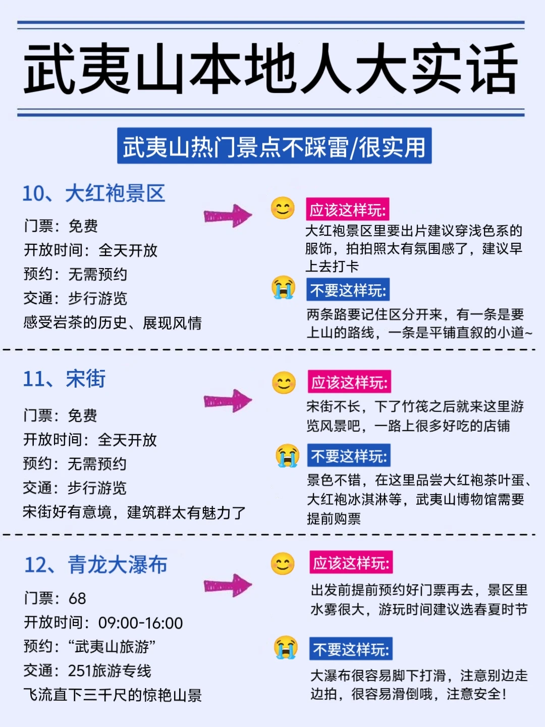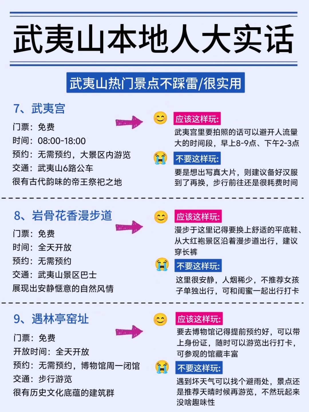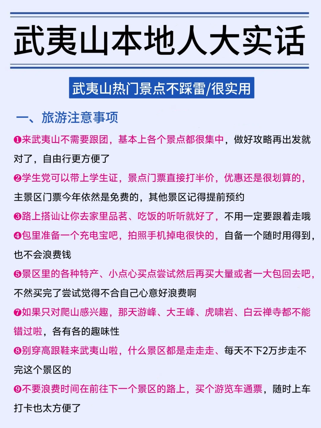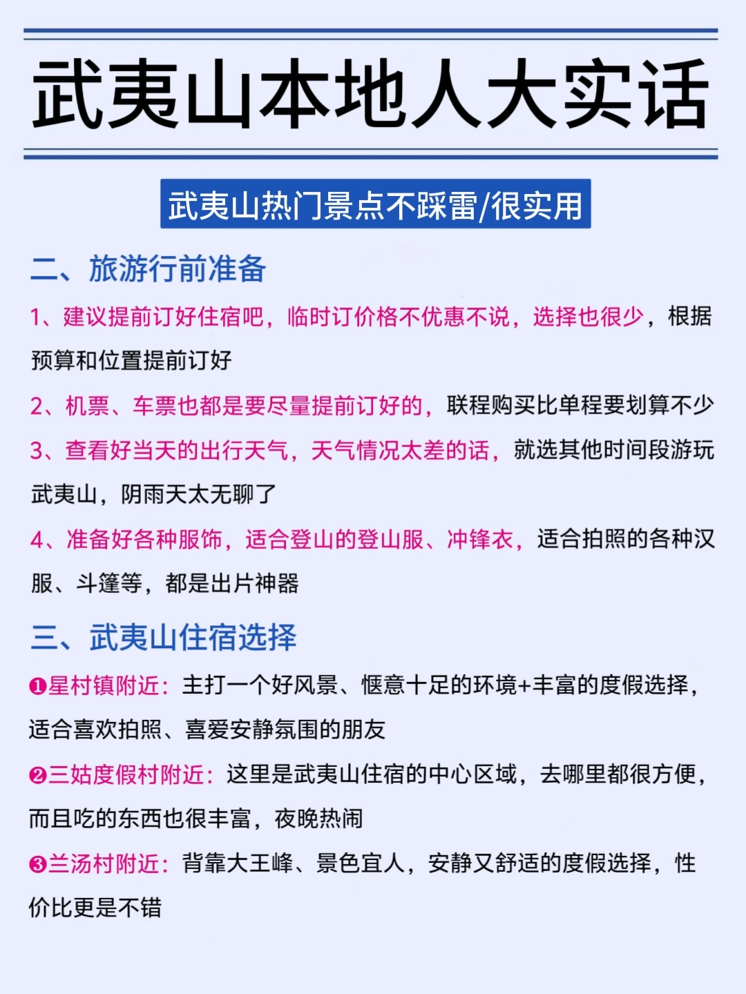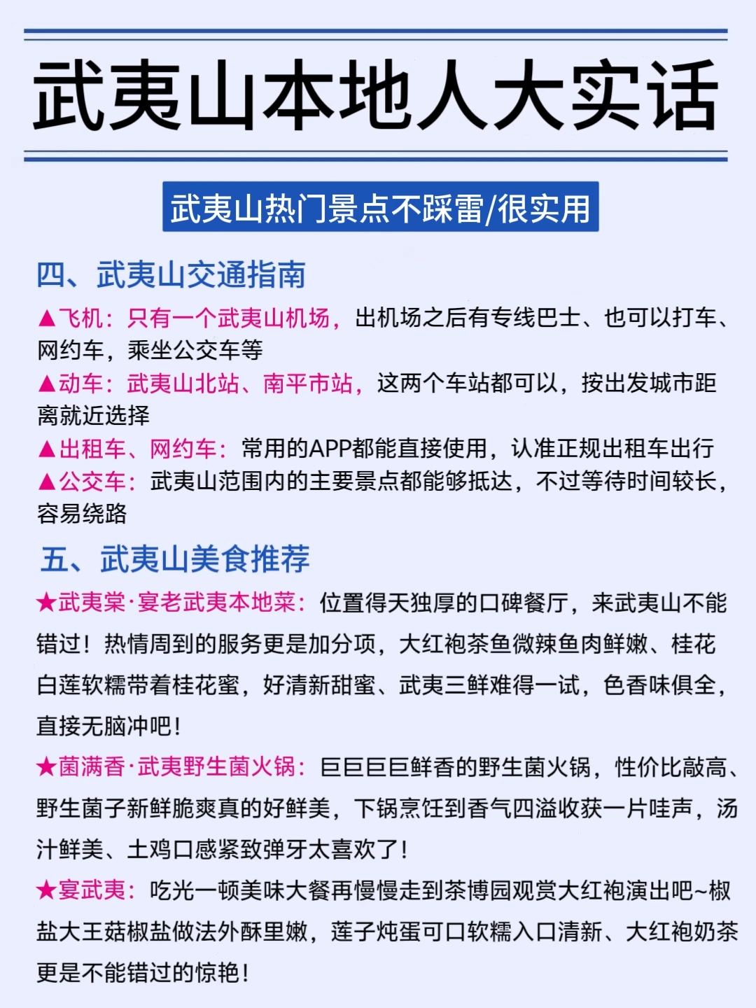 请大数据推给👉想来武夷山的姐妹们! 承认吧,武夷山做好攻略真的很好玩~~~ 这份不交智商税的攻略码住 做好了攻略再出发啊!避免绕弯踩雷! · 🚶‍♀️武夷山住宿选择 📍星村镇附近:主打一个好风景、惬意十足的环境+丰富的度假选择,适合喜欢拍照、喜爱安静氛围的朋友 📍三姑度假村附近:这里是武夷山住宿的中心区域,去哪里都很方便,而且吃的东西也很丰富,夜晚热闹 📍兰汤村附近:背靠大王峰、景色宜人,安静又舒适的度假选择,性价比更是不错 · 🚶‍♀️武夷山交通指南 ⚠️飞机:只有一个武夷山机场,出机场之后有专线巴士、也可以打车、网约车,乘坐公交车等 ⚠️动车:武夷山北站、南平市站,这两个车站都可以,按出发城市距离就近选择 ⚠️出租车、网约车:常用的APP都能直接使用,认准正规出租车出行吧 ⚠️公交车:武夷山范围内的主要景点都能够抵达,不过等待时间较长,容易绕路 · ▪️武夷山美食推荐 ▪️武夷棠·宴老武夷本地菜:位置得天独厚的口碑餐厅,来武夷山不能错过!热情周到的服务更是加分项,大红袍茶鱼微辣鱼肉鲜嫩、桂花白莲软糯带着桂花蜜,好清新甜蜜、武夷三鲜难得一试,色香味俱全,直接无脑冲吧! ▪️菌满香·武夷野生菌火锅:巨巨巨巨鲜香的野生菌火锅,性价比敲高、野生菌子新鲜脆爽真的好鲜美,下锅烹饪到香气四溢收获一片哇声,汤汁鲜美、土鸡口感紧致弹牙太喜欢了! ▪️宴武夷:吃光一顿美味大餐再慢慢走到茶博园观赏大红袍演出吧~椒盐大王菇椒盐做法外酥里嫩,莲子炖蛋可口软糯入口清新、大红袍奶茶更是不能错过的惊艳! -
