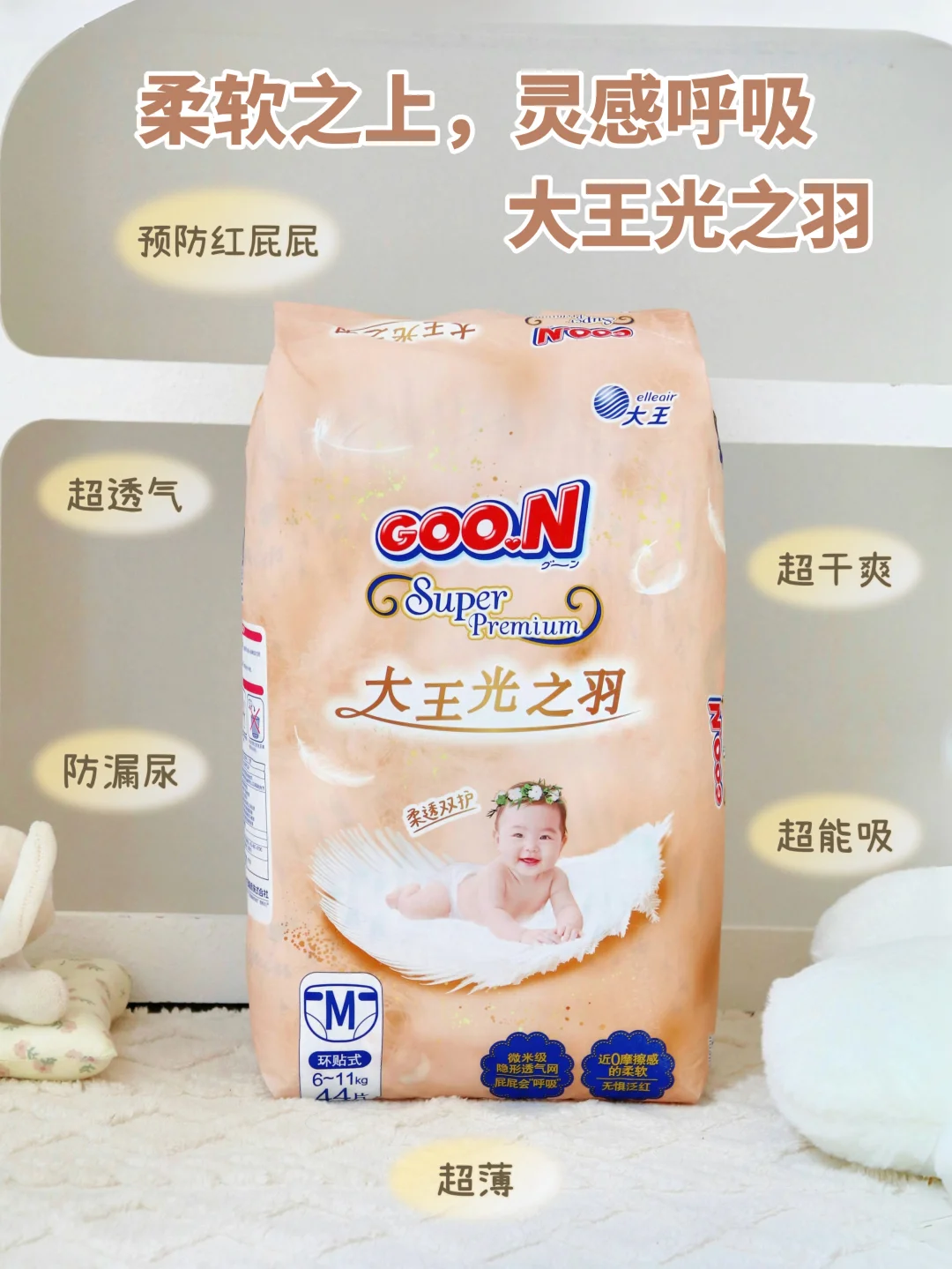 作为一个拥有3个月龙凤胎的新手妈妈,我真的被红屁屁折磨怕了!😭😭\n还记得上个月,哥哥的小屁屁突然红得像小番茄,妹妹的大腿根也磨出了小红点,两个宝宝一起哭得撕心裂肺,我急得直掉眼泪……后来才知道,😱夏天闷热+纸尿裤摩擦,就是红屁屁的罪魁祸首,而要想红pp成功上岸,还得看这3点~\n✅纸尿裤材质✅透气性✅吸水性\n\t\n👩\u200d💻根据这个思路,我前前后后试了数十款纸尿裤,发现大王光之羽环贴式纸尿裤表现还不错!自从换上它,俩宝的屁屁再也没红过,连最怕热的哥哥都能安稳睡整觉了!今天就来给大家实际测评下,看看值不值得入手~\n\t\n☁️0.8D云柔纤维\n妹妹皮肤特别娇嫩,之前换纸尿裤总会磨出红印子。但这款的花瓣柔边腿围真的太软了!像棉花糖一样包裹着小胖腿,加上0.8D超细纤维,现在怎么翻身打滚都不会磨红~\n\t\n🌟微米级透气网+ 0.2cm超薄芯体\n带过娃的都知道,夏天最怕纸尿裤闷出痱子!尤其是像我家这种一次要换俩的,稍微不透气就完蛋……但这款纸尿裤每平方米居然有百亿个微米级透氧微孔!就像给屁屁装了迷你空调,再搭配着0.2cm散热芯,现在俩宝爬来爬去也不会闷出汗,哥哥这种\"小火炉\"穿了一整天,小屁屁还是干干爽爽的~近0闷热感真的给光之羽做到了\n\t\n🌸3D立体珍珠纹压花\n这款纸尿裤表面3D立体珍珠纹压花,瞬间就能快速吸收尿液,均匀导流。尿液被牢牢锁在底层,小屁屁接触到的表面依然干爽,告别湿哒哒的黏腻感,宝宝怎么动都自在!\n\t\n👍超醒目尿湿显示带\n这简直是为新手爸妈量身定做的,纸尿裤上的尿湿显示带超级醒目,一旦宝宝尿尿,颜色立刻变化,一眼就能看到!不用再反复摸、反复猜,及时更换不拖延,省心又省力,轻松守护屁屁健康。\n\t\n⚠️告别红屁屁小tips:再好的纸尿裤也要勤换!我现在定闹钟2小时一换(毕竟俩娃的尿量太可怕),每次换之前都让屁屁\"晾晾风\",再薄薄涂一层护臀膏。\n\t\n🤔综合看下来,大王光之羽不论是材质还是透气性和吸收性都做得很不错,用了这套方法+大王光之羽,红屁屁终于远离我家俩小祖宗啦,妈妈们赶快安排上吧!\n\t\n