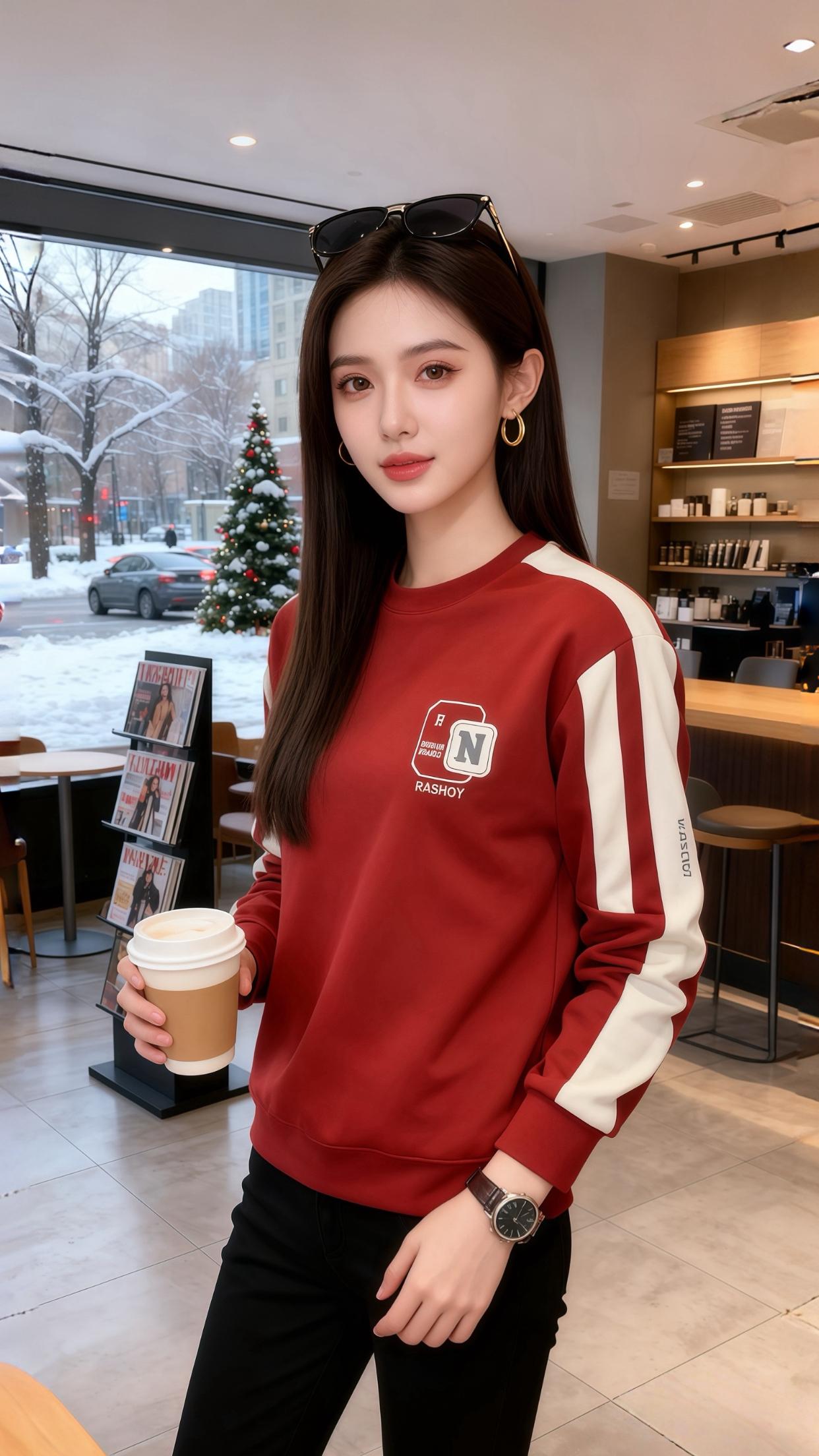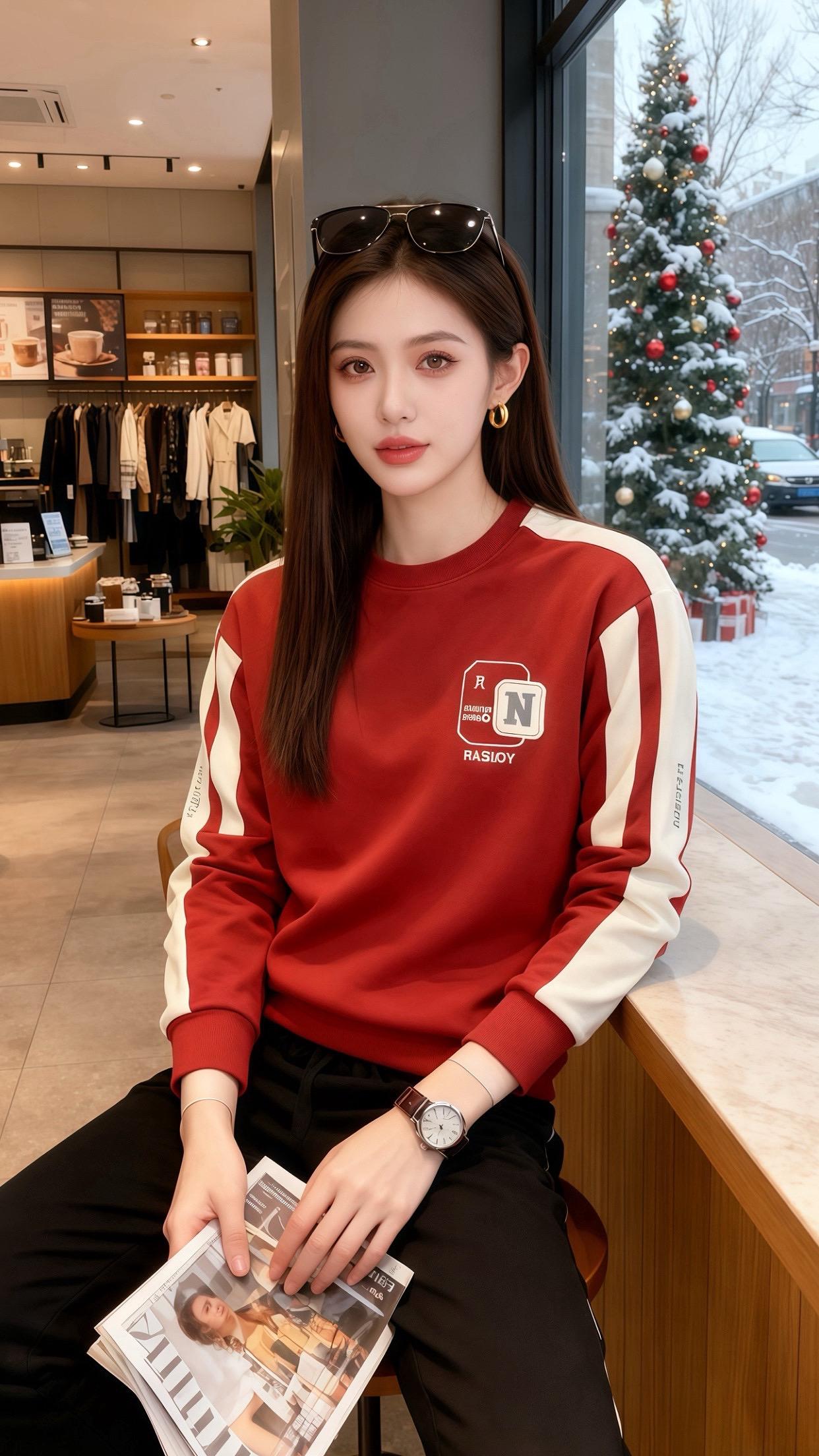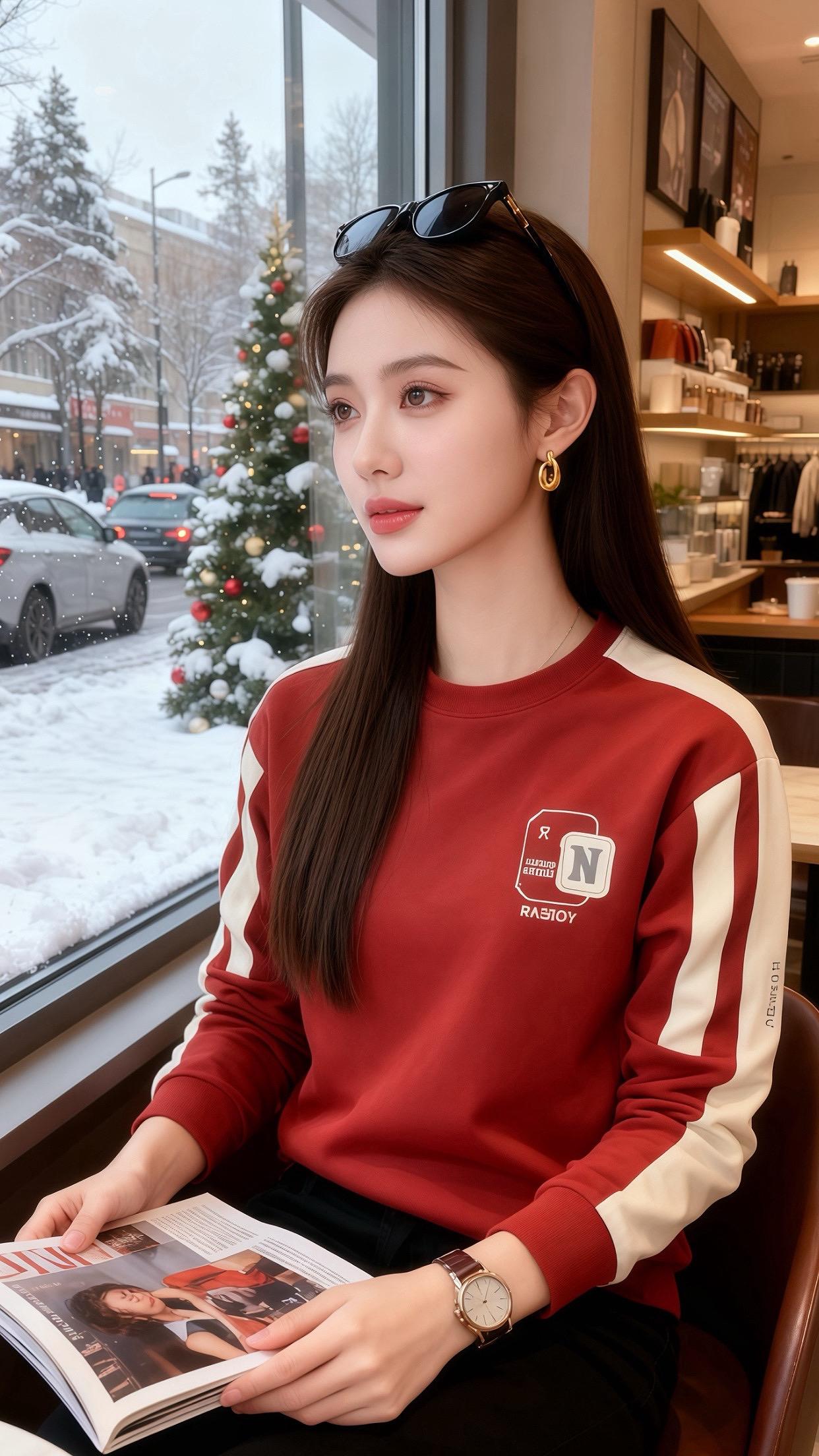 雪裹着圣诞松的甜香扑在橱窗时,她正蜷在咖啡厅软椅里翻杂志。酒红卫衣的白肩线像落雪擦过肩,松松裹着身,长发滑过领角,墨镜架在发顶,金环耳饰晃着暖光。