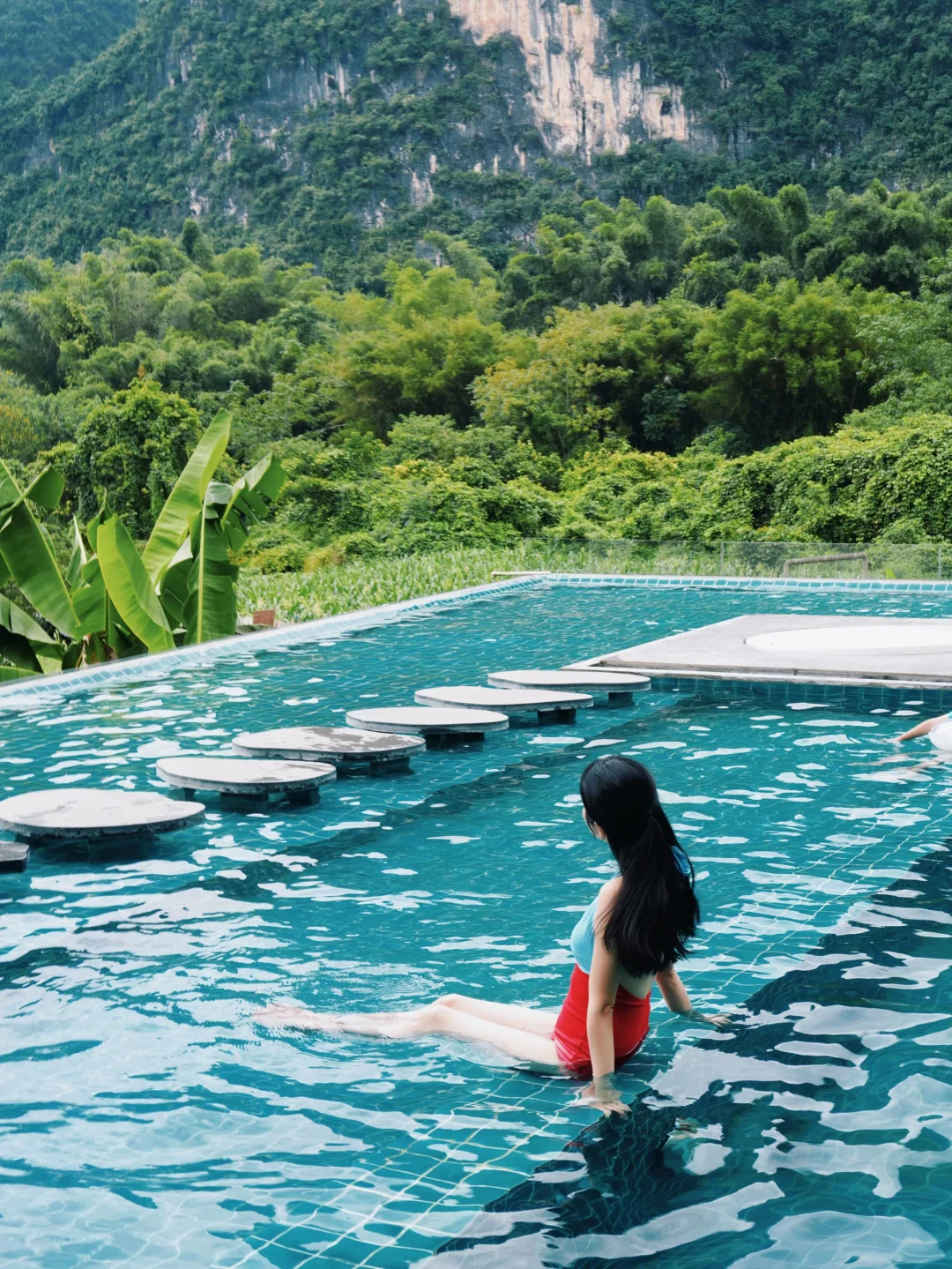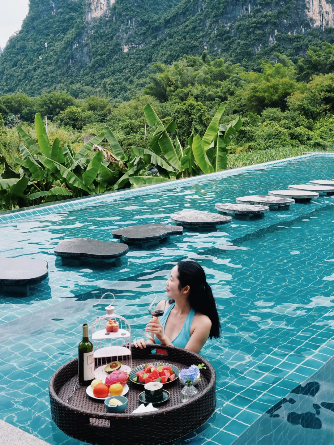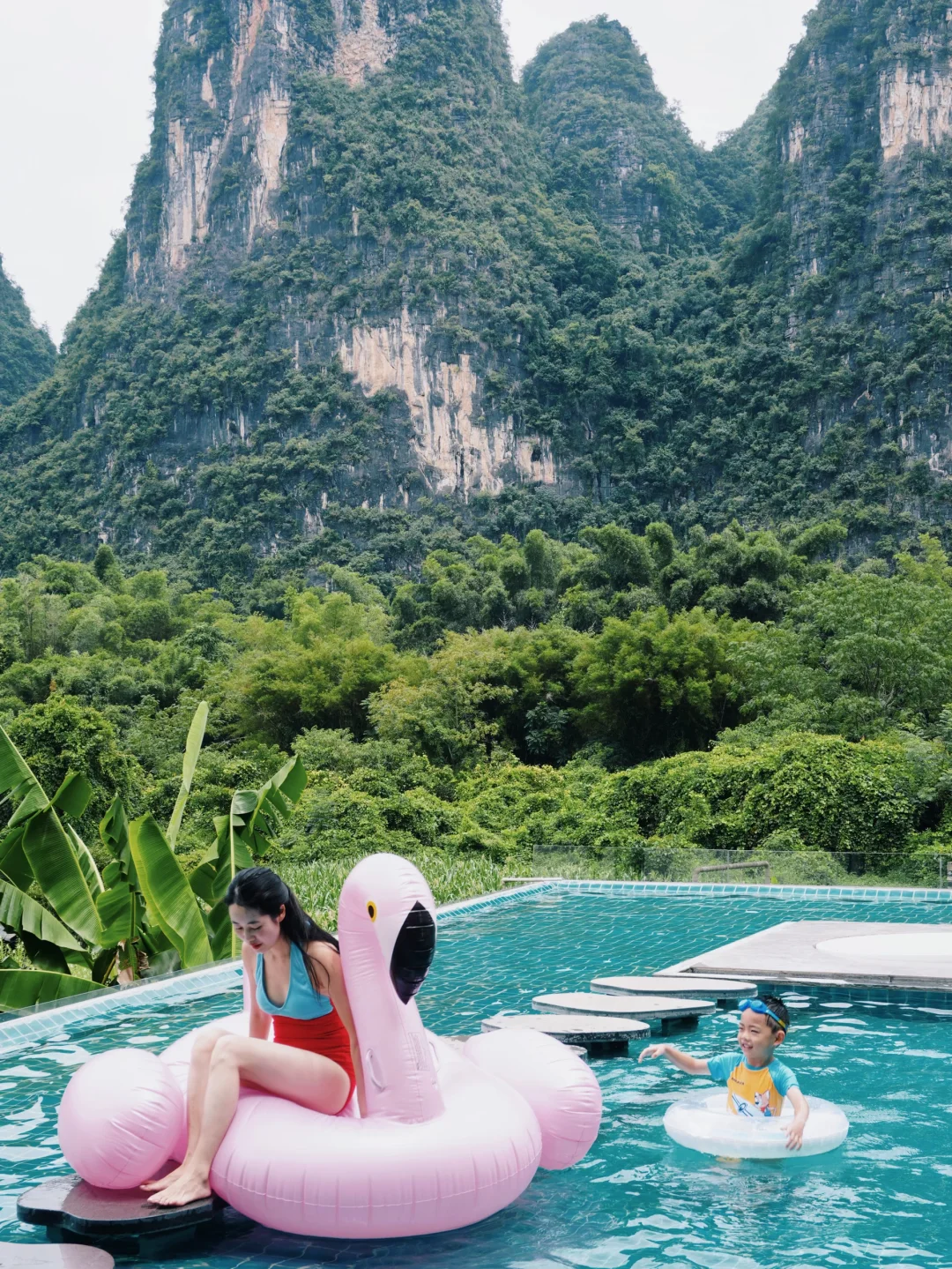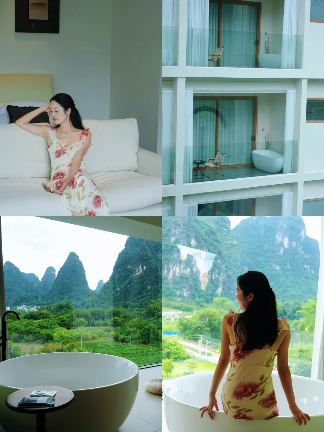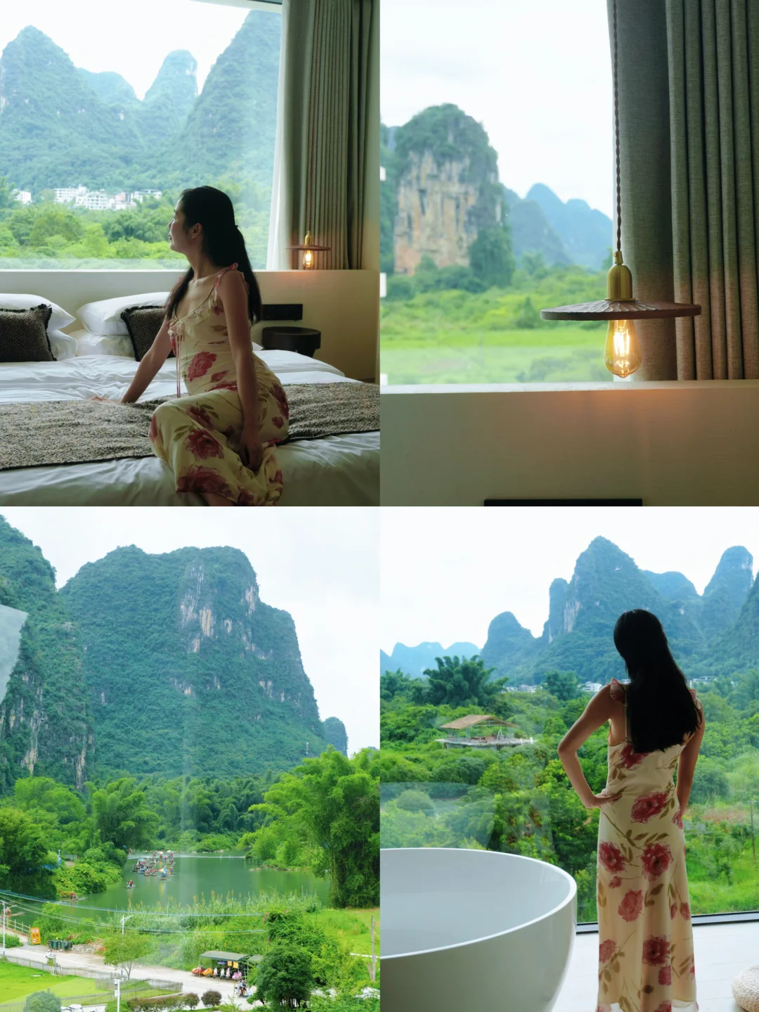 阳朔酒店卷王被我找到了!就在十里画廊精华段C位的,推窗就是水墨山水画🏞️,美哭! . ✨ 躺看山景房:超大落地窗,躺在床上都能独享喀斯特群峰,设计简约高级,床品超舒服! 💦 无边泳池封神! 正对无敌山景,水质超清!还有漂浮下午茶,记得提前订,在山水画里喝下午茶太绝了! . 📍阳朔高田镇竹蔸寨村(位置超好,遇龙河畔)