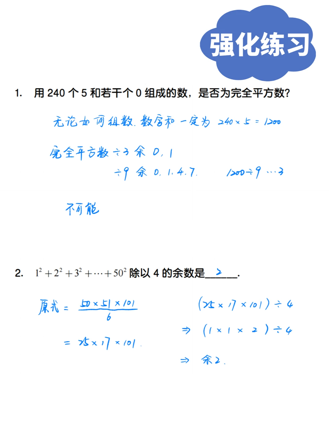 🌈小学四年级奥数:完全平方数巩固练习+强化训练+重庆小升初真题演练 👉上一篇:完全平方数(知识点复习),如果对这个知识点还有不懂的地方,前面有更新视频讲解。