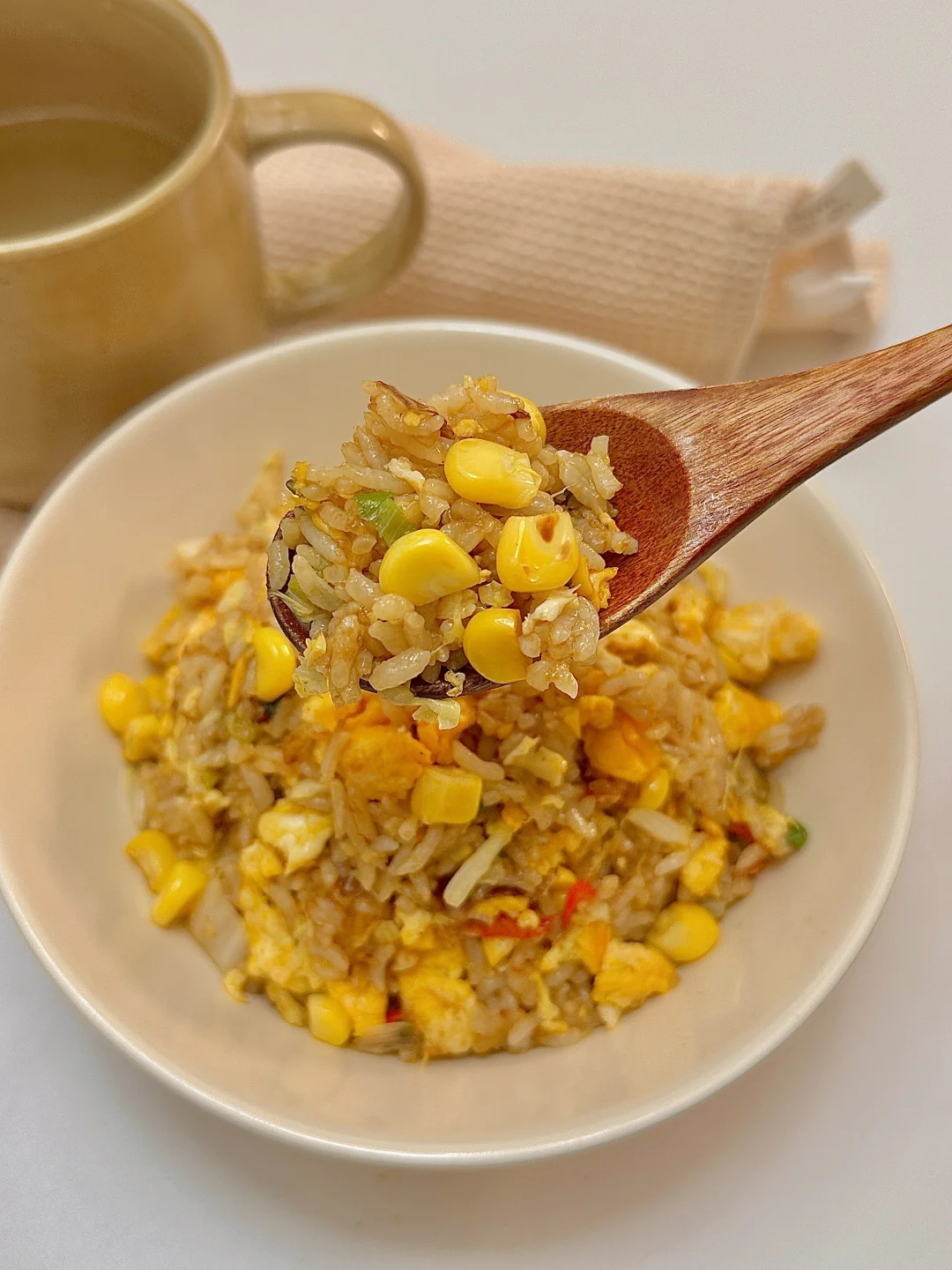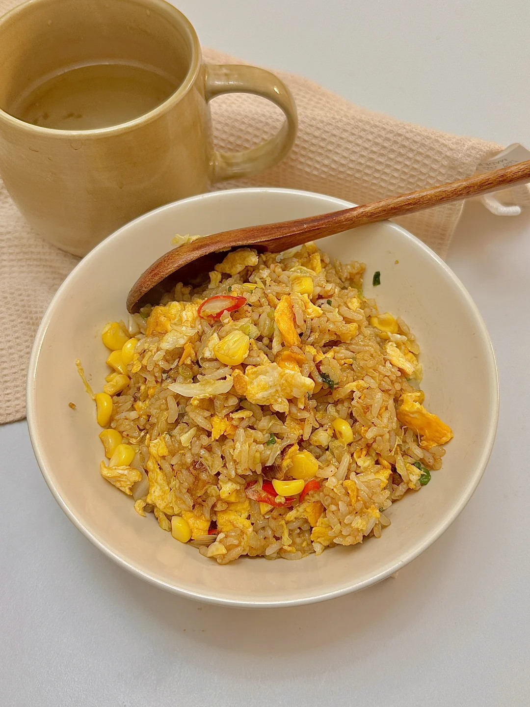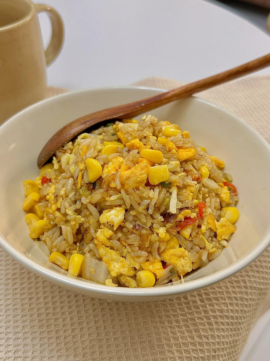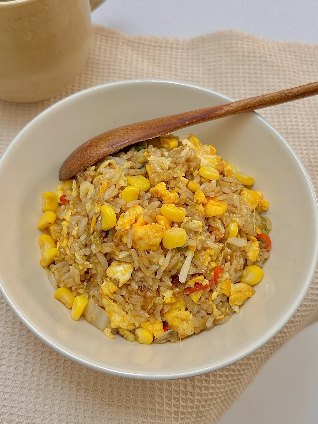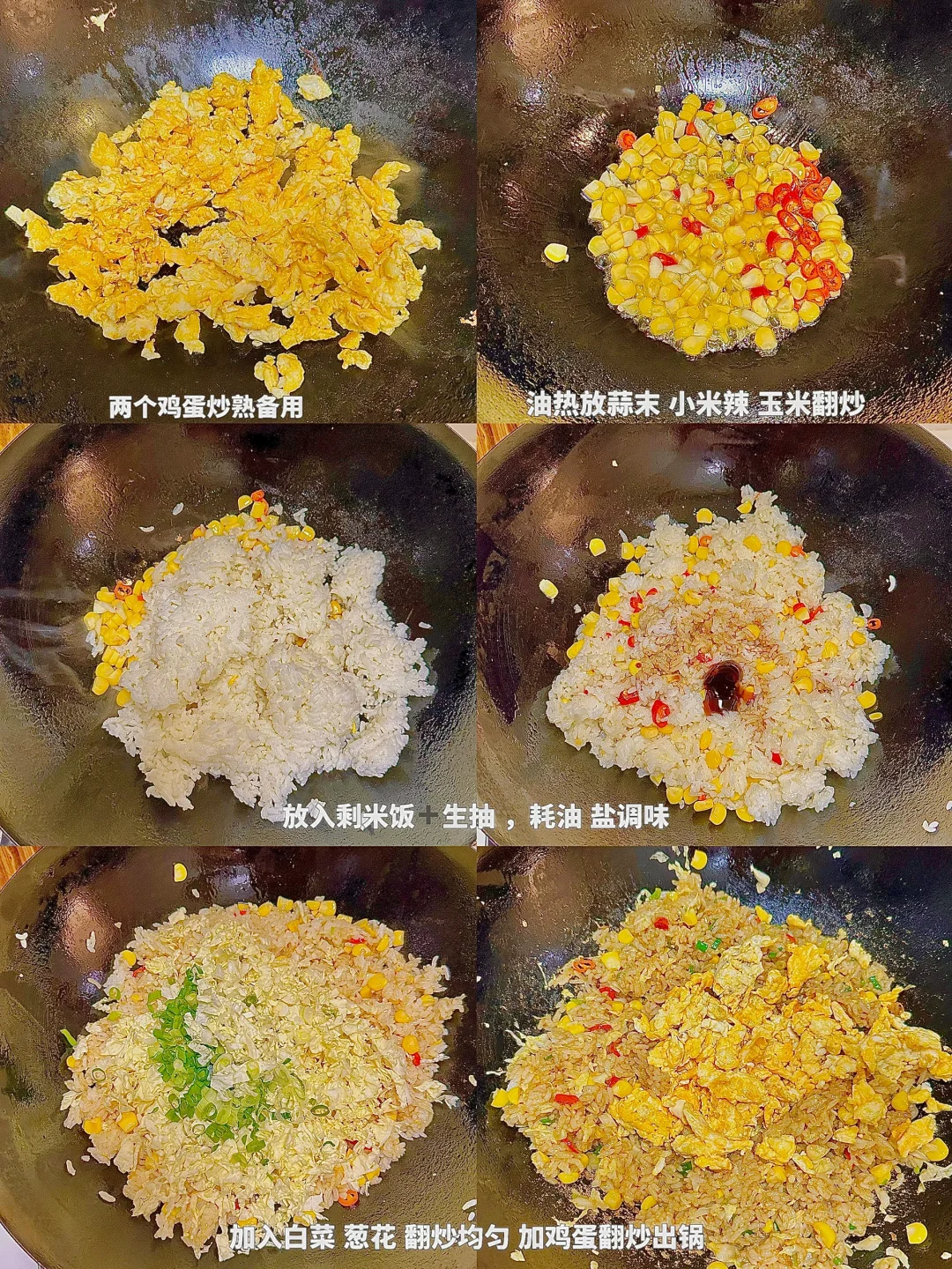 混合蔬菜和玉米粒炒的饭 清清爽爽,玉米好香甜 很妙的搭配,第一次这样炒 口感有被惊艳到,大家一定要试试这个炒饭! 🥬食材:玉米粒,鸡蛋,白菜,剩米饭,葱花,小米辣,蒜末 👩🏻🍳做法: 1️⃣两个鸡蛋炒熟备用 2️⃣油热放小米辣 蒜末 玉米粒翻炒 倒入米饭 ➕生抽,耗油,盐,鸡精调味 3️⃣小火把米饭炒匀散 加白菜 葱末 鸡蛋碎翻炒2分钟出锅