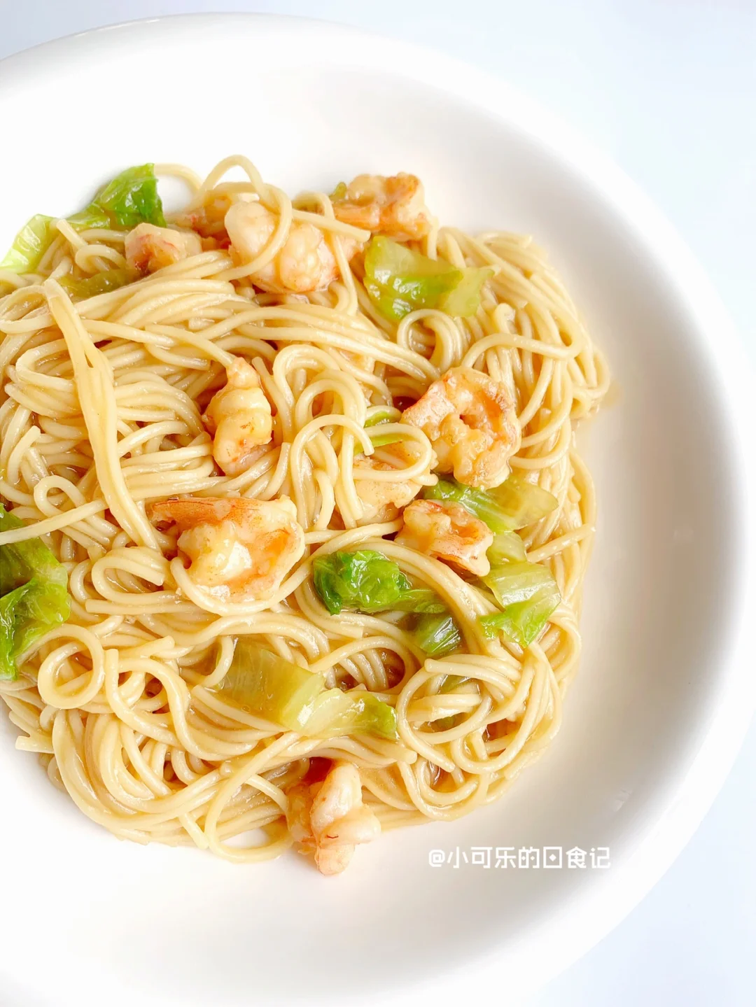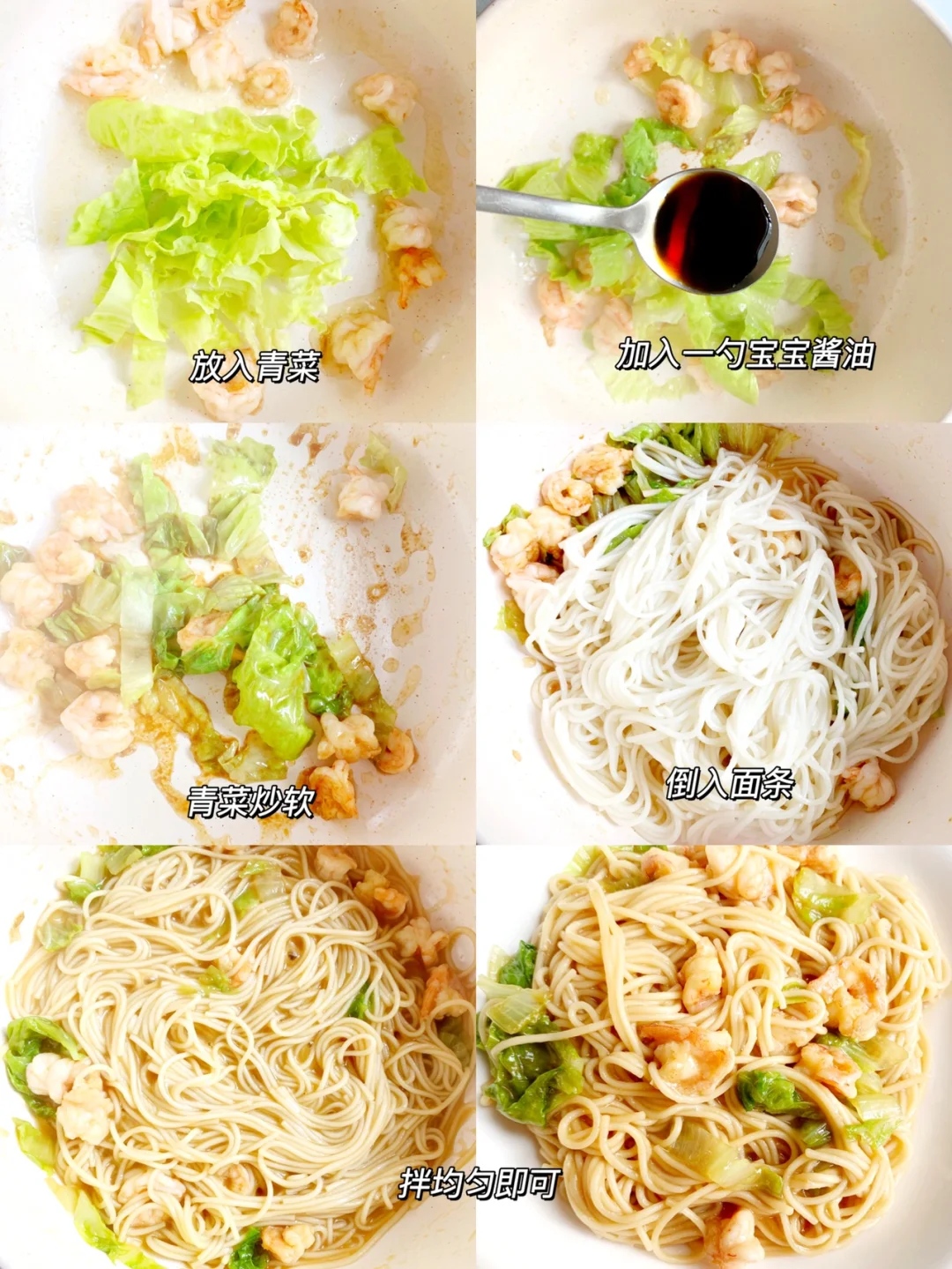 3⃣️锅里倒入油,油热后放入葱炒香,煎至焦黄捞出,放入虾仁翻炒变色,放入生菜加一勺酱油,倒入面条拌均匀即可