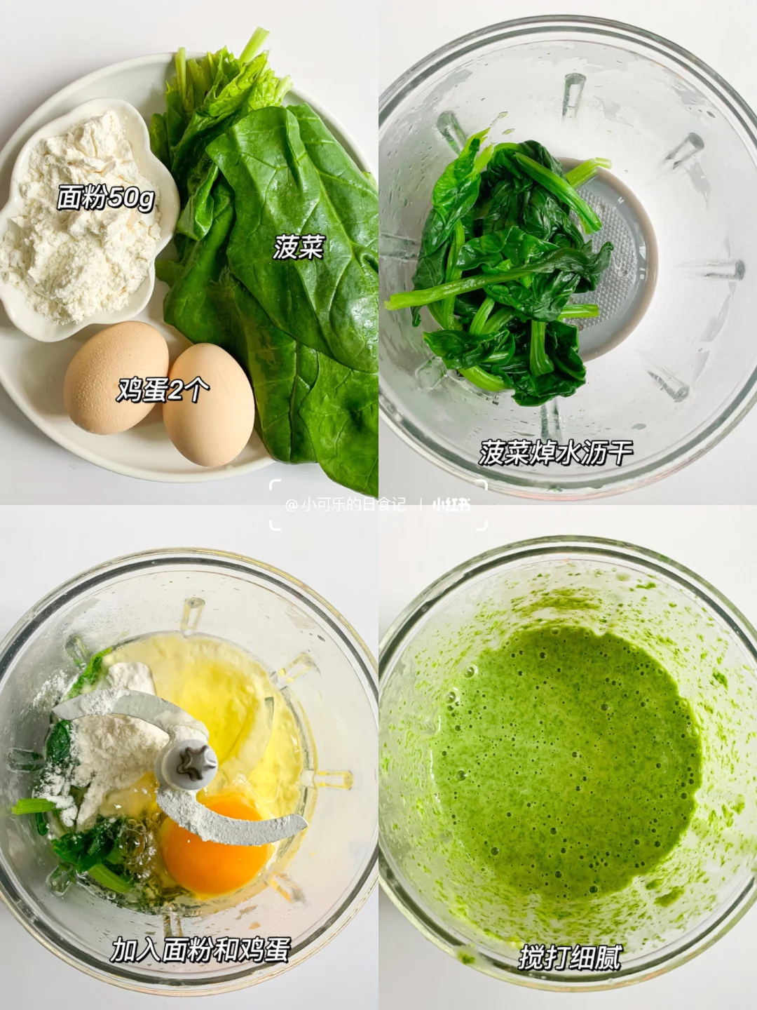 今天来分享春季补钙食谱啦 菠菜中就含有大量的维生素和膳食纤维钙和铁,做成鸡蛋饼,当作手指食物还可以帮助宝宝锻炼手指精细动作和抓握能力哦,营养补钙长高高[偷笑R] . 🌟食材: 鸡蛋两个 菠菜 中筋面粉50g . 🌟步骤: 1⃣️菠菜提前焯水后捏掉水分。 2⃣️焯过水的菠菜+鸡蛋+面粉放入辅食机,搅打成糊 状。 3⃣️平底不粘锅刷一层油,倒入适量面糊轻轻转动锅,使面糊均匀摊开。 4⃣️小火煎至面糊凝固后翻面关火,盖锅盖焖半分钟,营养好吃的的菠菜鸡蛋饼就做好啦~