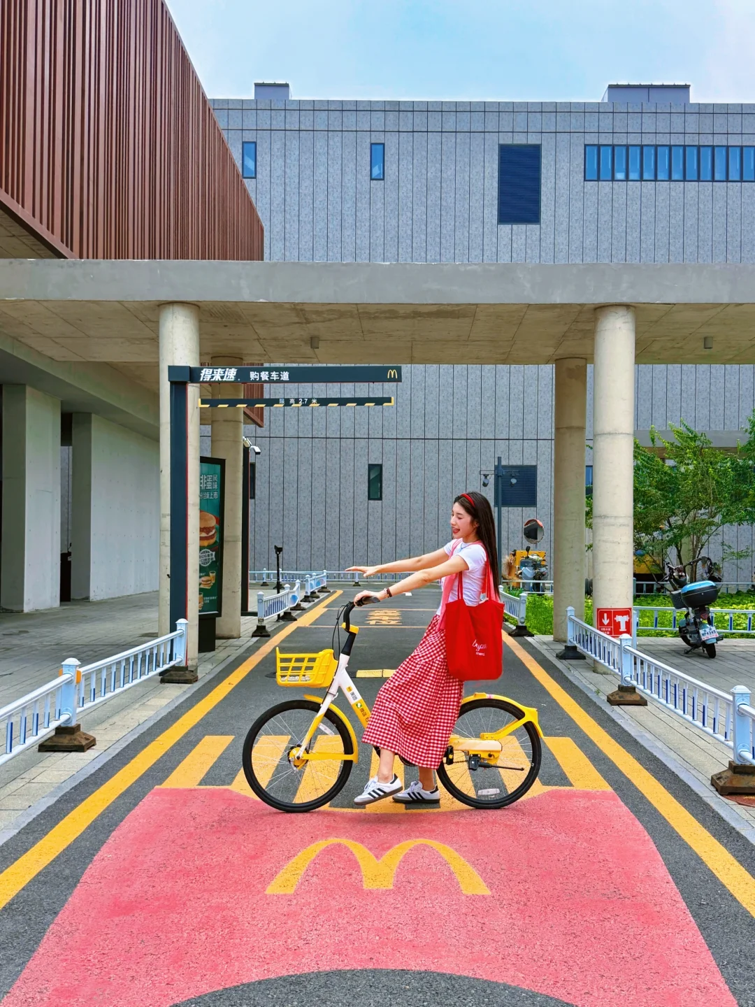 超出片的麦麦人行道,黄色共享单车作为拍照道具,超Chill🚴