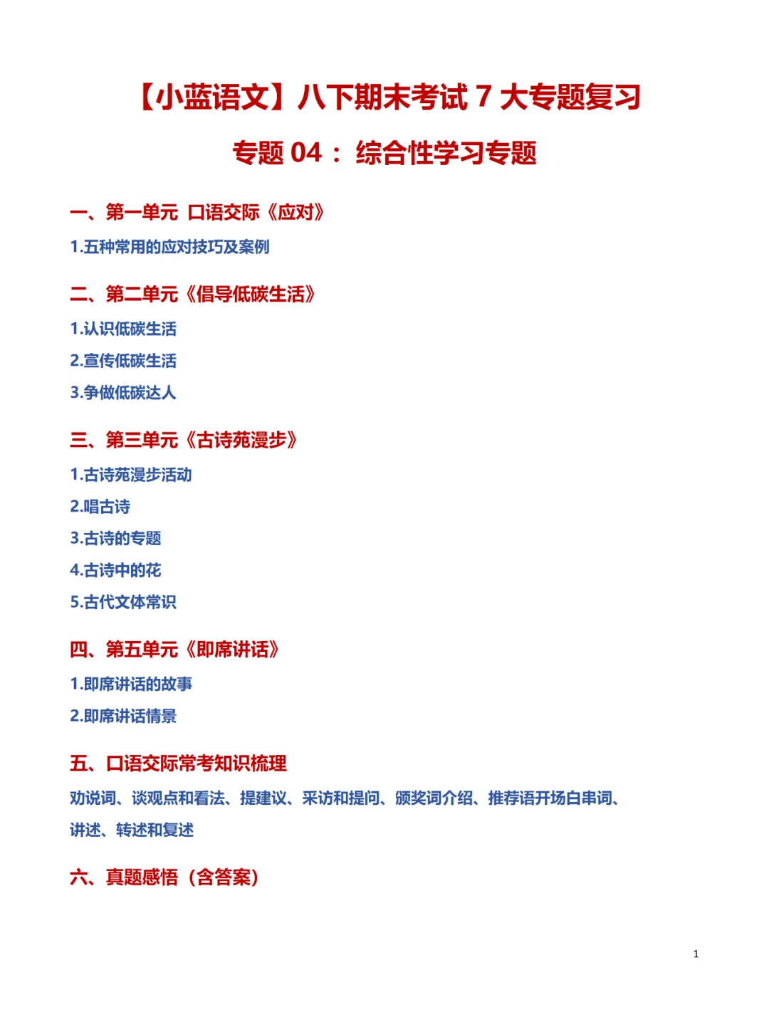 八年级下册语文期末考试,综合性学习板块复习要点: 第[一R]点:第一单元口语交际《应对》 · 第[二R]点:第二单元综合性学习《倡导低碳生活》 · 第[三R]点:第三单元综合性学习《古诗苑漫步》 · 第[四R]点:第五单元口语交际《即席讲话》 · 第[五R]点:劝说词、谈观点和看法、提建议、采访和提问、推荐语、开场白、串词.... · 第[六R]点:结合往年真题感悟考法,提前心里有数 ·